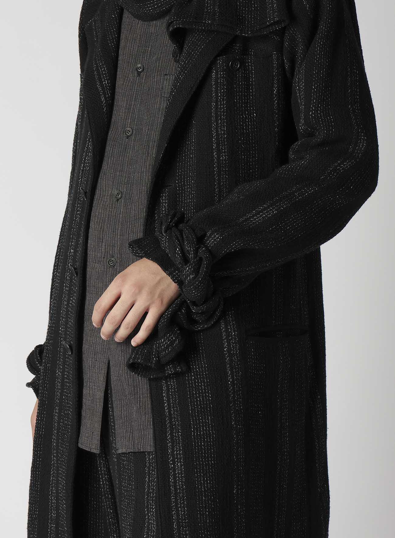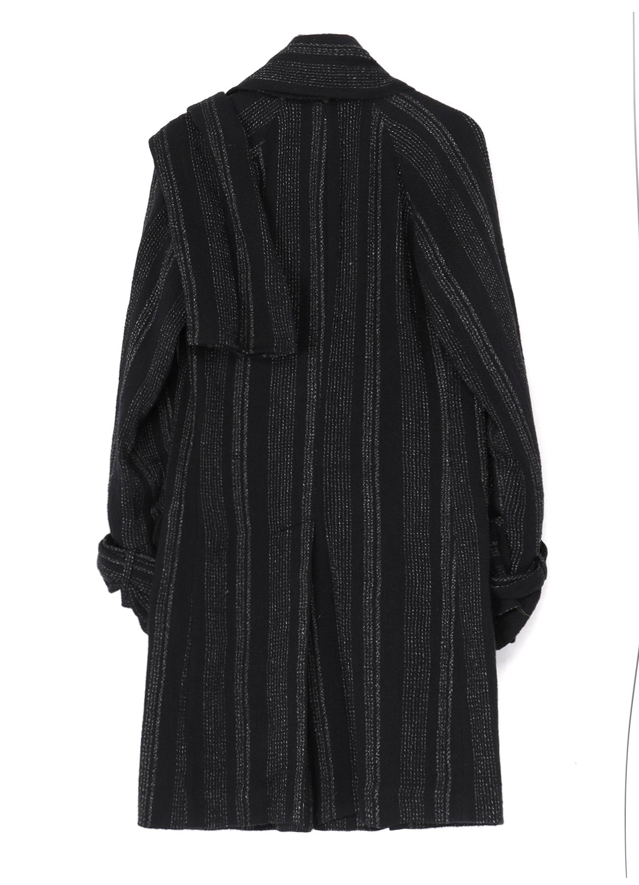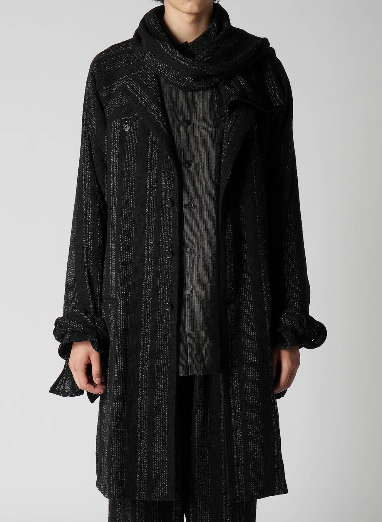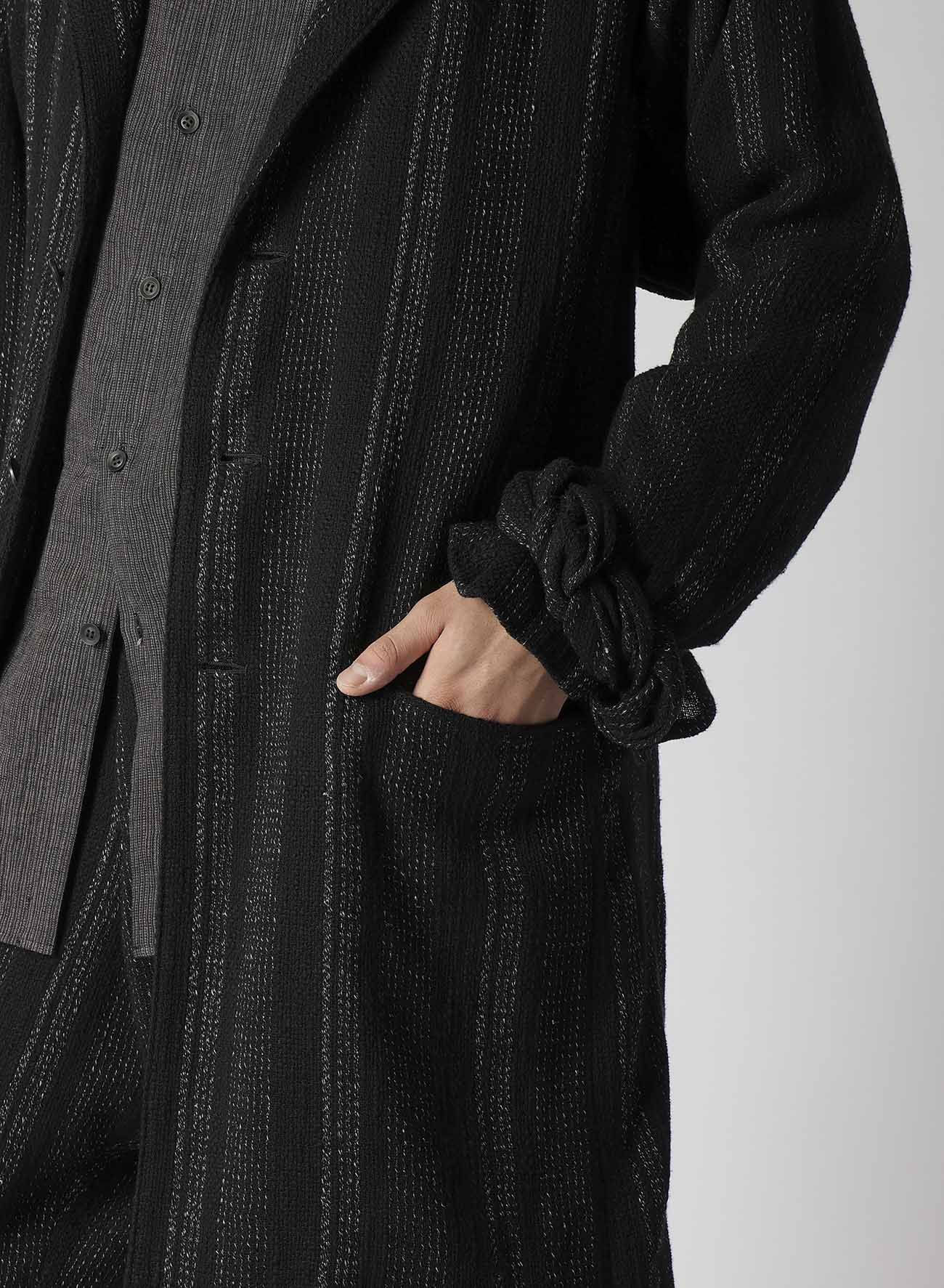 Esta chaqueta sin cuello de manga raglán y patrón a rayas de LOOK3 presenta una textura única, gracias al uso de hilo doble retorcido. El hilo, hecho de algodón grueso, resulta en irregularidades notables y variaciones de superficie distintas.