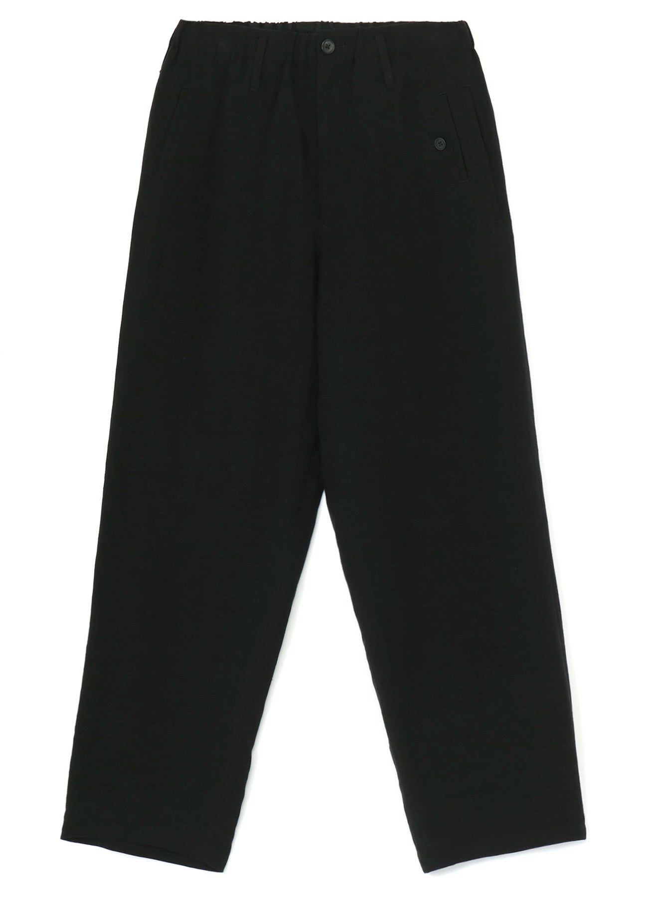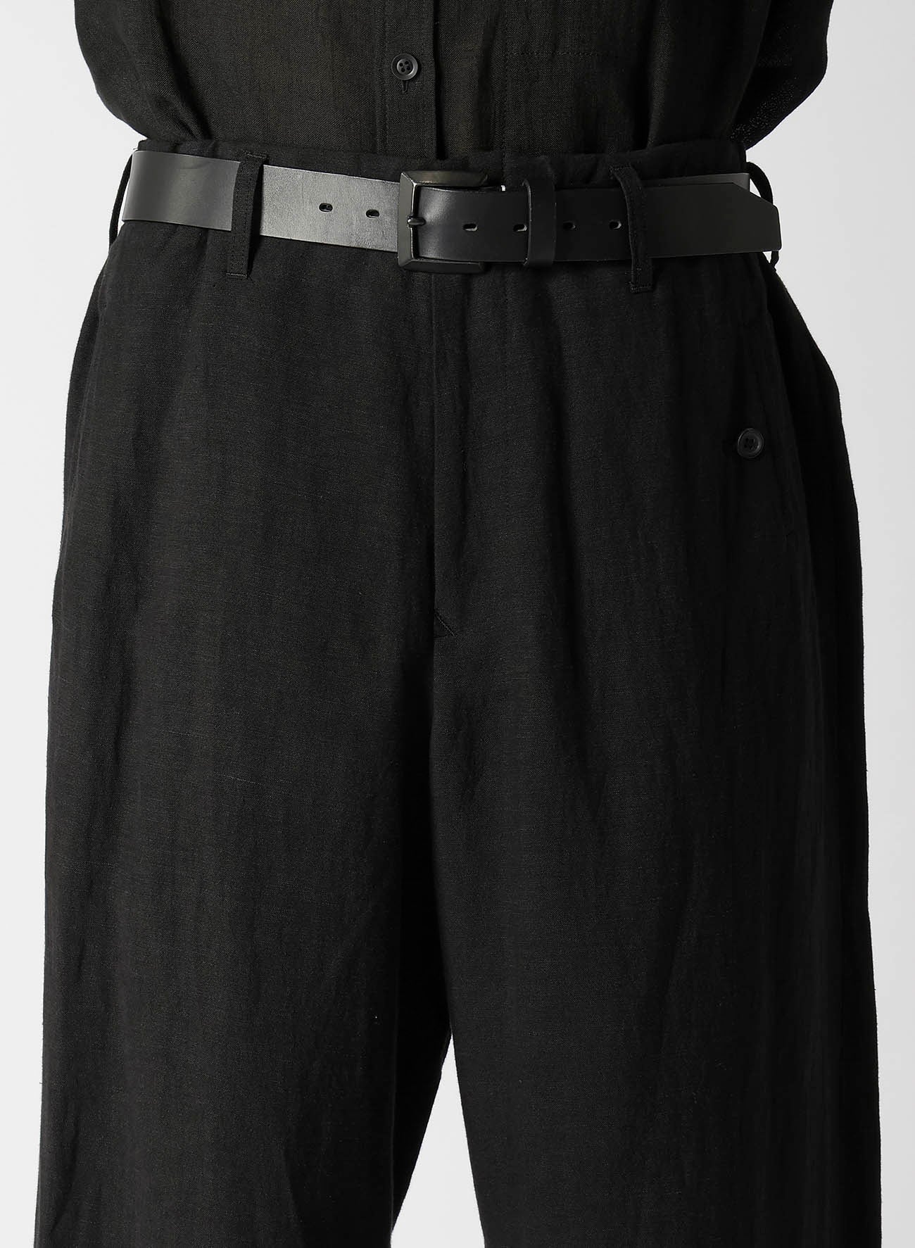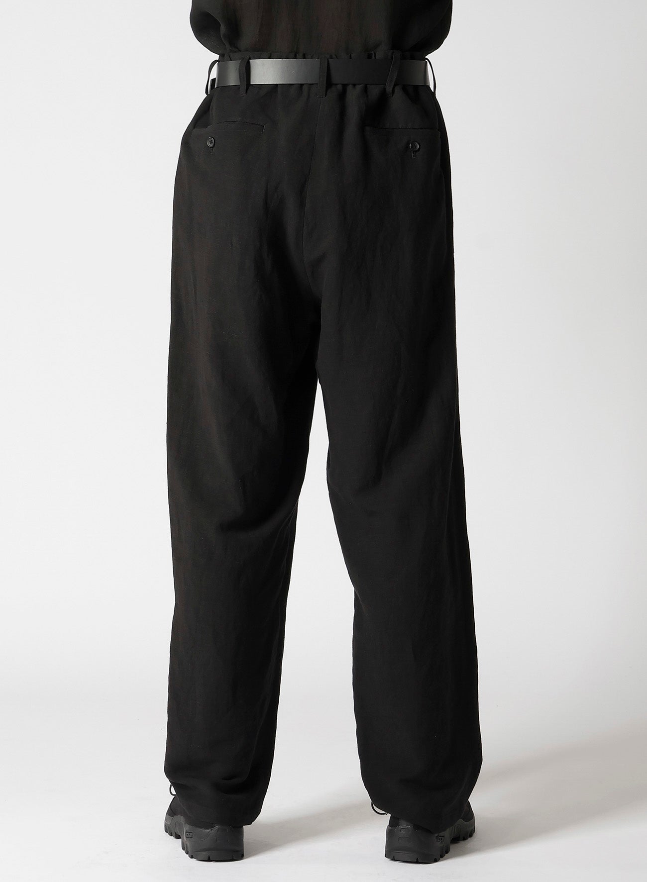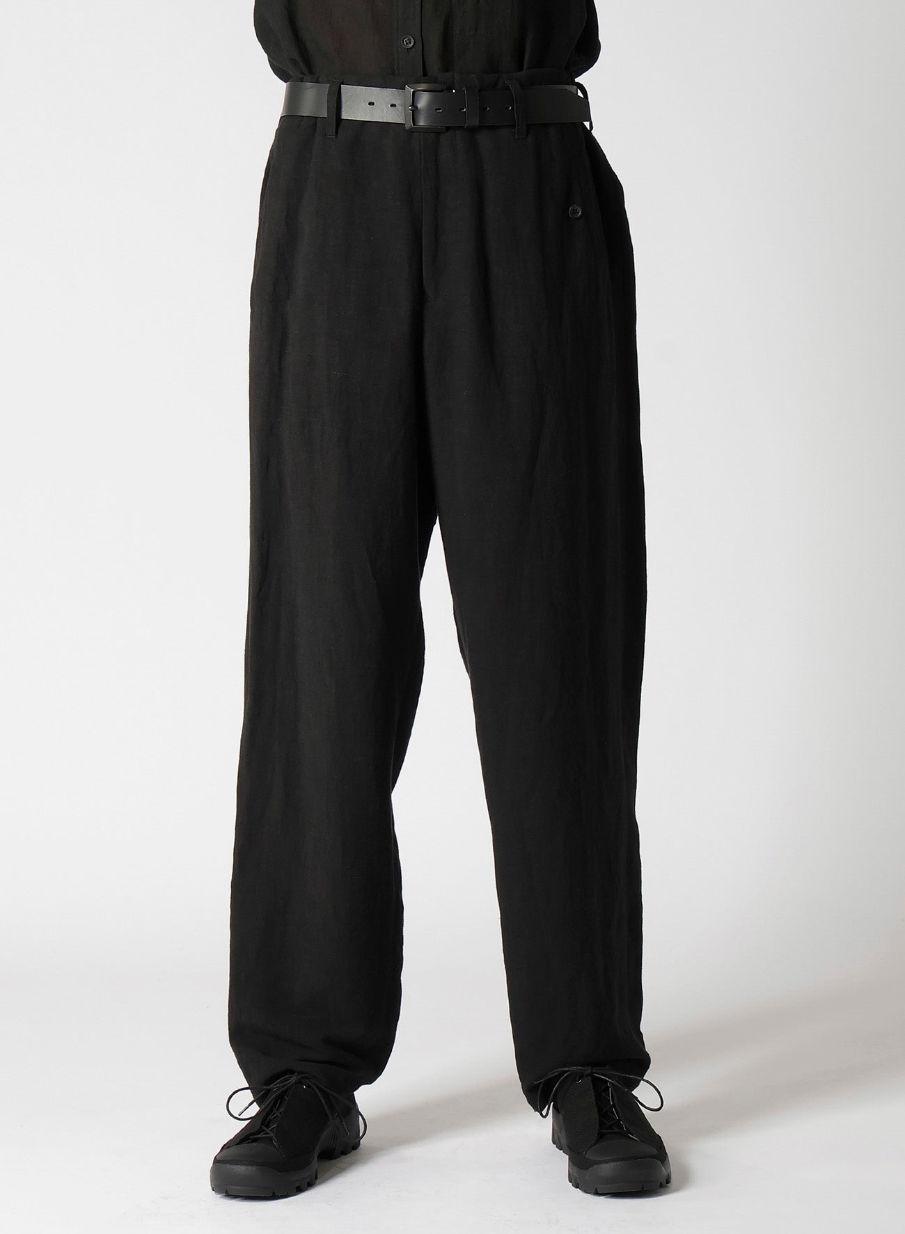 Pantalones anchos hechos de lienzo de rayón con cintura ajustable. Presenta bolsillos con doble ribete y un bolsillo para monedas en el lado izquierdo. Teñido en Kioto, el proceso implica un lavado suave exhaustivo para lograr una suavidad única.