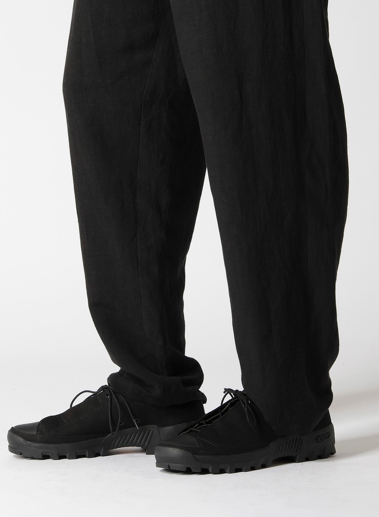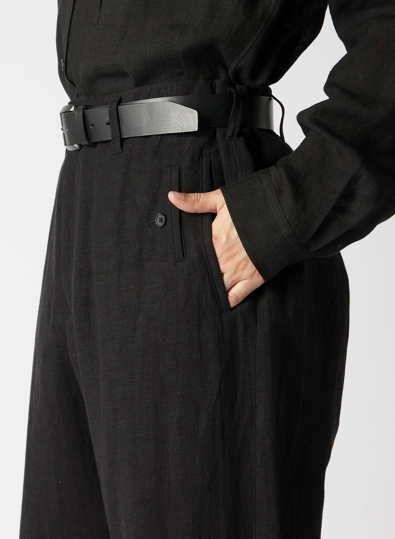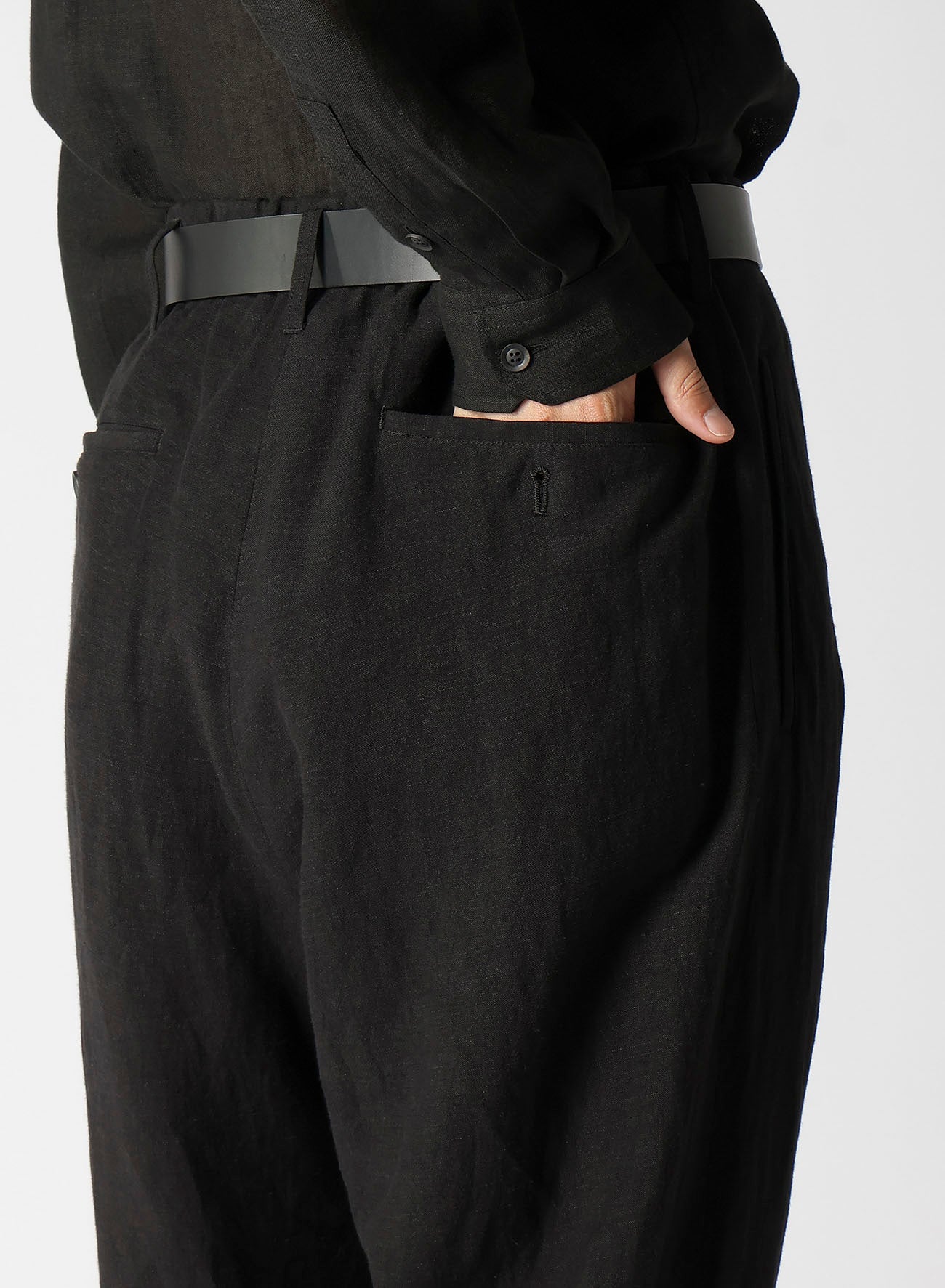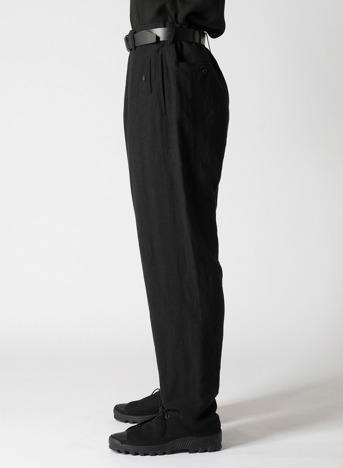 Pantalones anchos hechos de lienzo de rayón con cintura ajustable. Presenta bolsillos con doble ribete y un bolsillo para monedas en el lado izquierdo. Teñido en Kioto, el proceso implica un lavado suave exhaustivo para lograr una suavidad única.