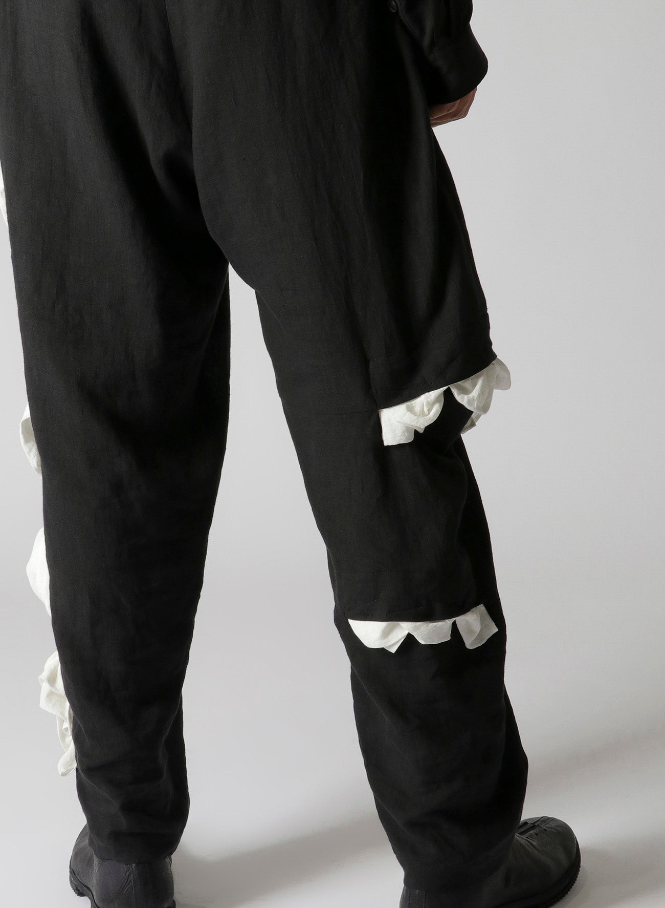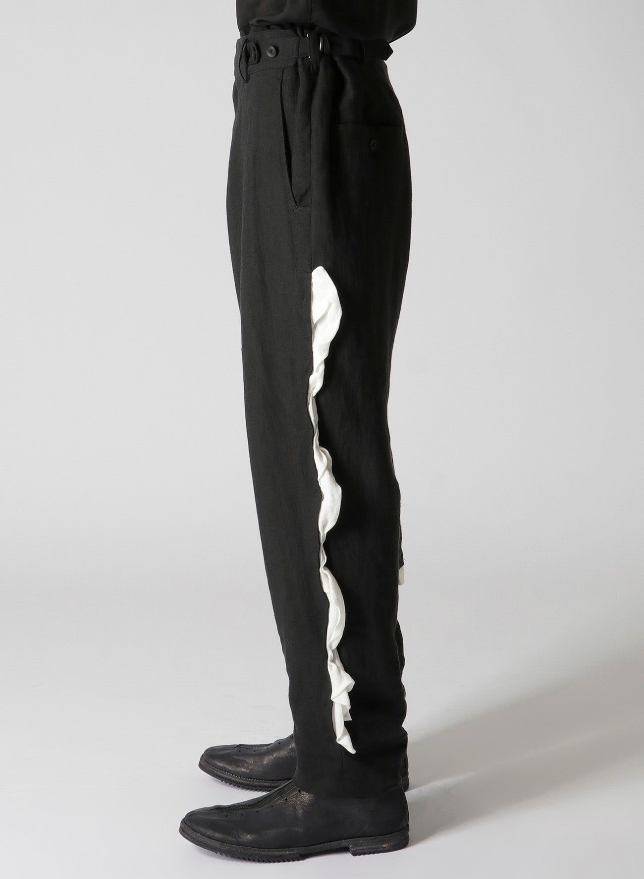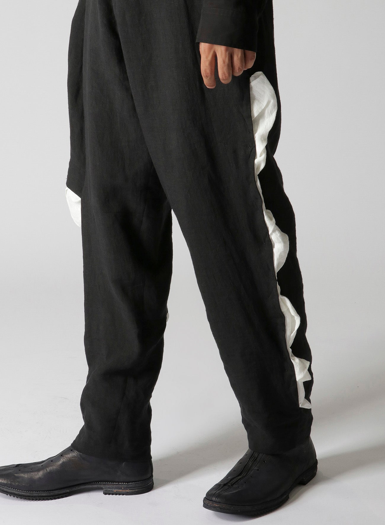 Pantalones griegos blancos con volantes de lino y lona, presentados en LOOK28.