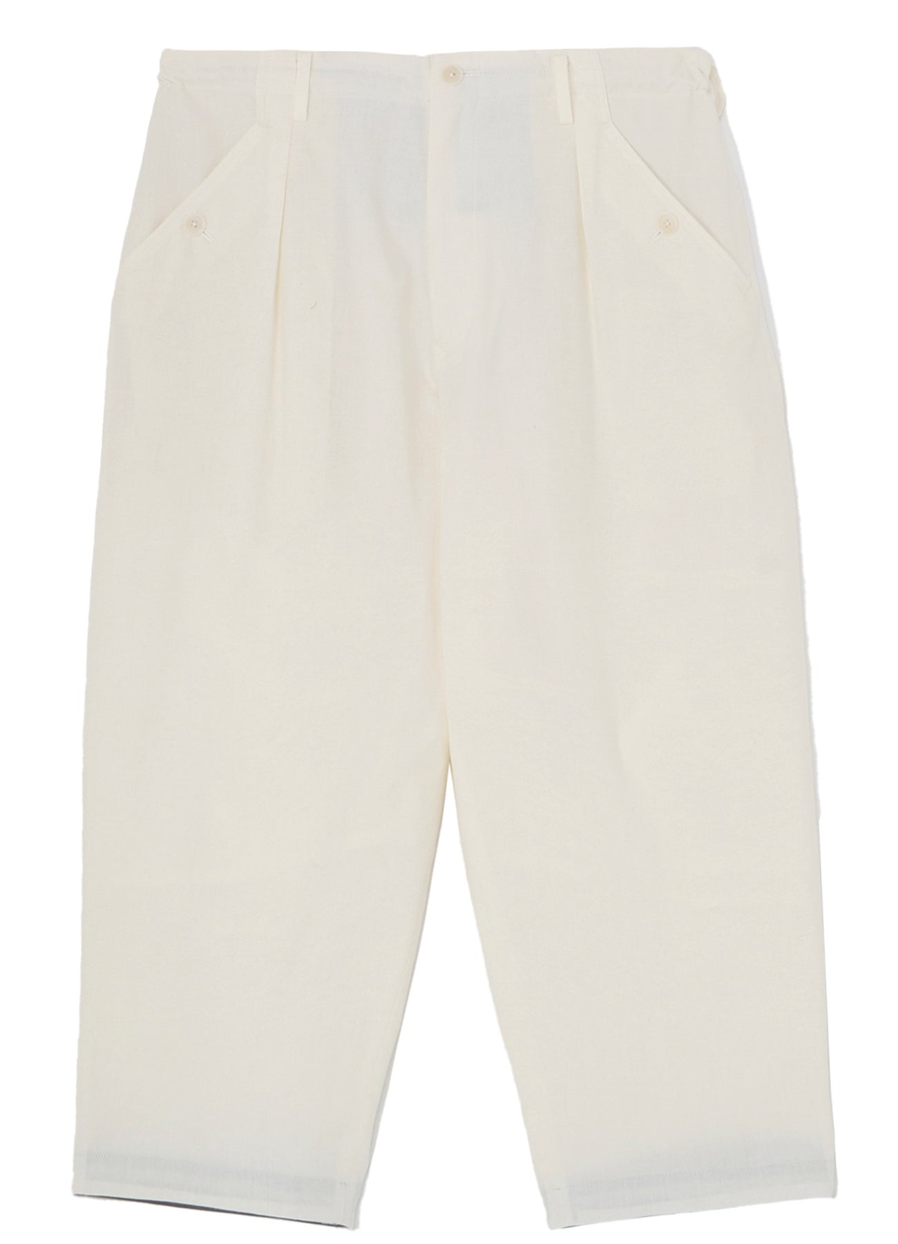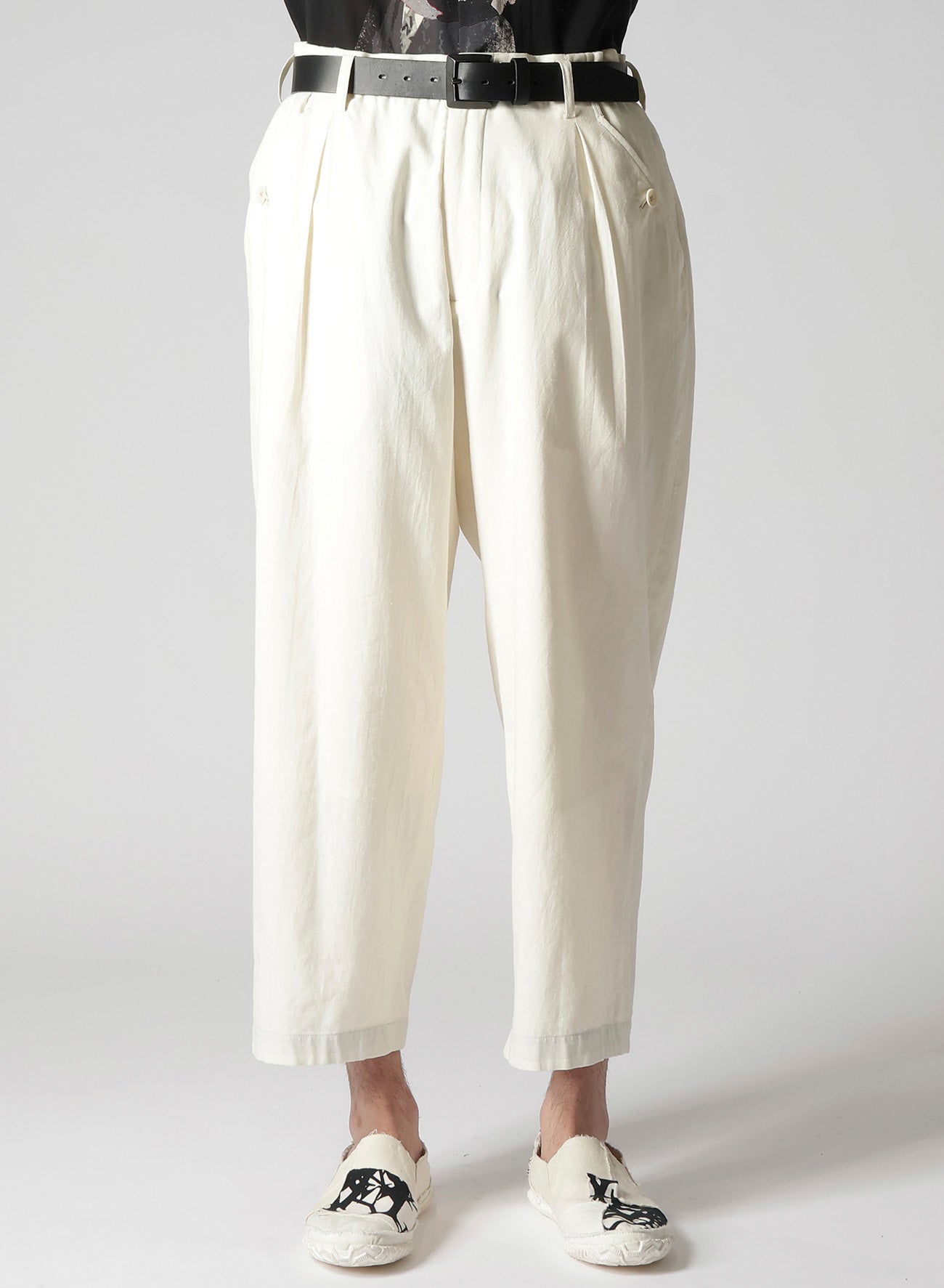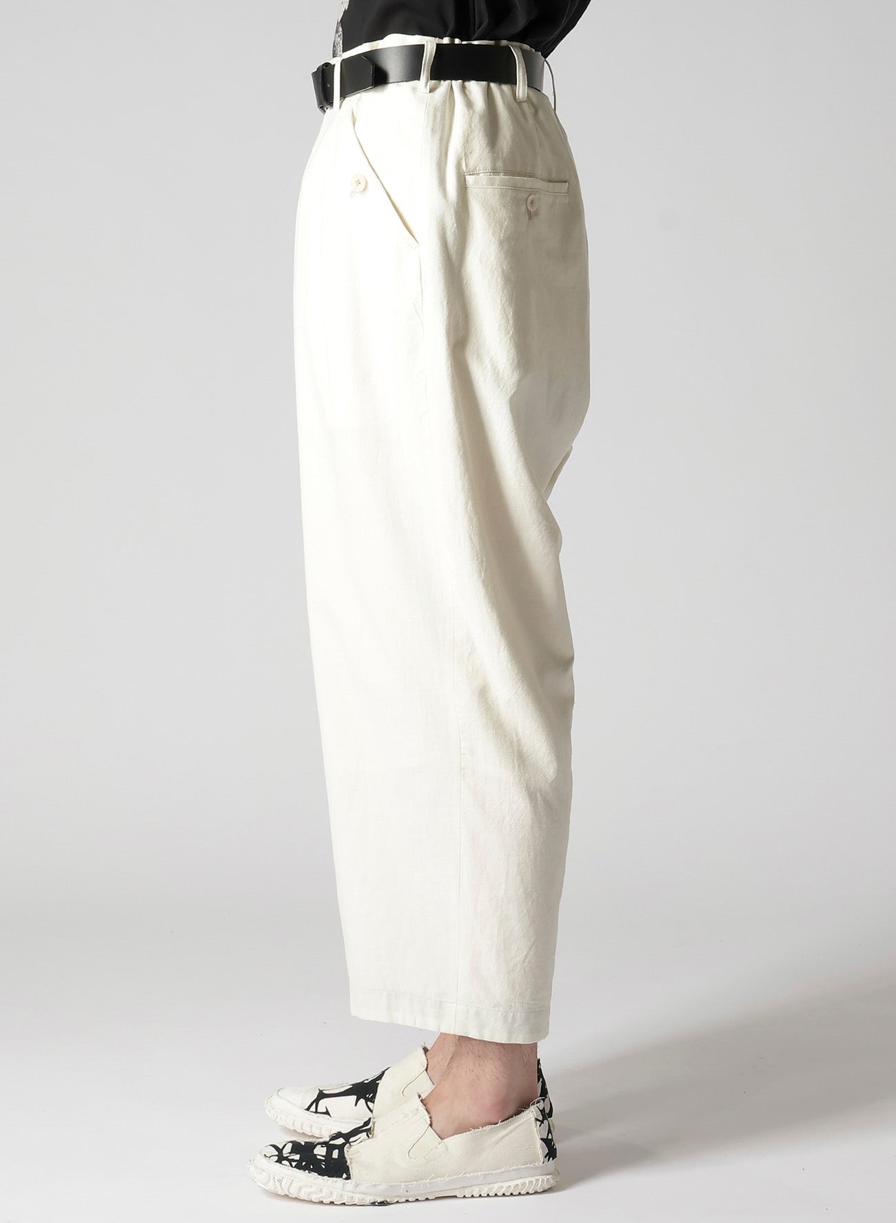 Este artículo es un par de pantalones con plisados, presentado en LOOK18, fabricados con algodón Khadi sin blanquear. Tejido a mano con hilo hilado en ruedas de hilar tradicionales en India, el material ofrece excelente absorción de humedad y propiedades de secado rápido gracias a su hilo suavemente torcido.