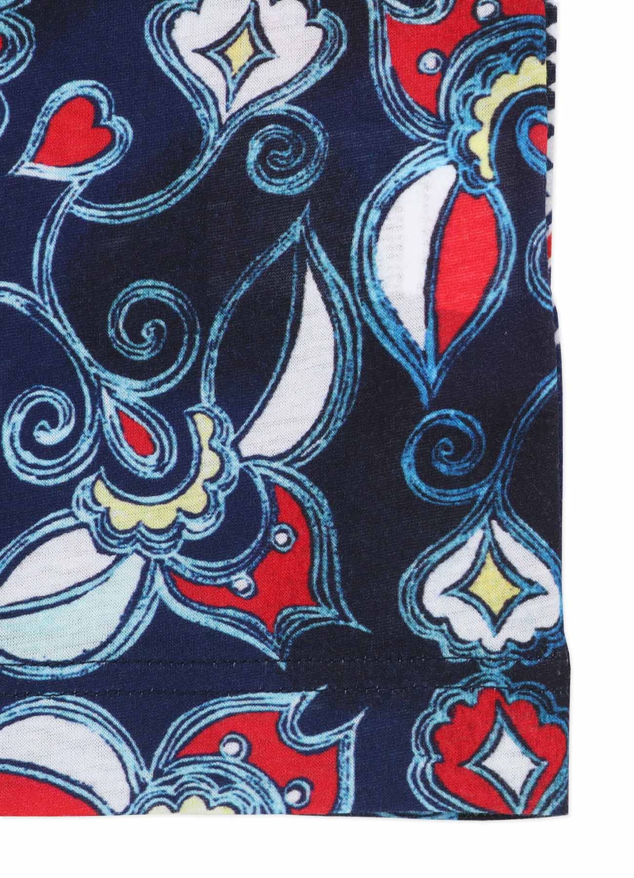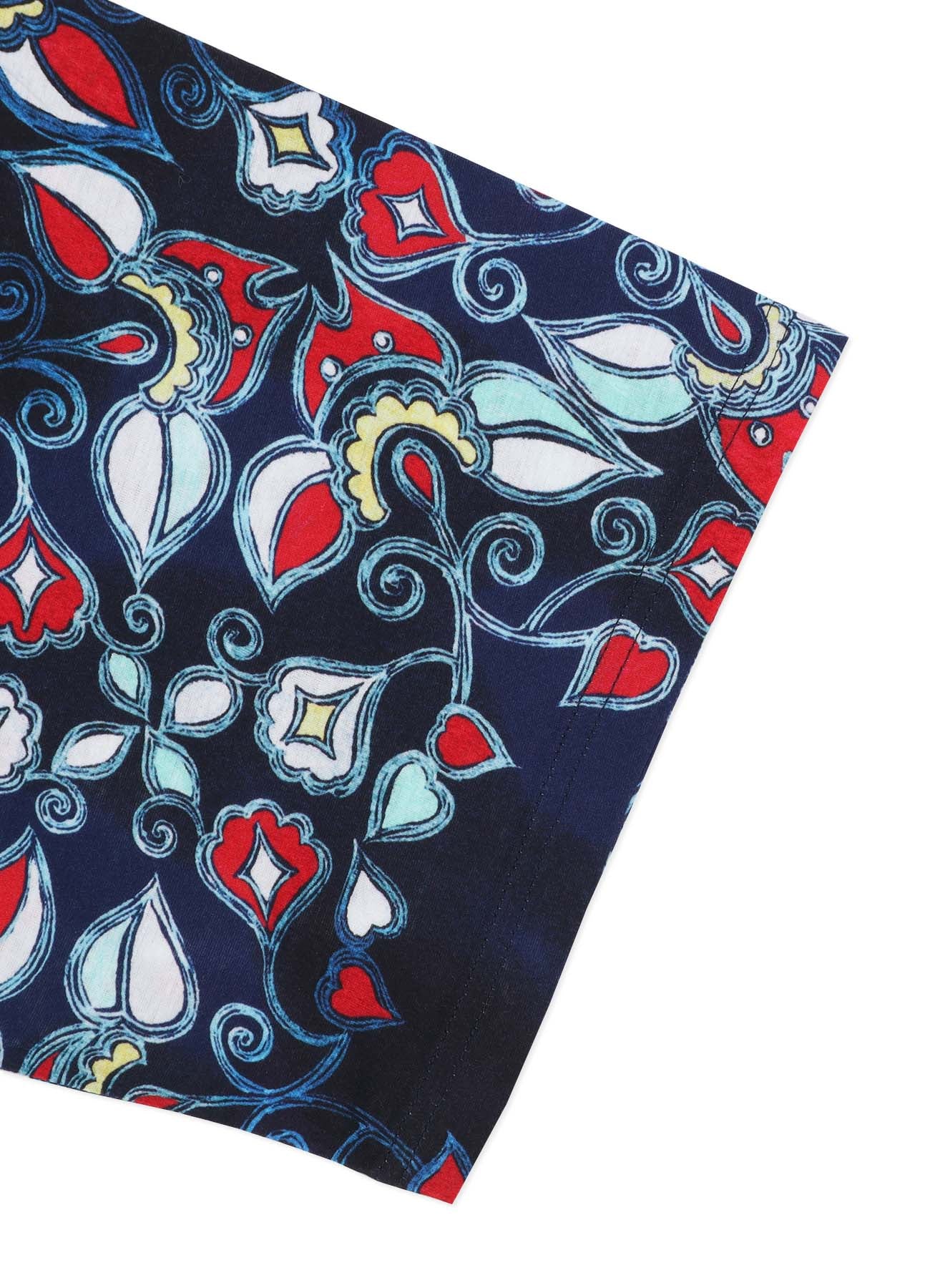 Una blusa hecha de algodón con punto liso y estampado por inyección de tinta presenta un patrón Chinoiserie. Este diseño fue popular entre la nobleza europea y las clases adineradas a mediados del siglo XVII.