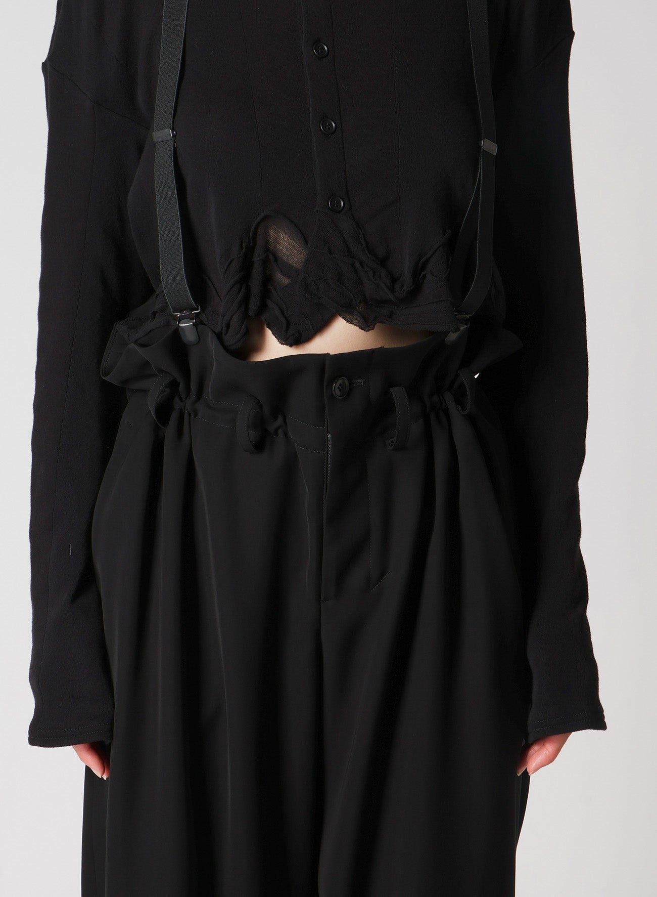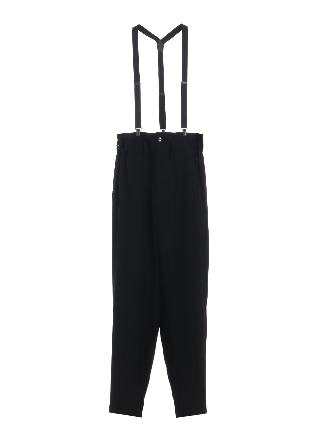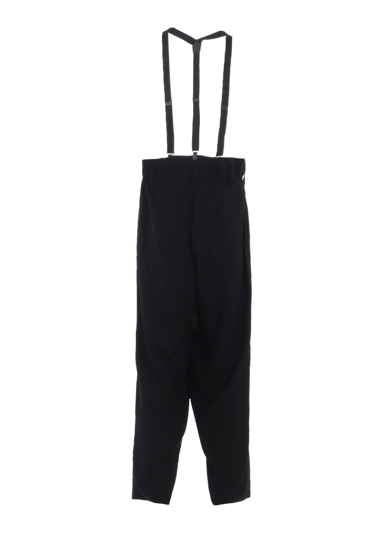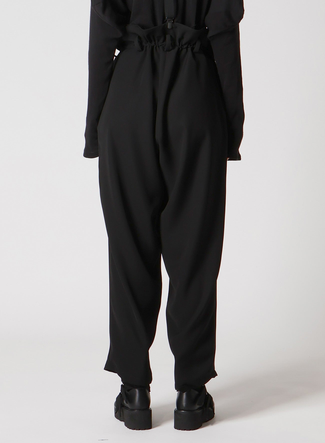 Este tejido de poliéster de doble satén de peso medio es firme, elástico, resistente y ligero. Presenta un satén trasero suave y una sensación ligera y cómoda. El tejido está teñido en un negro intenso mediante un proceso especial. Los pantalones incluyen tirantes y se estrechan hacia el dobladillo para un ajuste sin estrés.