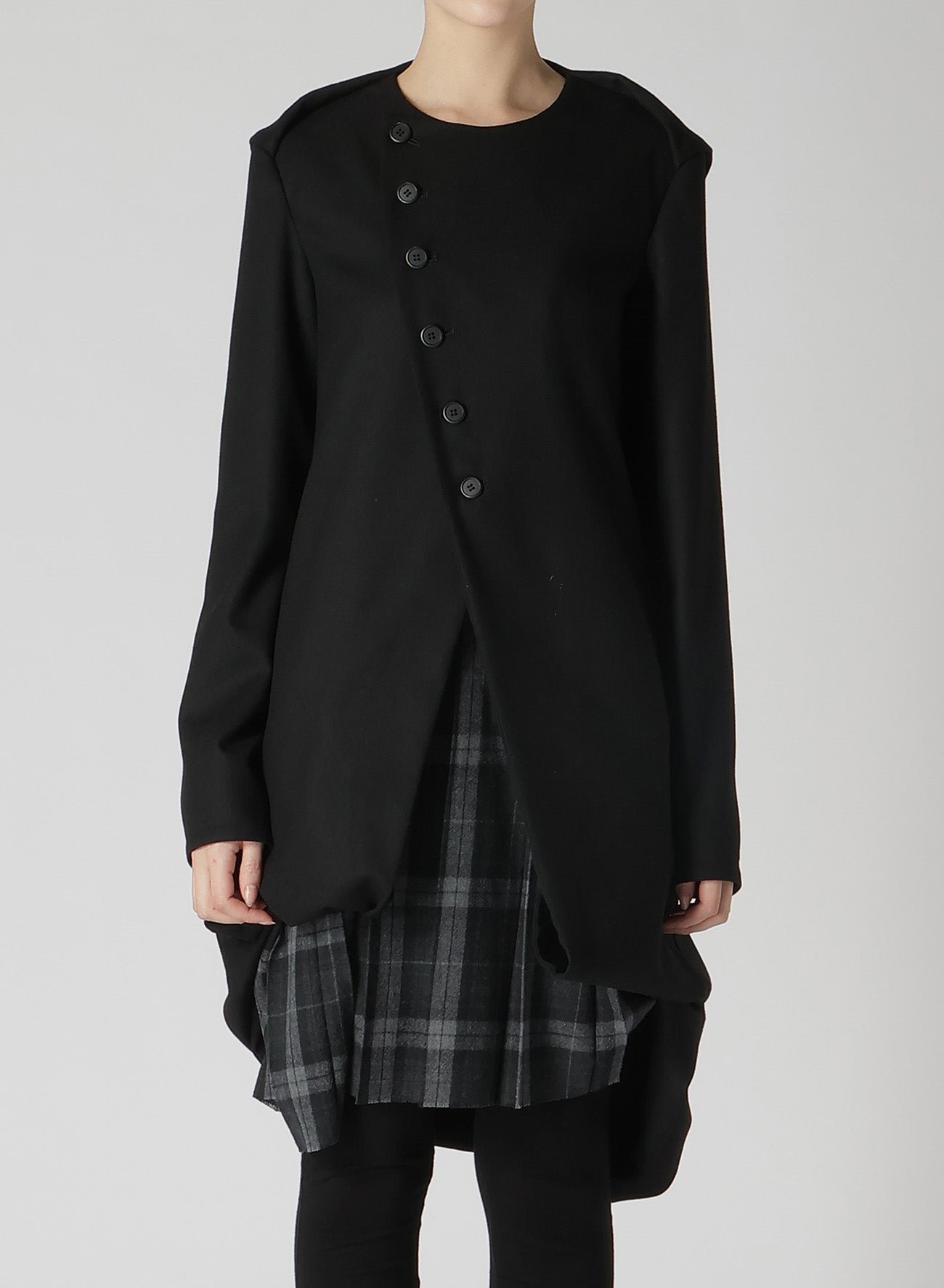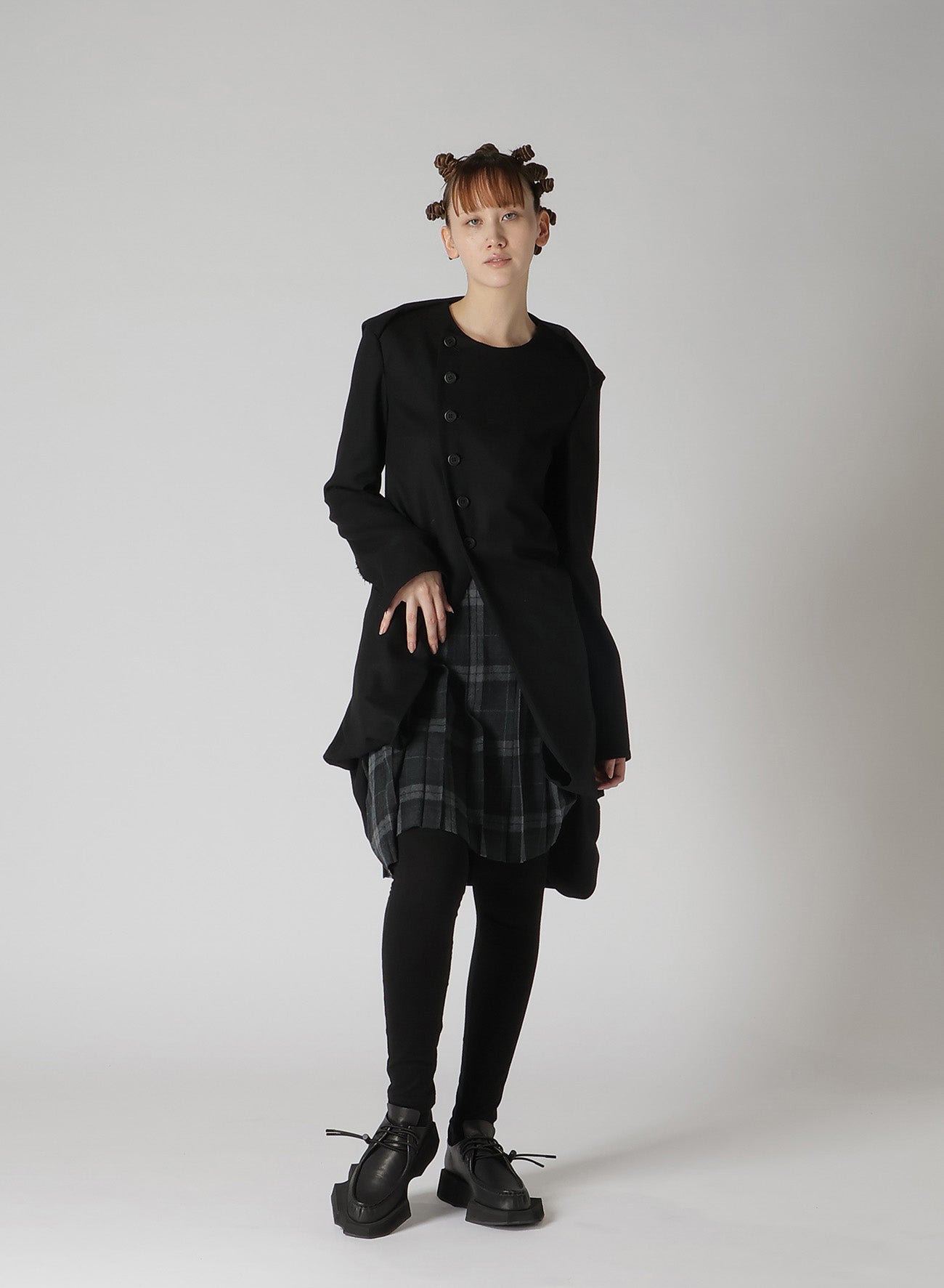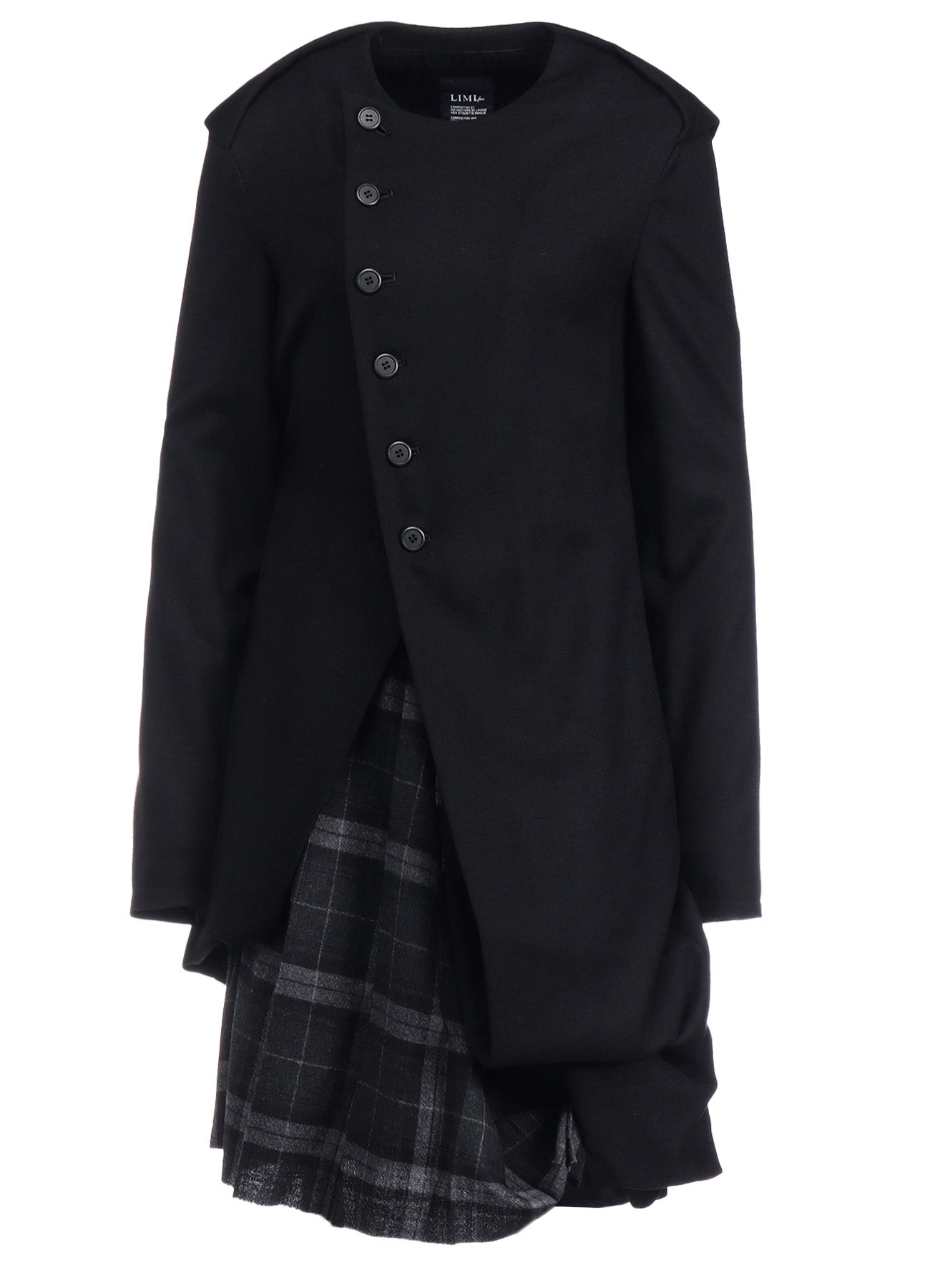 Un vestido que combina lana suave, esponjosa y elástica con tejido de Glen plaid cálido. Terminado con una superficie suavemente cepillada. Los bordes crudos se deshilacharán naturalmente. El diseño del dobladillo añade ángulos distintos, creando apariencias variadas. La parte frontal presenta un panel con botones, imitando un cuello de marinero, aportando un toque punk y femenino.