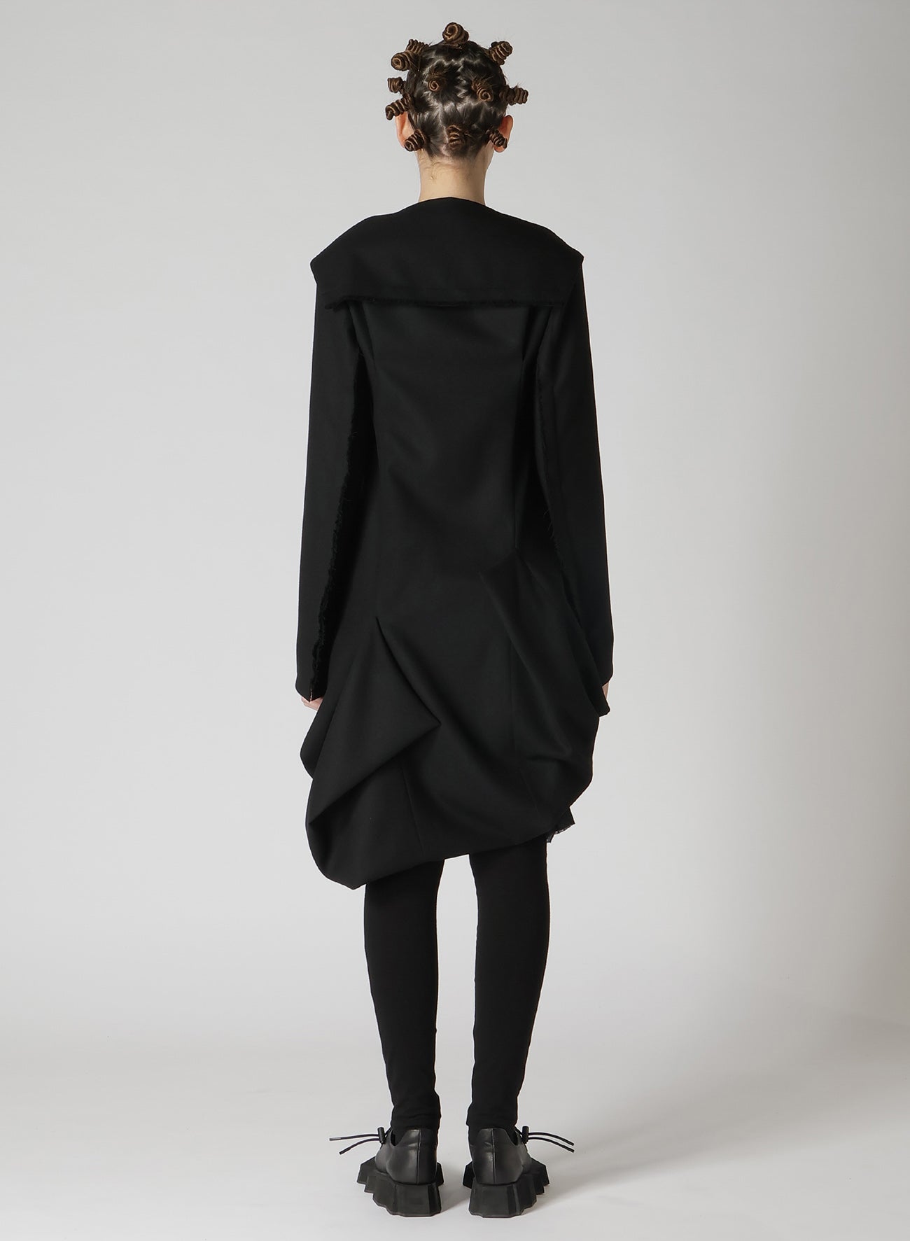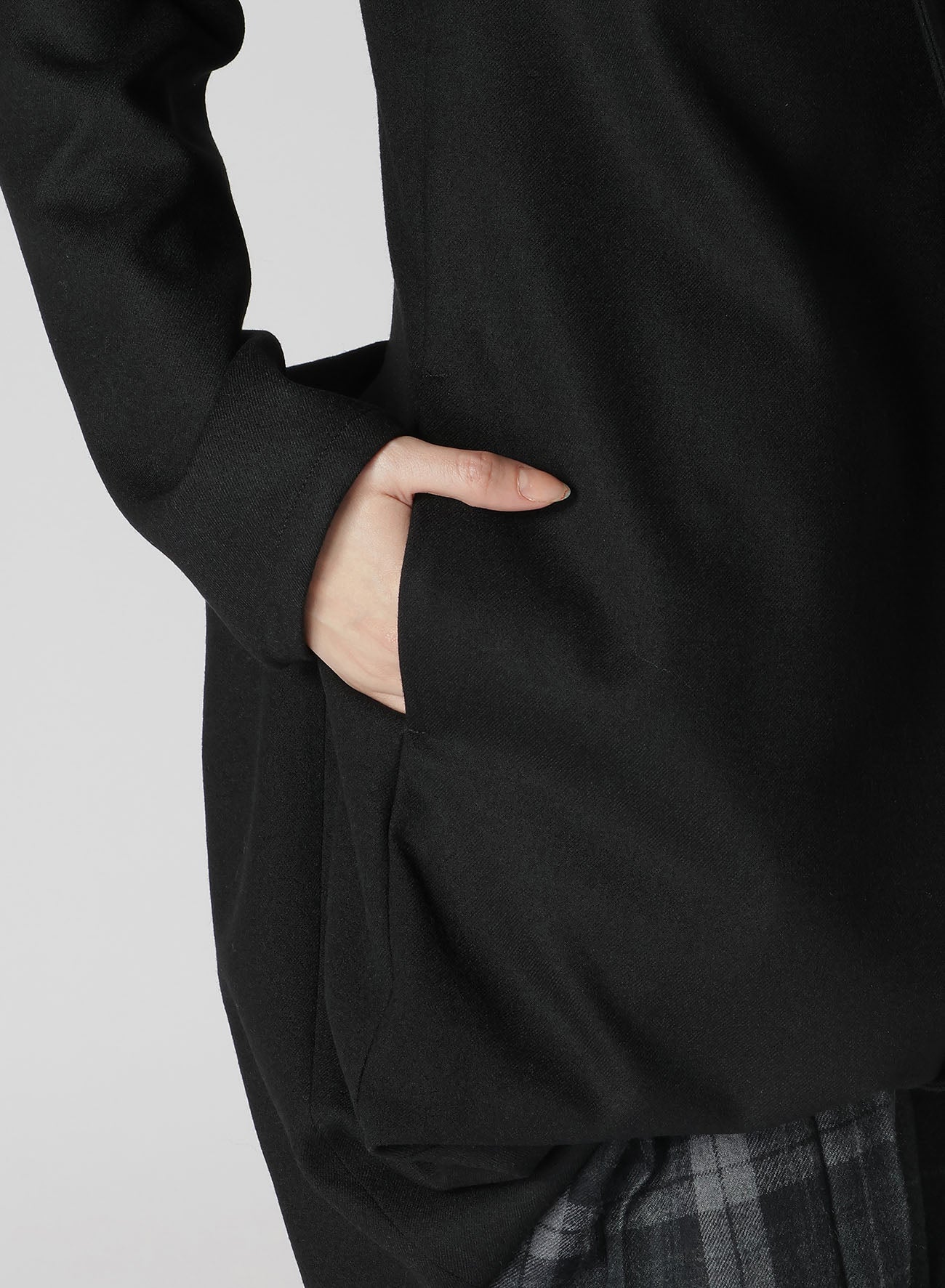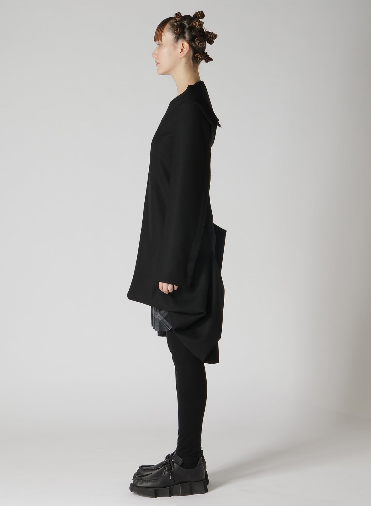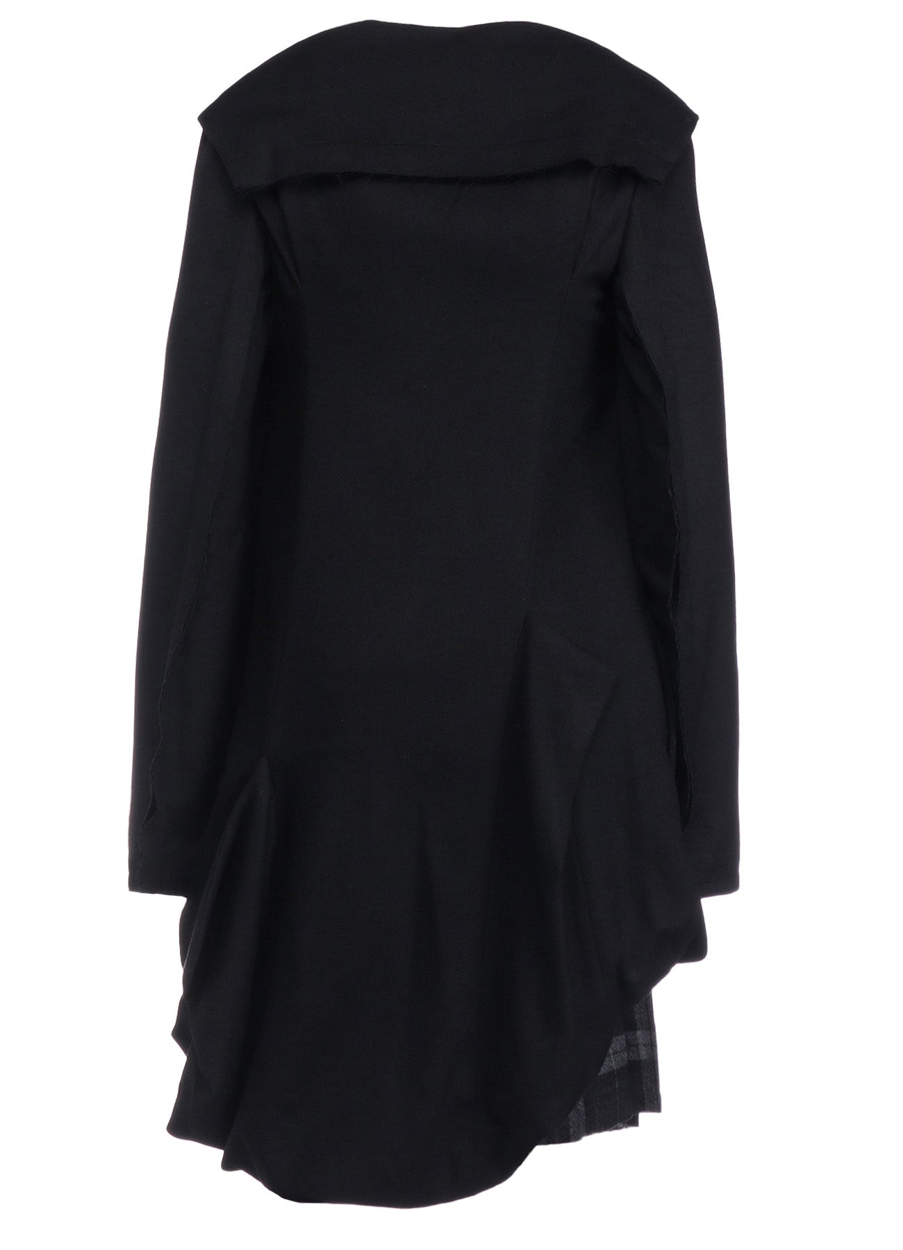Un vestido que combina lana suave, esponjosa y elástica con tejido de Glen plaid cálido. Terminado con una superficie suavemente cepillada. Los bordes crudos se deshilacharán naturalmente. El diseño del dobladillo añade ángulos distintos, creando apariencias variadas. La parte frontal presenta un panel con botones, imitando un cuello de marinero, aportando un toque punk y femenino.