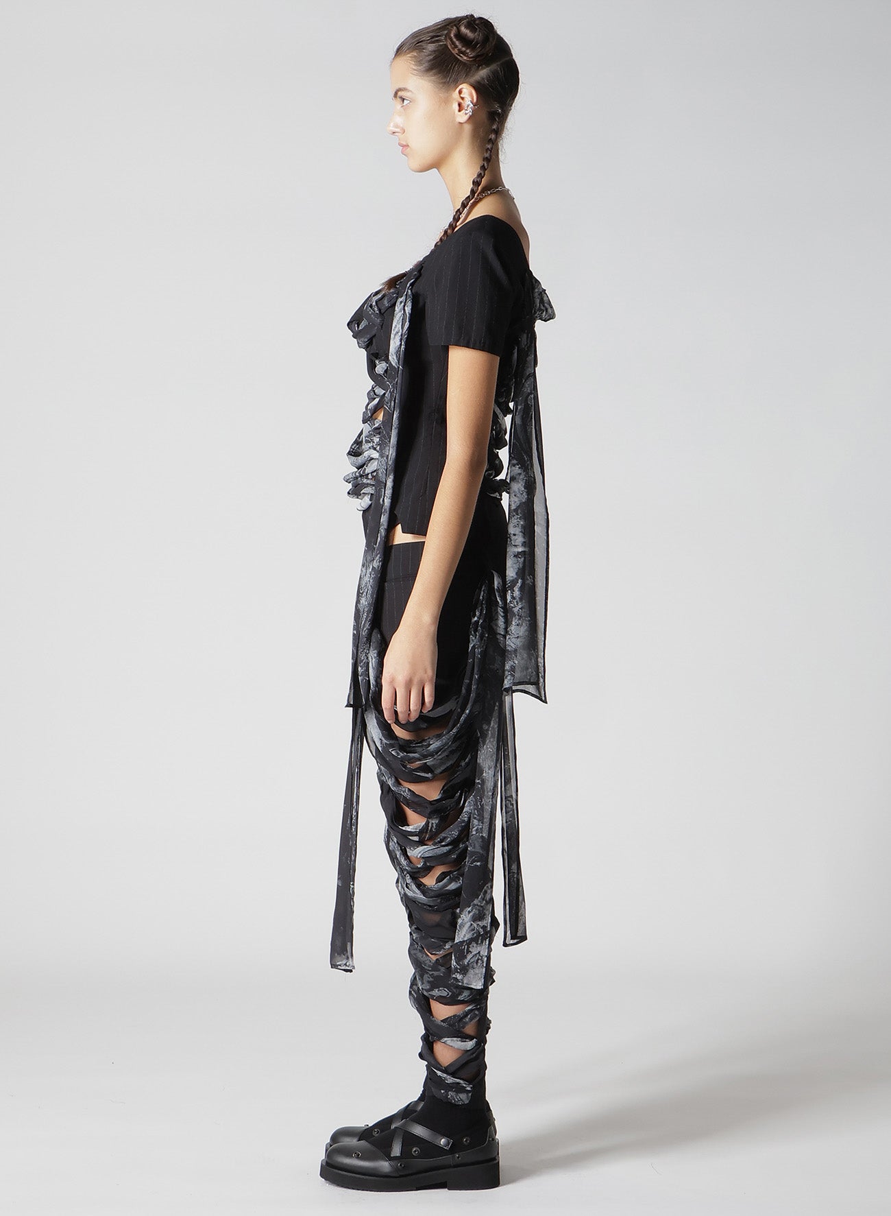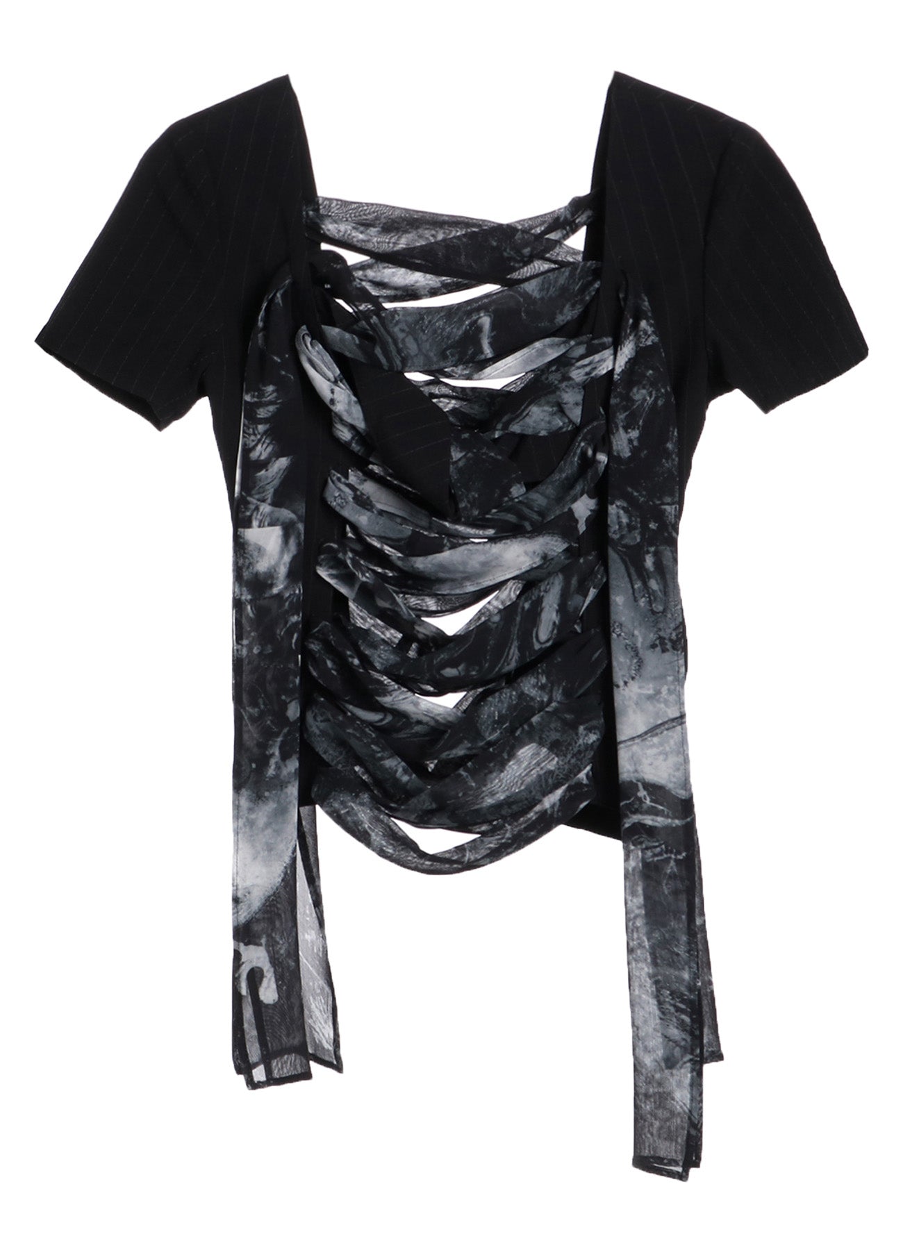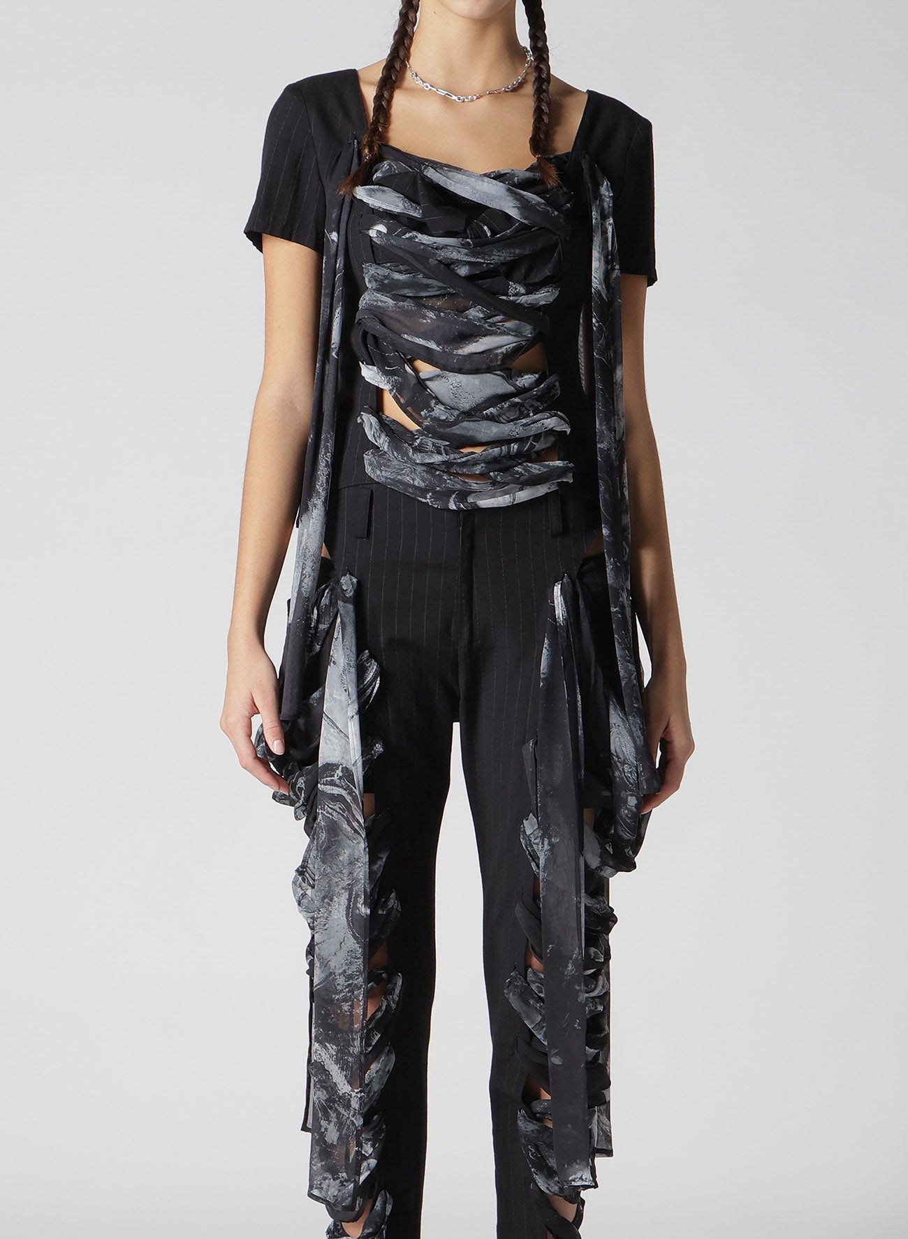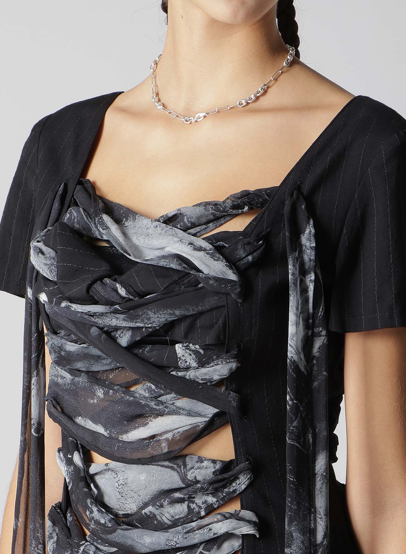 Este tejido a rayas inspirado en el guardarropa masculino ofrece un tacto suave y caída moderada. La textura se logra aprovechando las diferencias de encogimiento entre poliéster y rayón. Las tiras de encaje cuentan con un delicado chifón con motivo escultórico impreso. La prenda destaca por su diseño de tiras exclusivo.