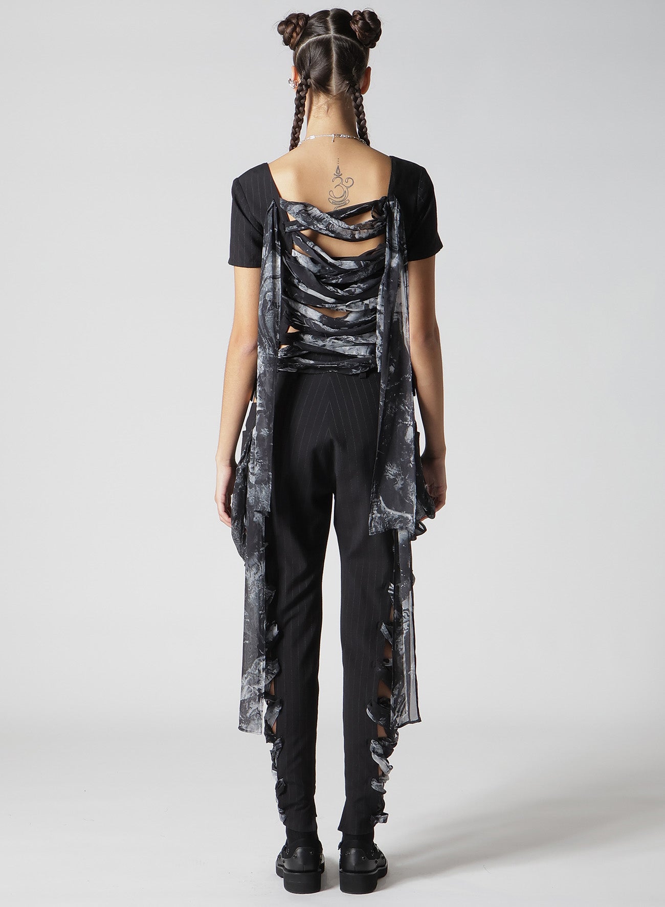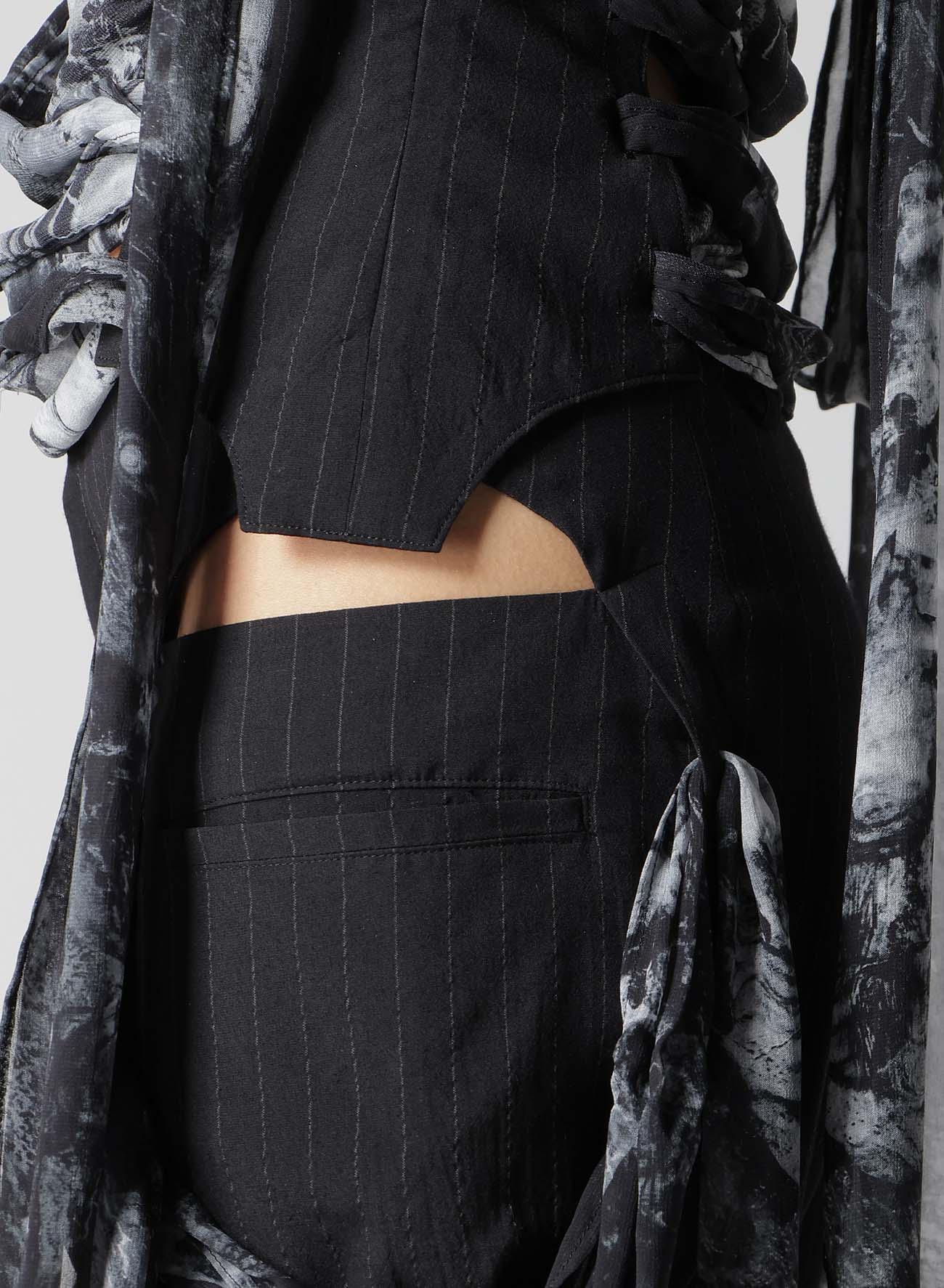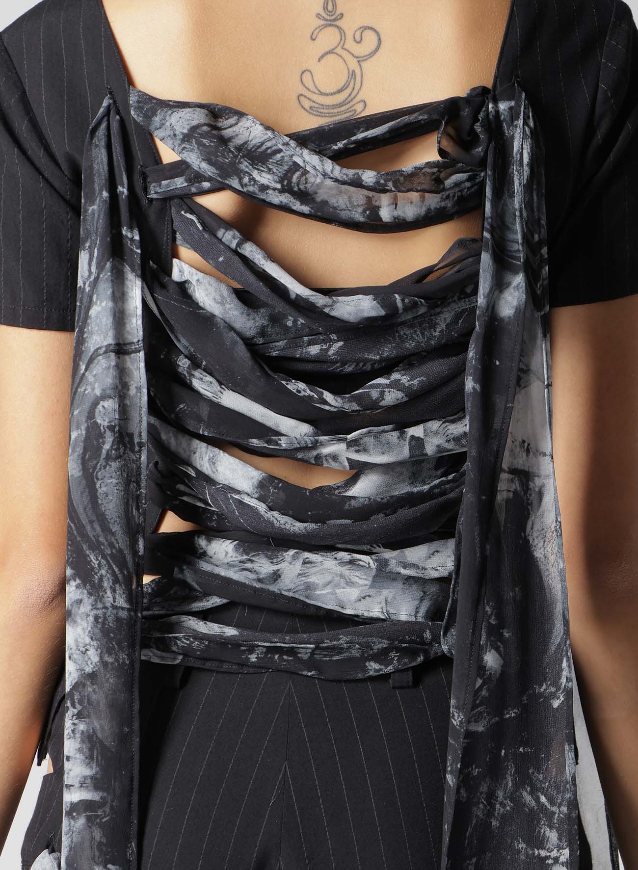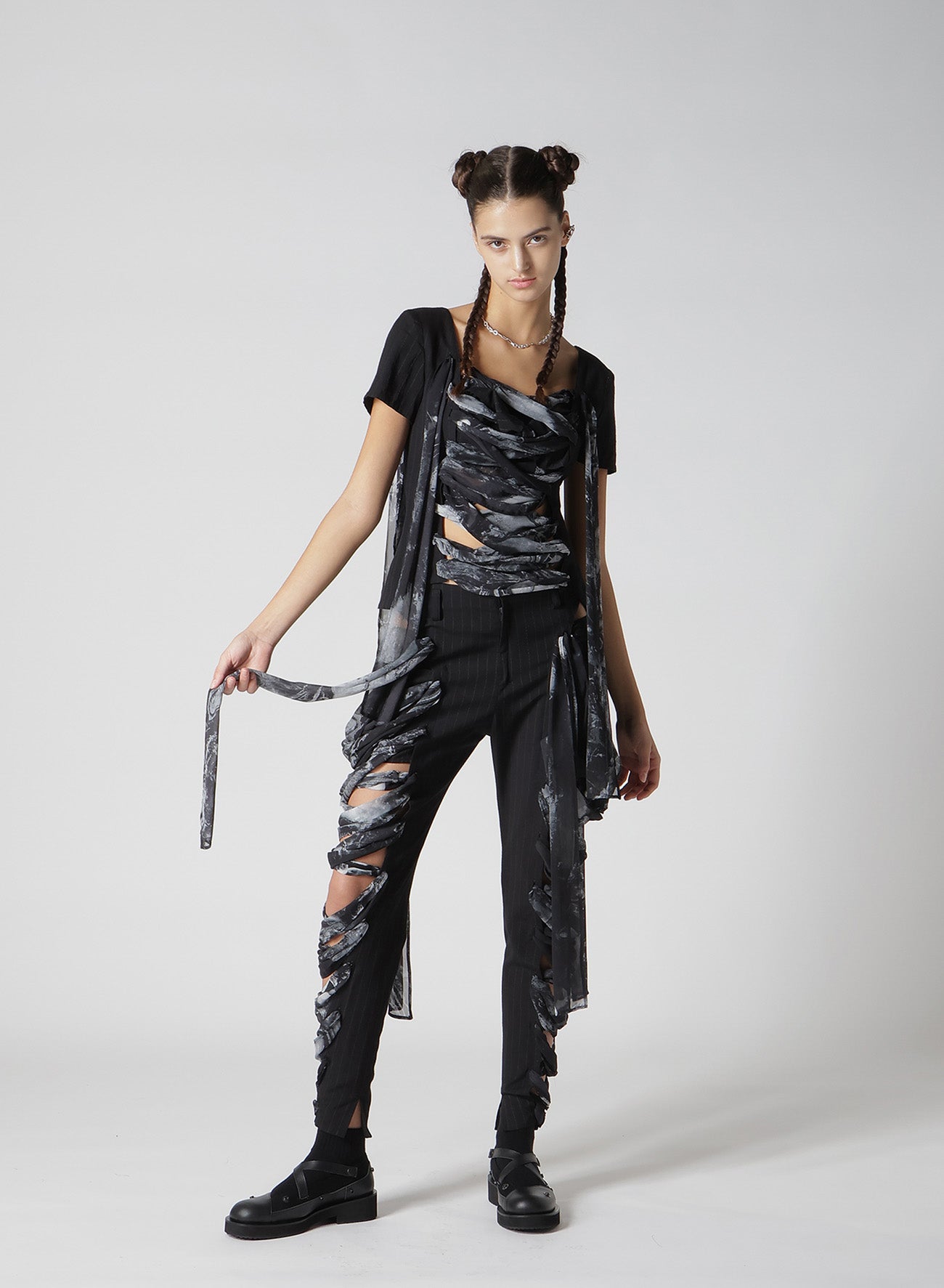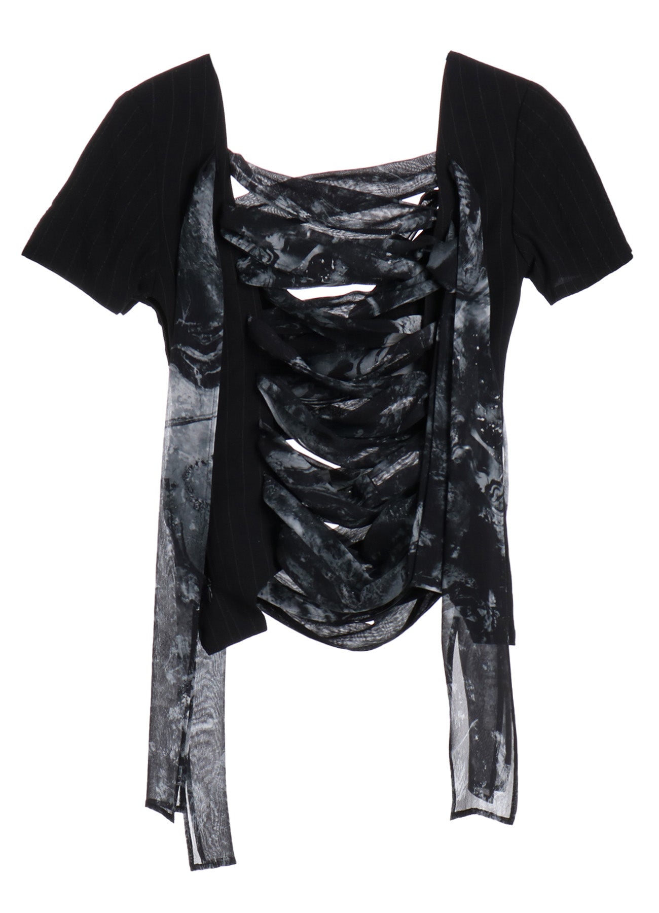 Este tejido a rayas inspirado en el guardarropa masculino ofrece un tacto suave y caída moderada. La textura se logra aprovechando las diferencias de encogimiento entre poliéster y rayón. Las tiras de encaje cuentan con un delicado chifón con motivo escultórico impreso. La prenda destaca por su diseño de tiras exclusivo.