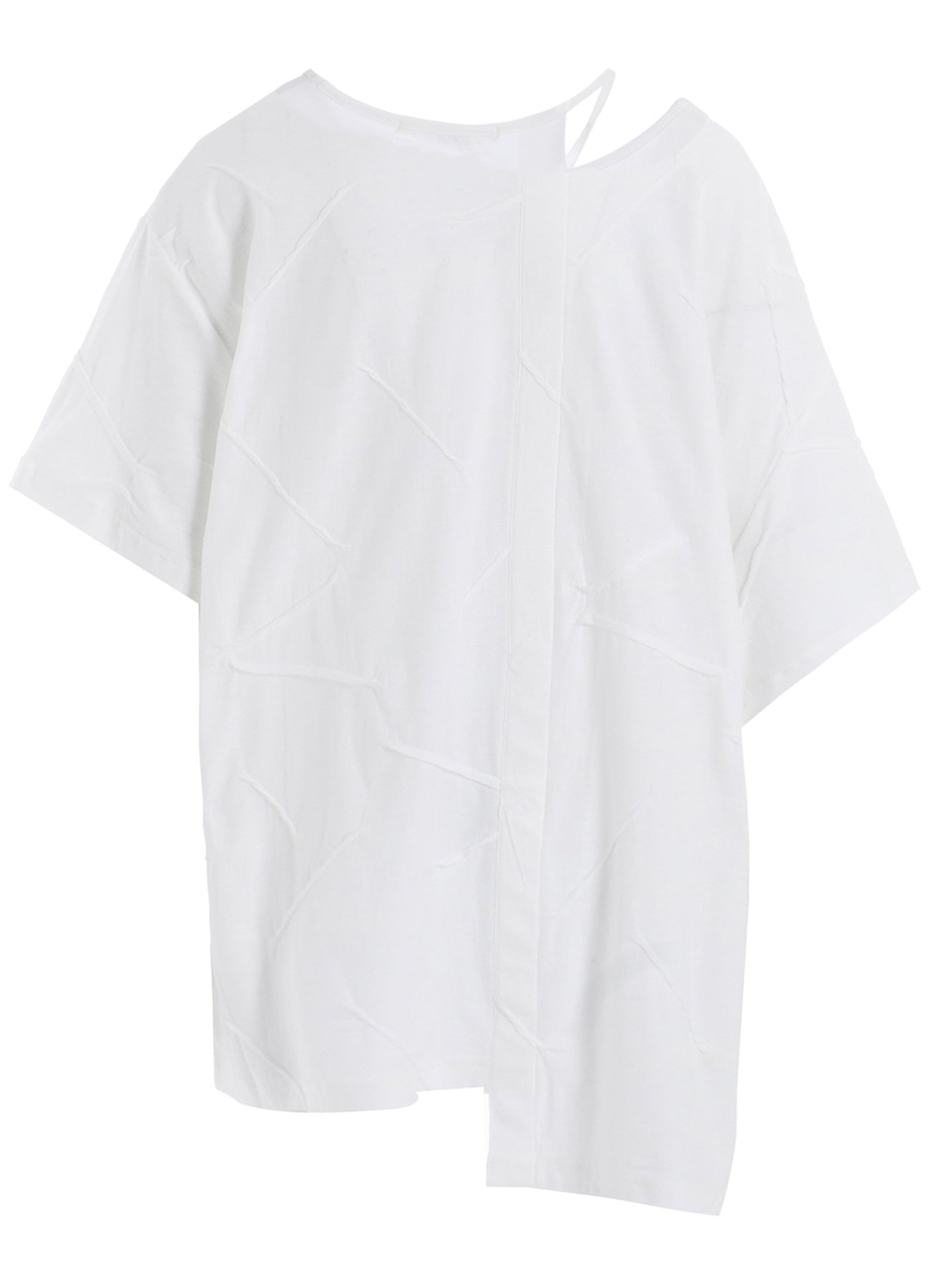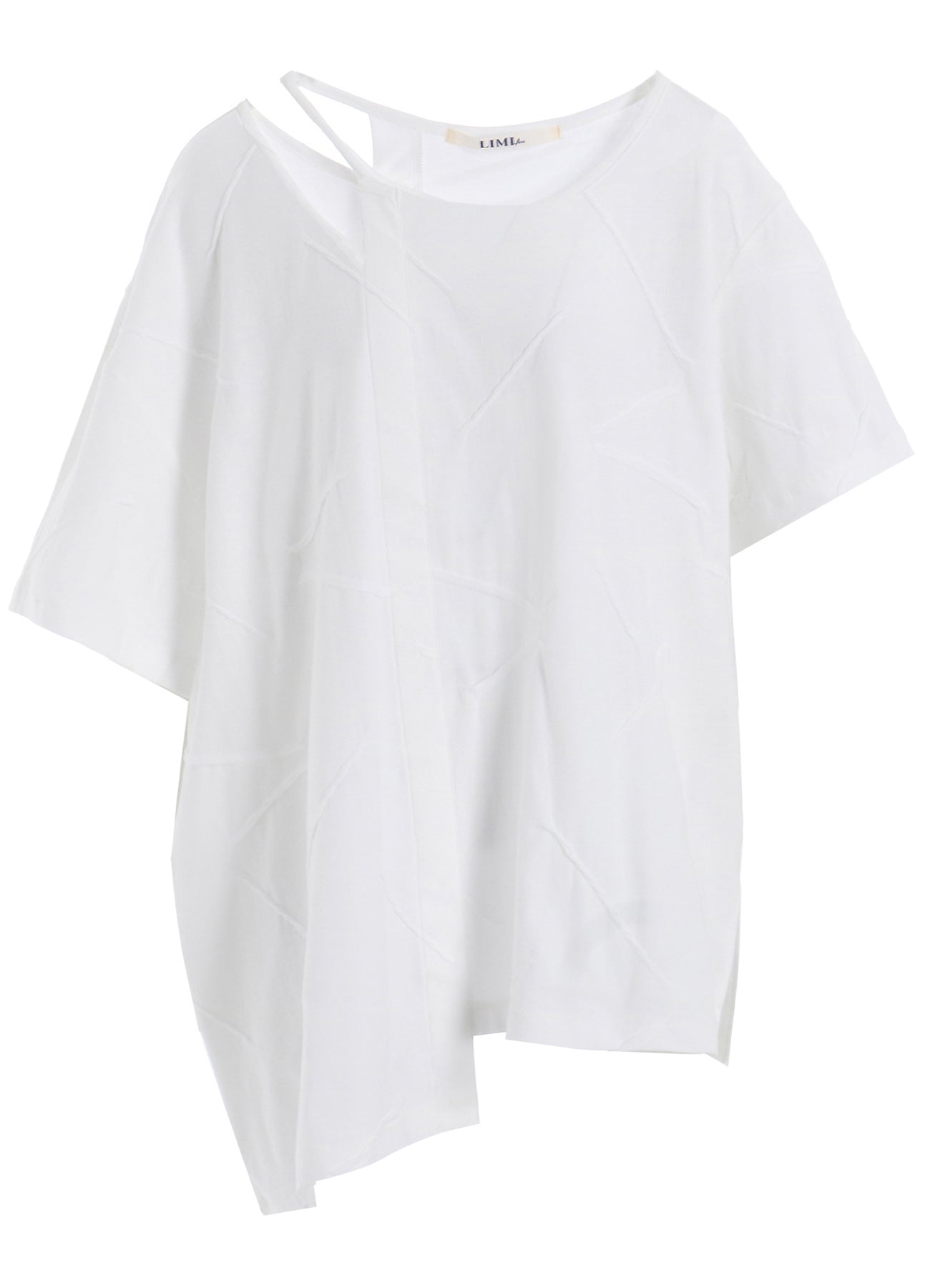 Este top utiliza hilo peinado con mínimo vello para una textura lustrosa y suave. Los pliegues colocados aleatoriamente se elaboran con una técnica especial para evitar roturas de hilo, creando un jacquard único. La silueta suelta lo hace versátil, mientras que el diseño asimétrico garantiza que no se vea demasiado simple.
