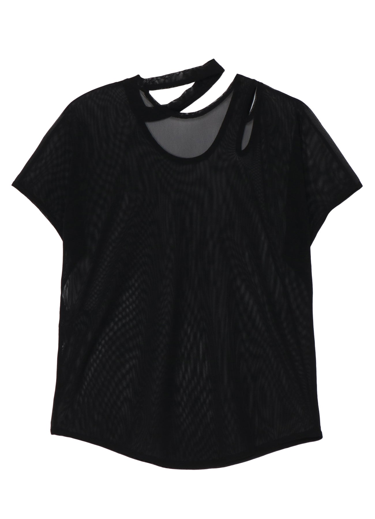 Este top, hecho de tela de tul altamente elástico y ligero, ofrece excelente retención de forma y comodidad, reduciendo el estrés durante el uso. Diseñado con mangas tipo cap, presenta cortes en el hombro derecho y el escote. Se combina fácilmente con cualquier pantalón, ofreciendo versatilidad en el estilo.