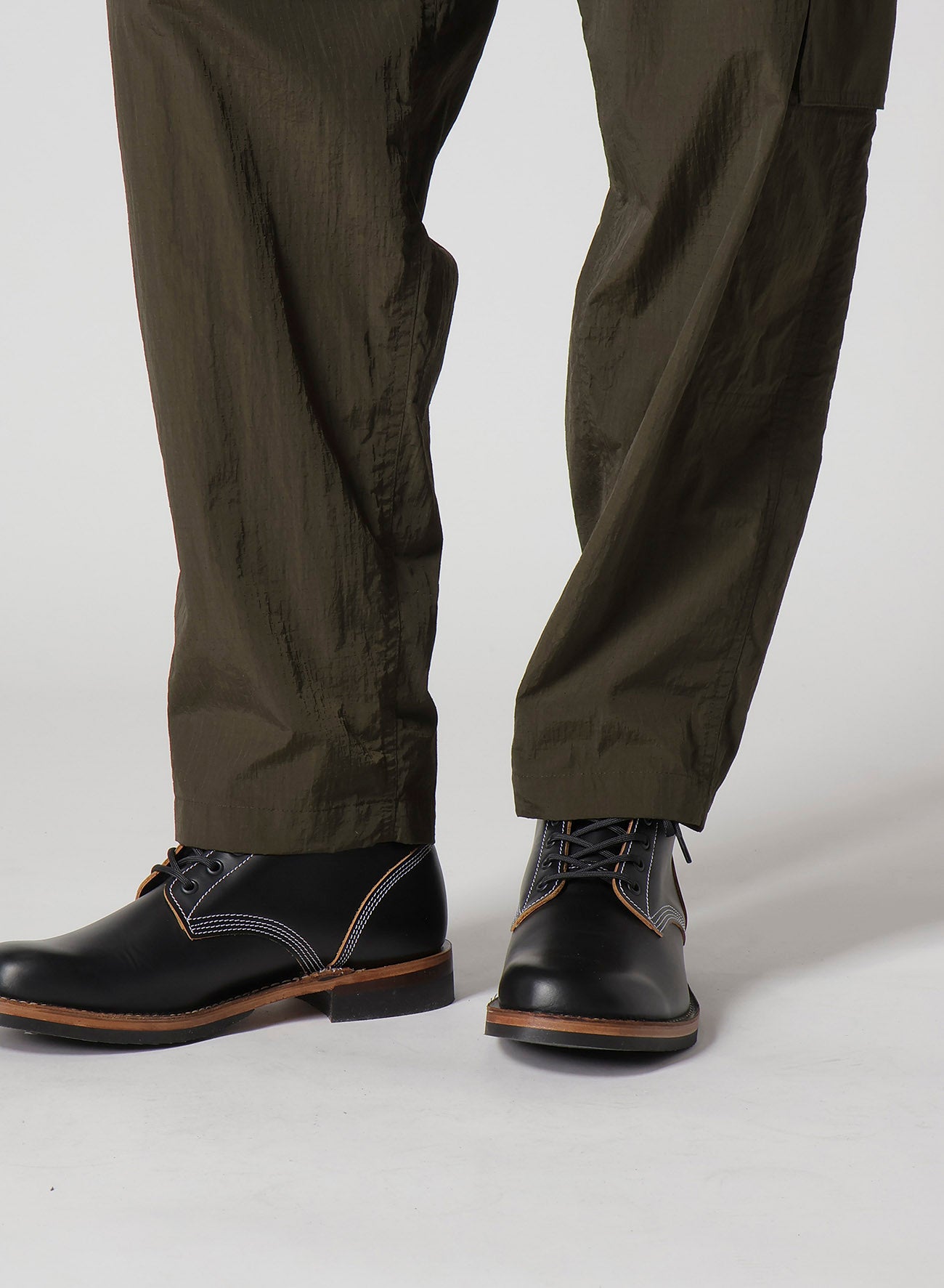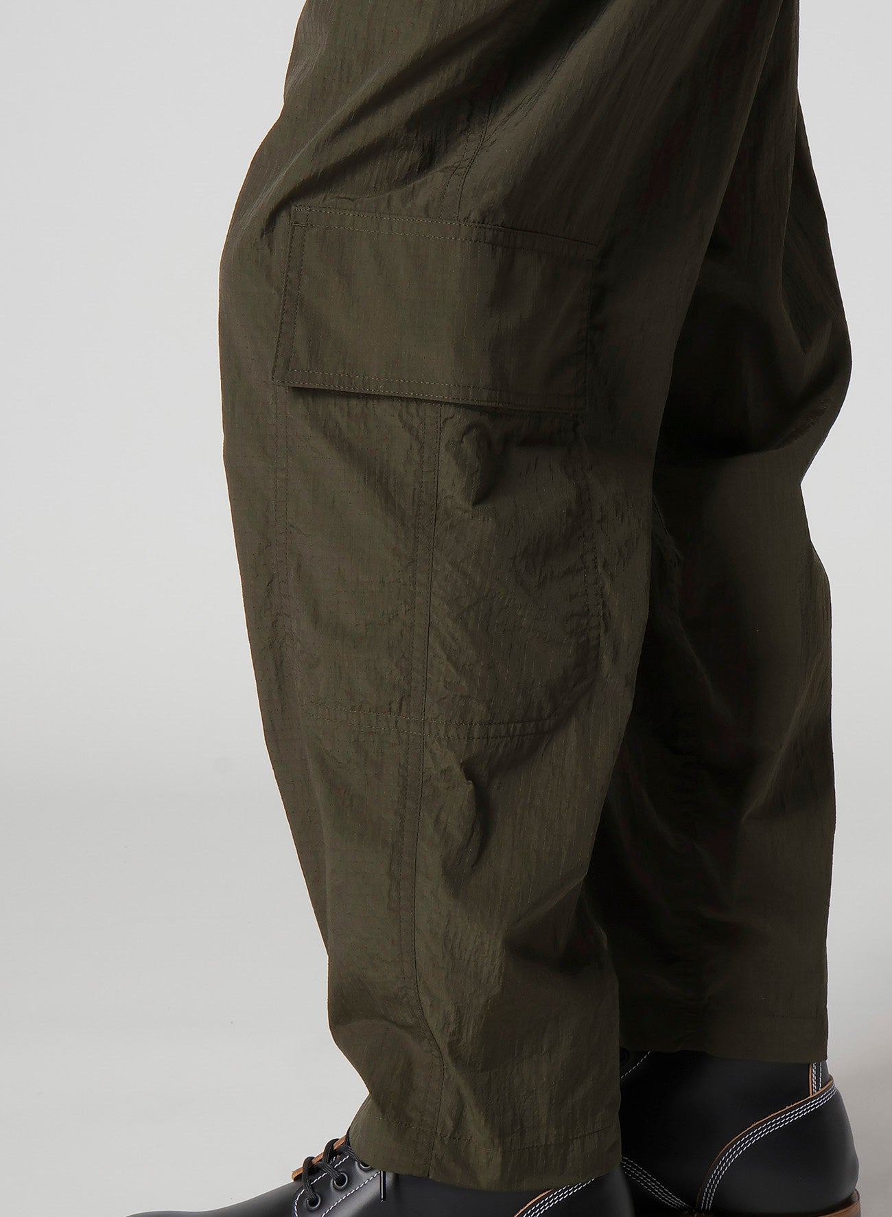 Estos pantalones plisados de nylon ripstop están confeccionados con hilos semi-opacos para un acabado mate, teñidos meticulosamente para un aspecto suave y natural. Incluyen pliegues laterales para facilitar el movimiento y un bolsillo de solapa destacado en el lado izquierdo. Las imágenes del modelo pueden diferir del producto final.