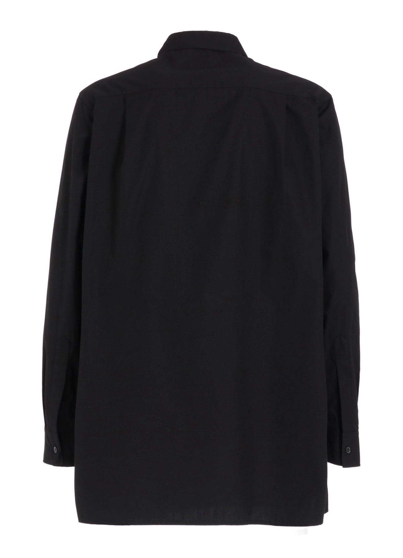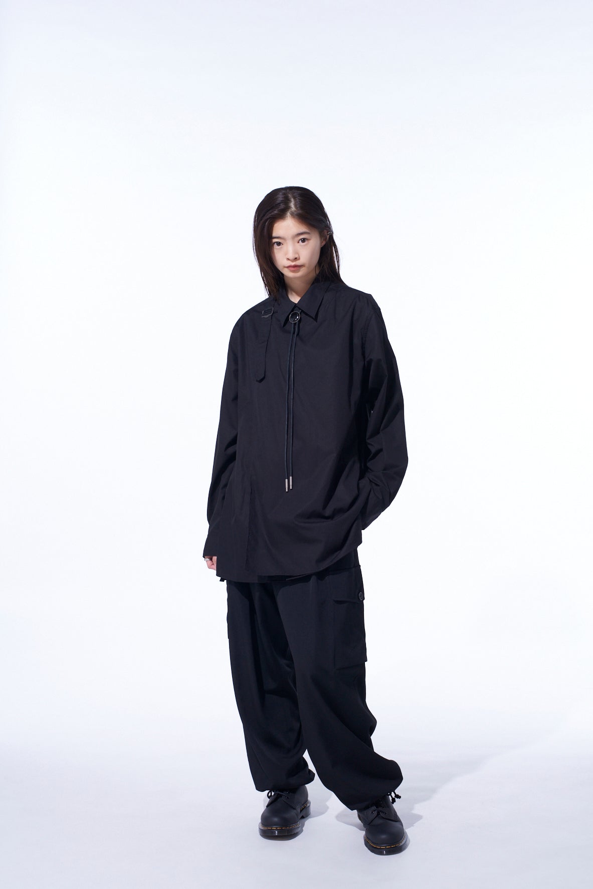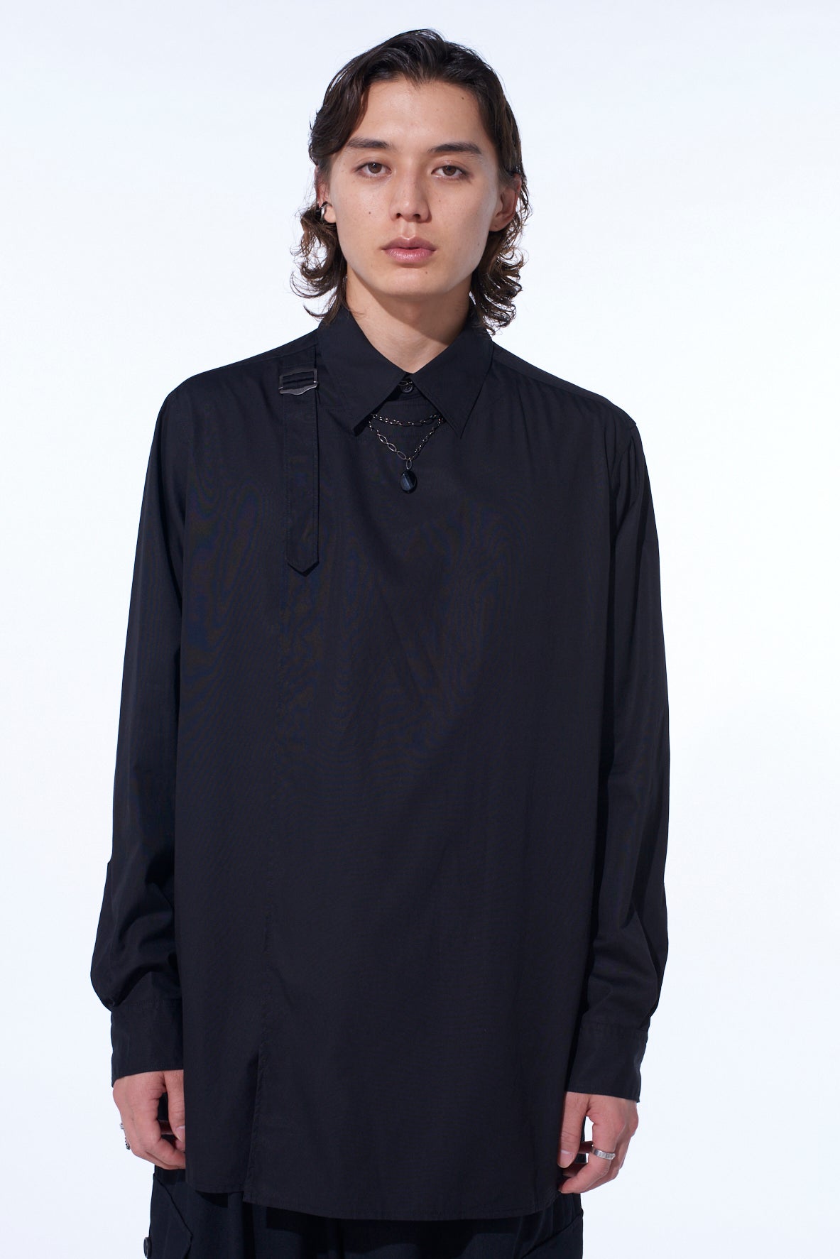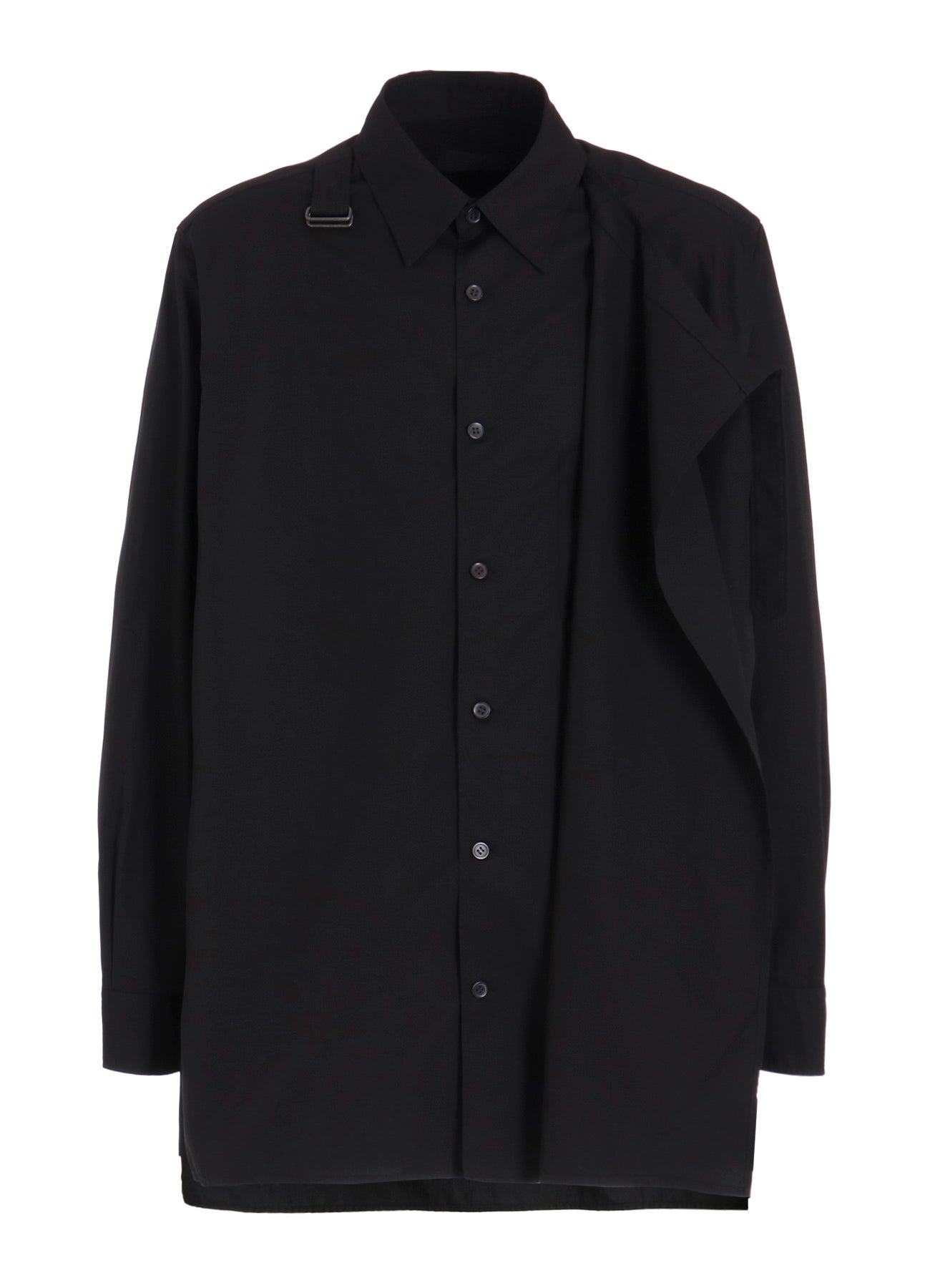 Esta camisa de manga larga, hecha de count broadcloth, presenta un cuerpo superpuesto único en el frente izquierdo. El acabado Air Tumbler le brinda suavidad y riqueza. El diseño a capas con un cinturón en el cuello permite una silueta estructurada, y al quitar el cinturón destaca la elegancia del tejido.