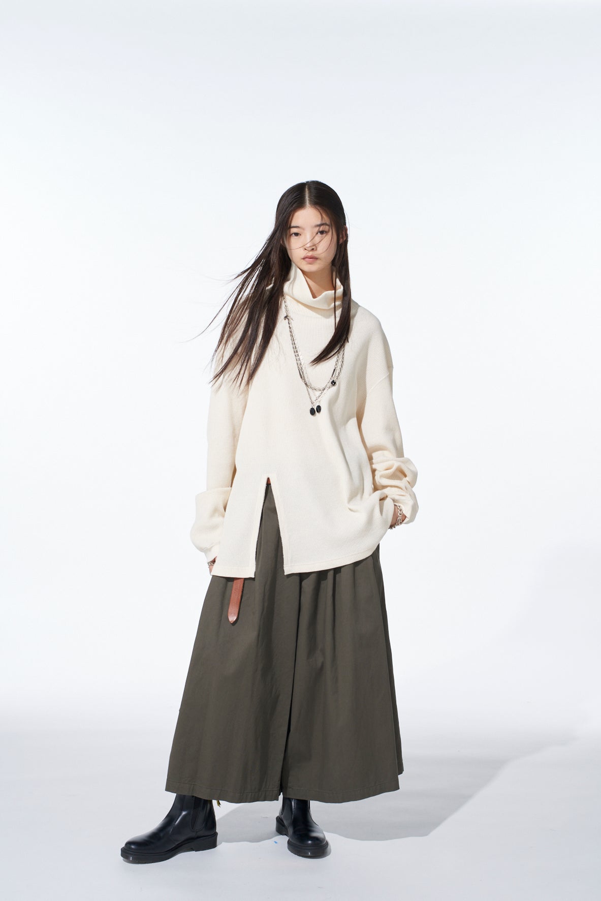 This long-sleeve top features a turtle neck made of soft cotton waffle thermal material. It offers a comfortable feel, perfect for everyday wear. The neckline creates a voluminous effect that adds a three-dimensional silhouette. A slit on the front right enhances mobility and casualness. Available in two color variations.