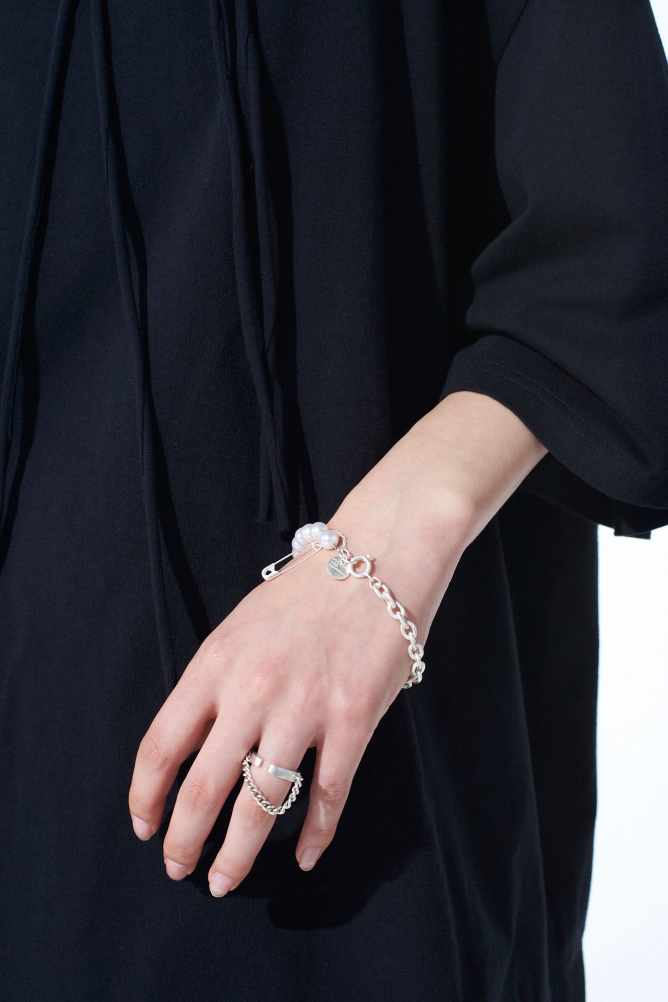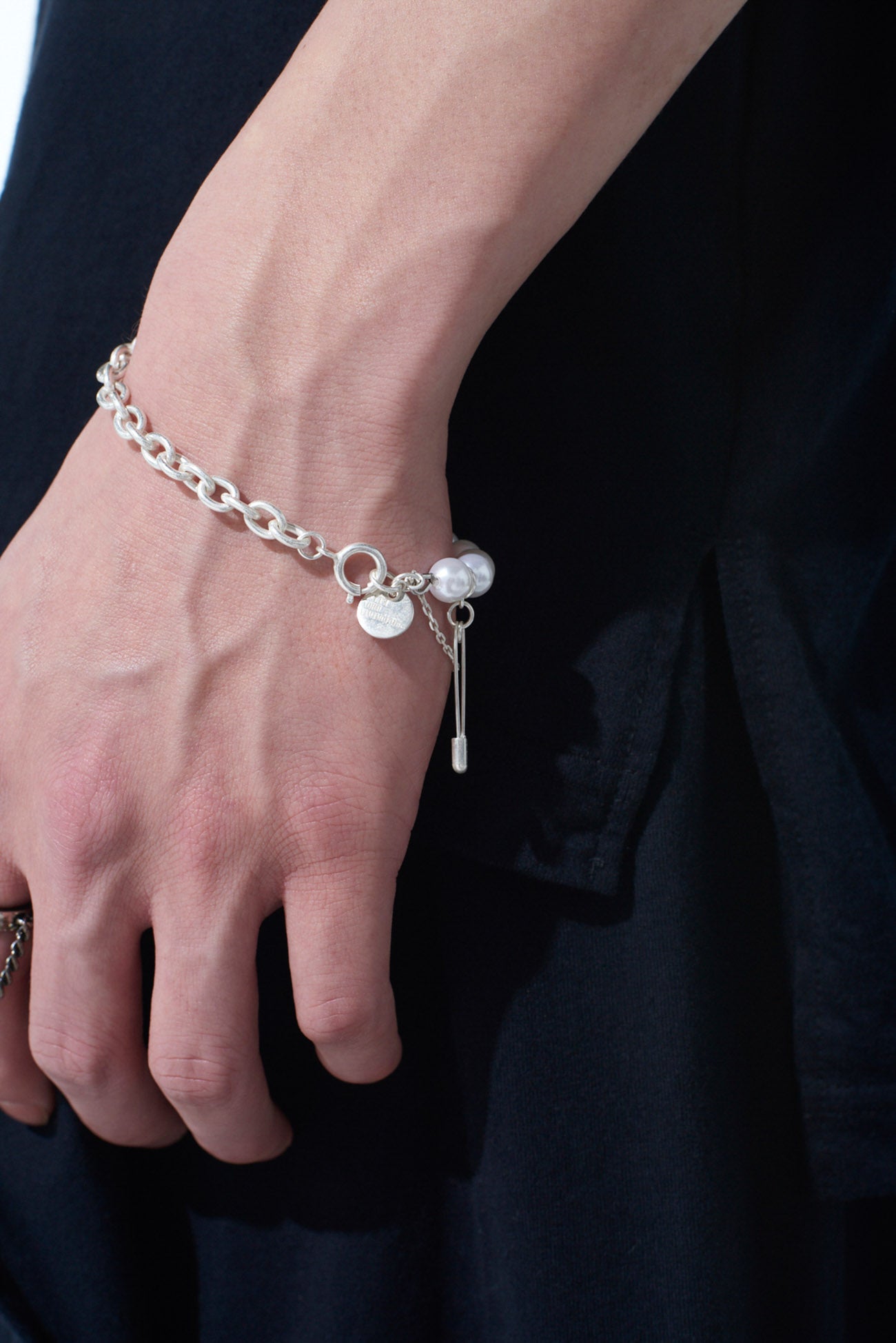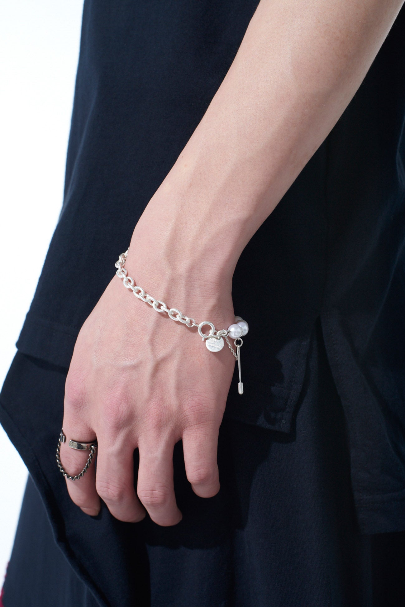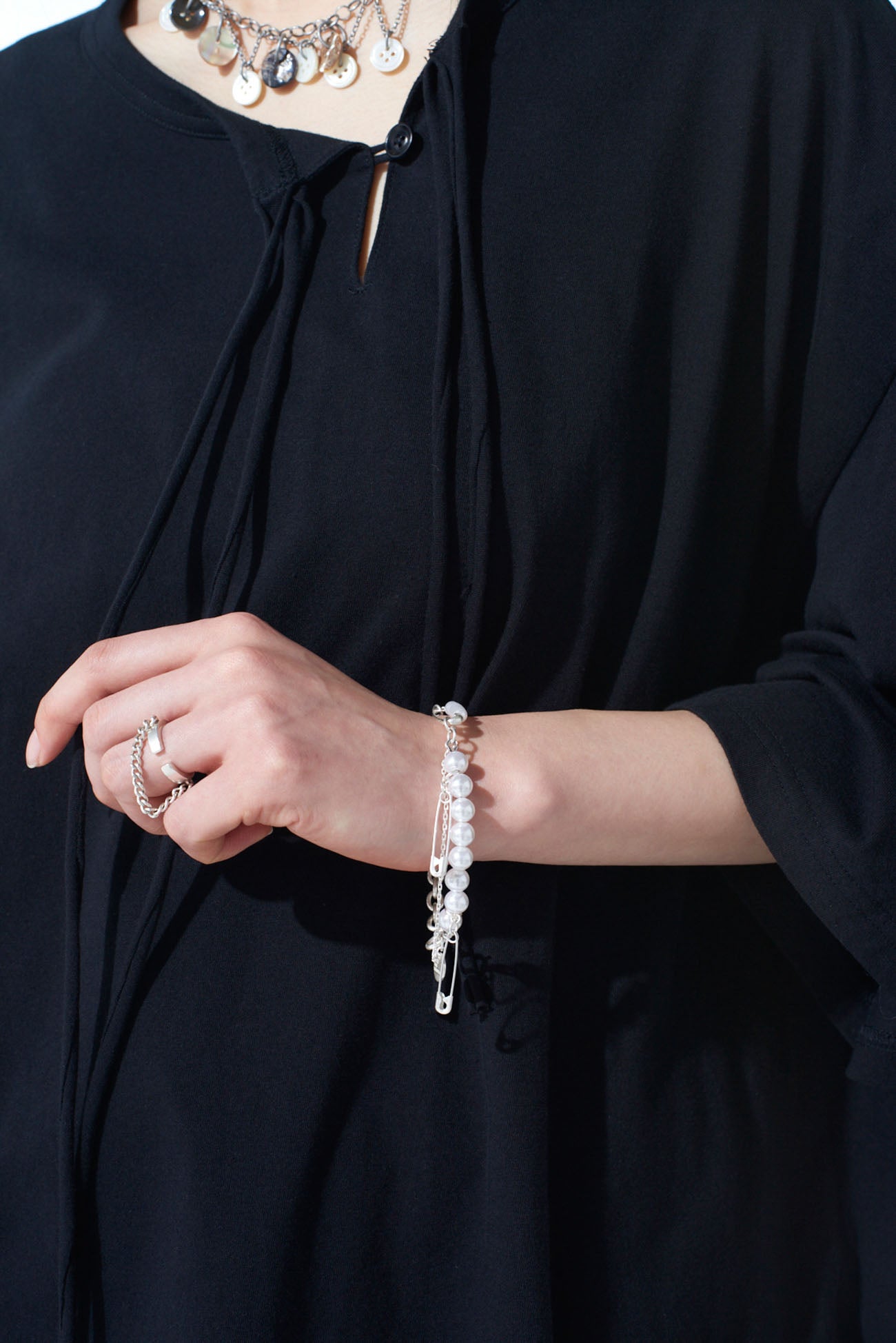 Esta pulsera es una combinación elegante pero punk de cadenas, perlas de imitación y imperdibles. Presenta múltiples capas de diseño que varían según el ángulo y el estilo de uso. Con el tiempo, adquiere un tono similar al de un objeto antiguo. Se combina bien con chokers o collares a juego para un conjunto coordinado.