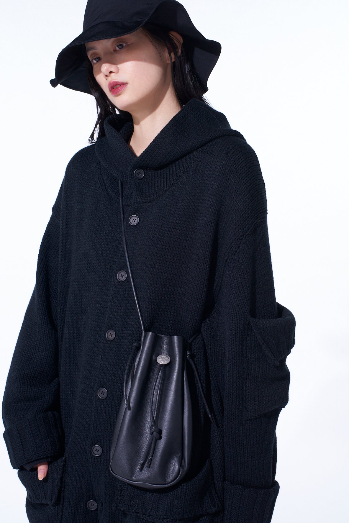 - Bolso de cuero con diseño de cordón, usable como bandolera o en el cuello.
