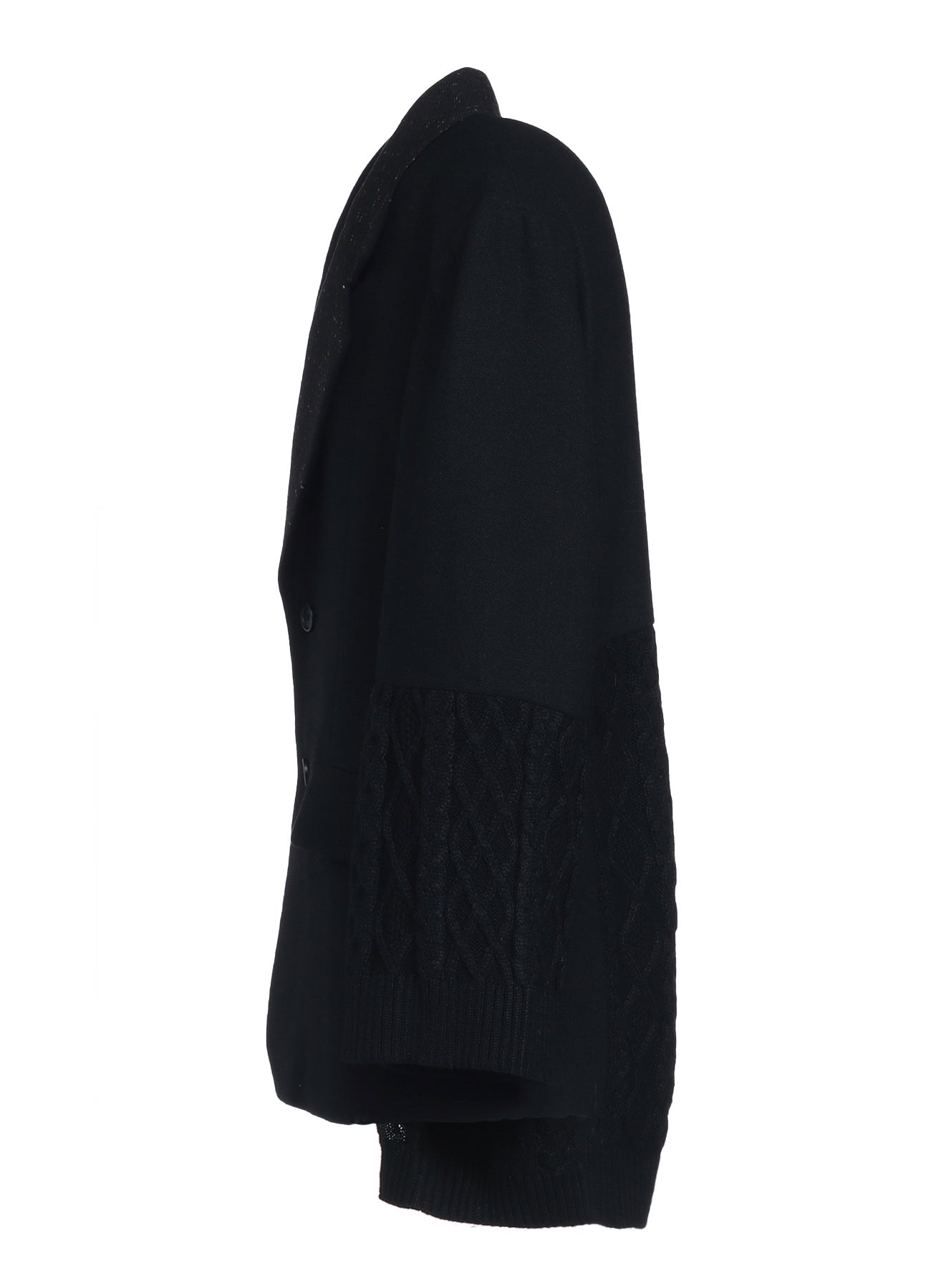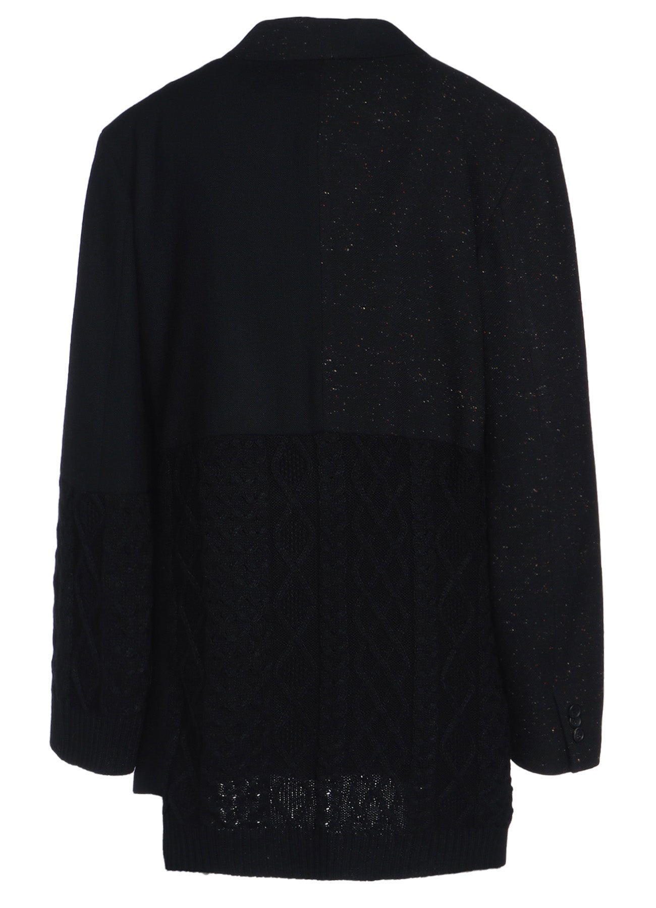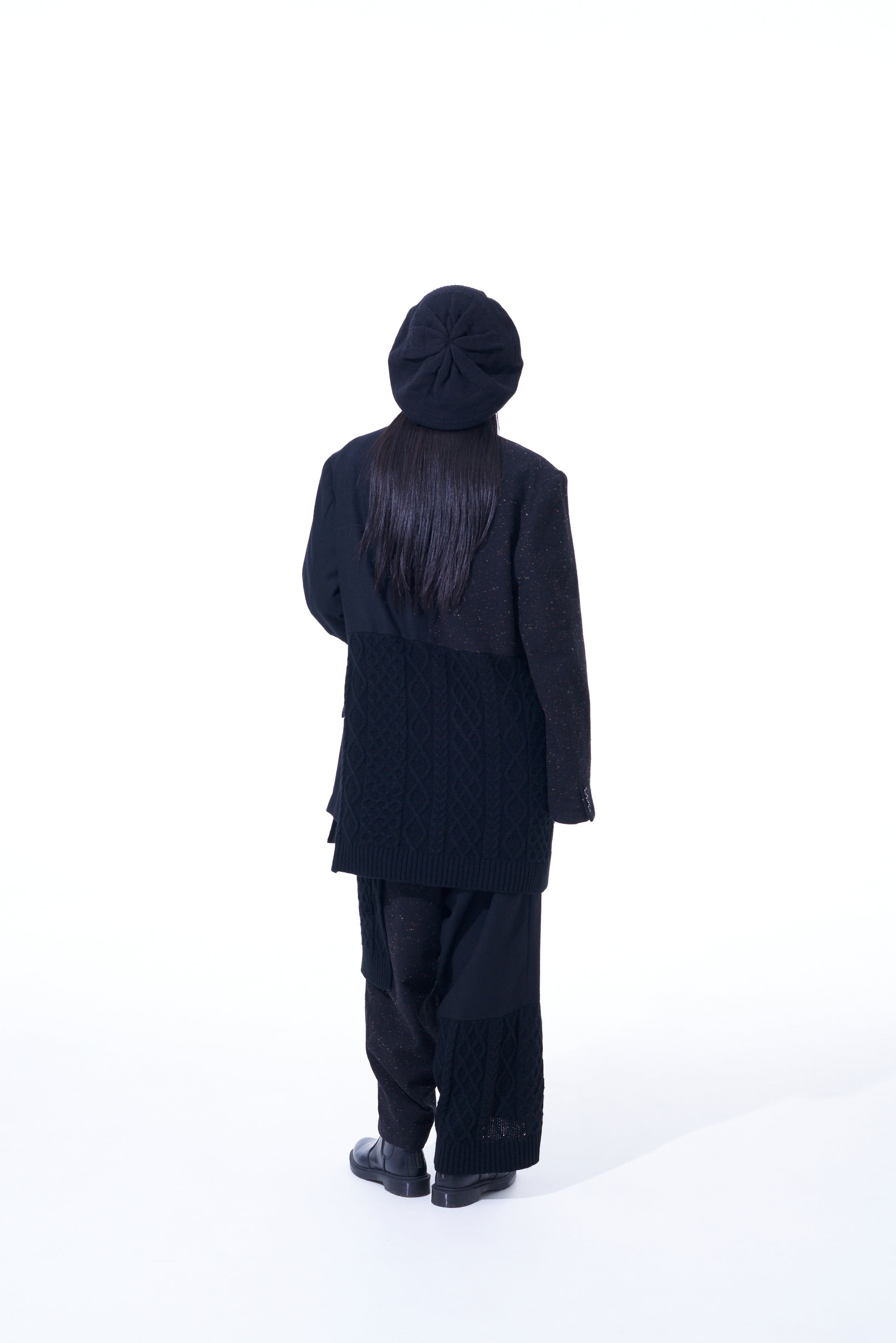 Una chaqueta elegante que combina tres materiales únicos: etamina de textura sólida, kersey acentuado con nudos de color y punto de cable. Diseñada hábilmente, equilibra la mezcla de estas telas con un volumen calculado y una posición de la combinación. Esta chaqueta fusiona la simplicidad clásica con elementos vanguardistas, presentando un dobladillo asimétrico para una estética fresca.