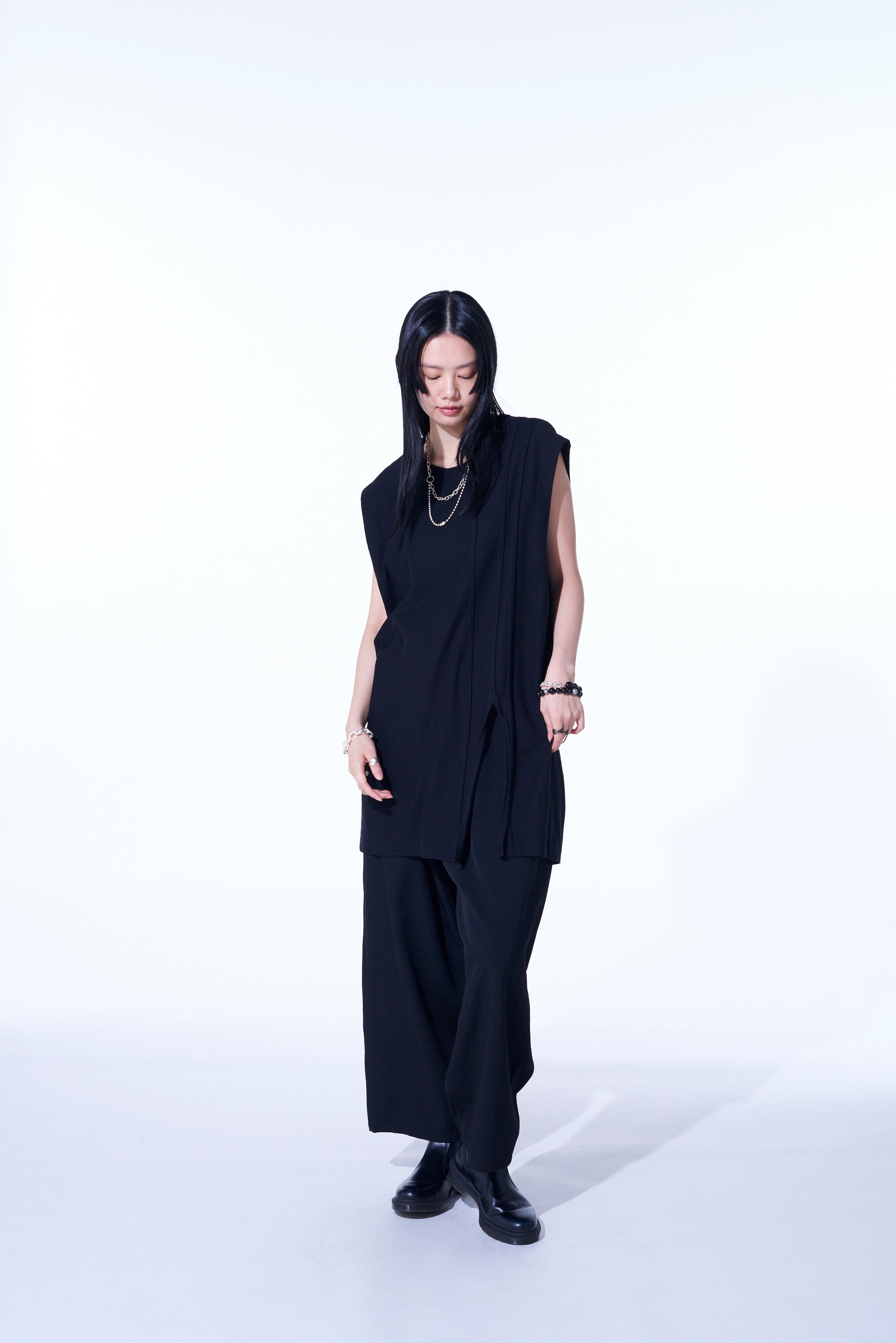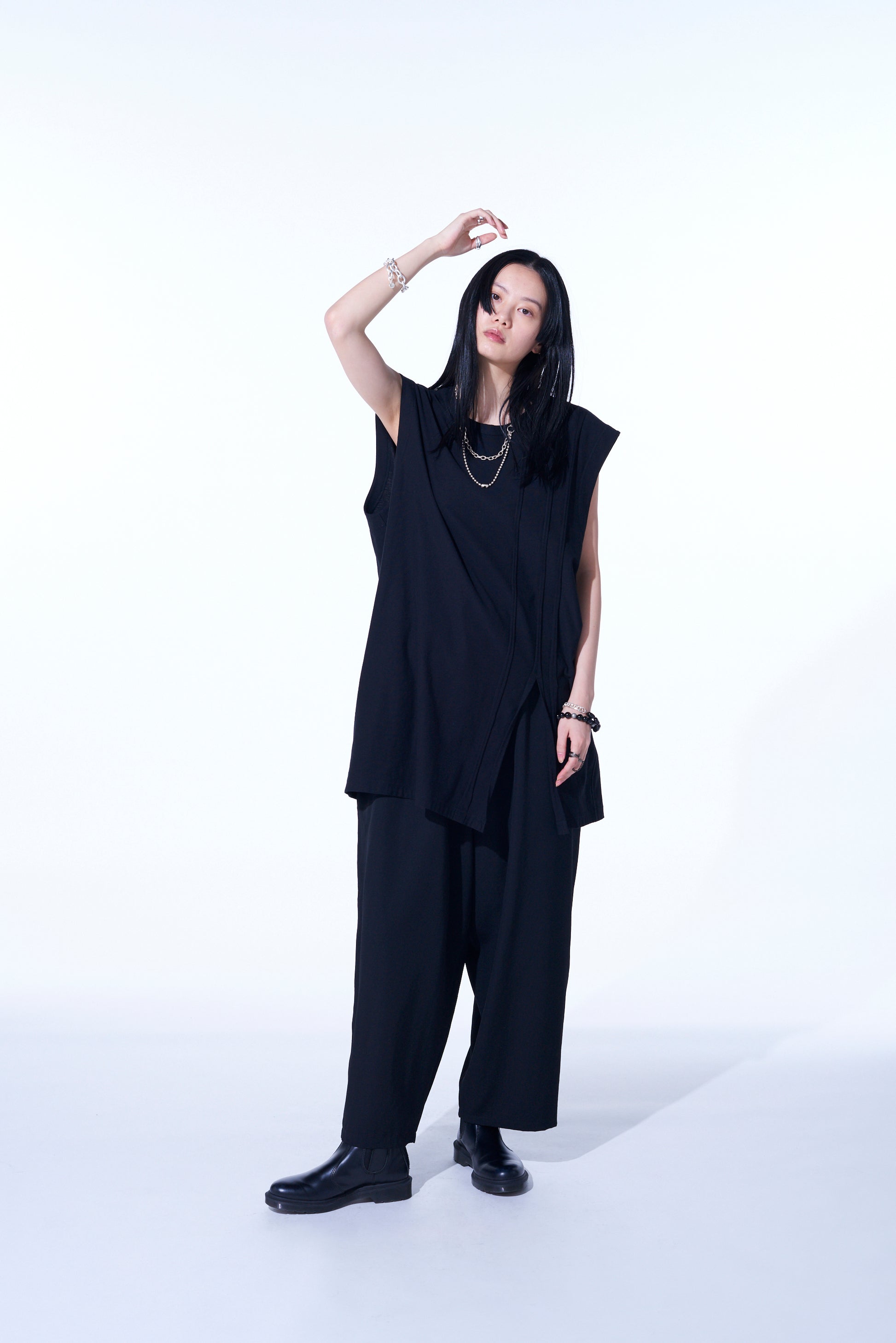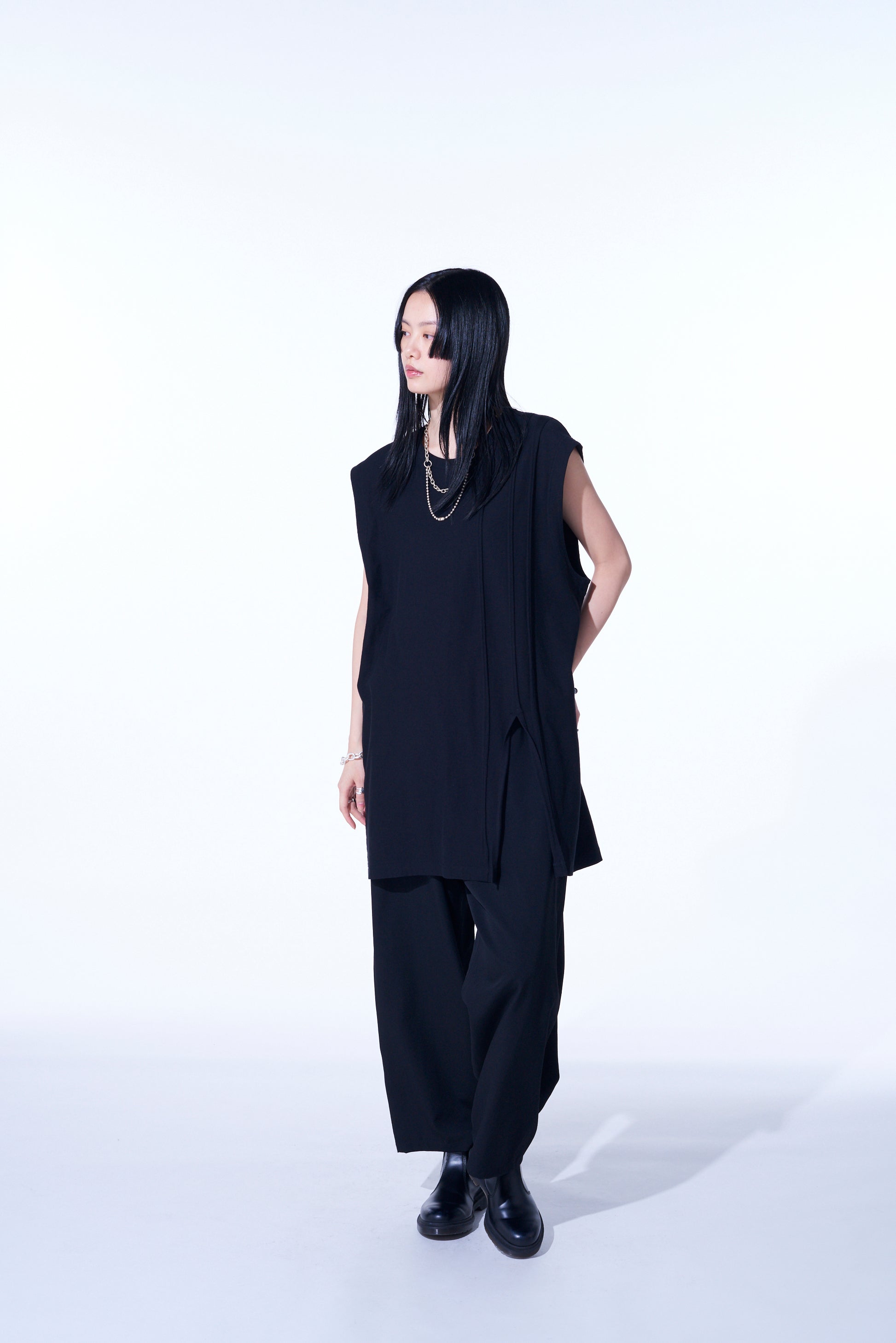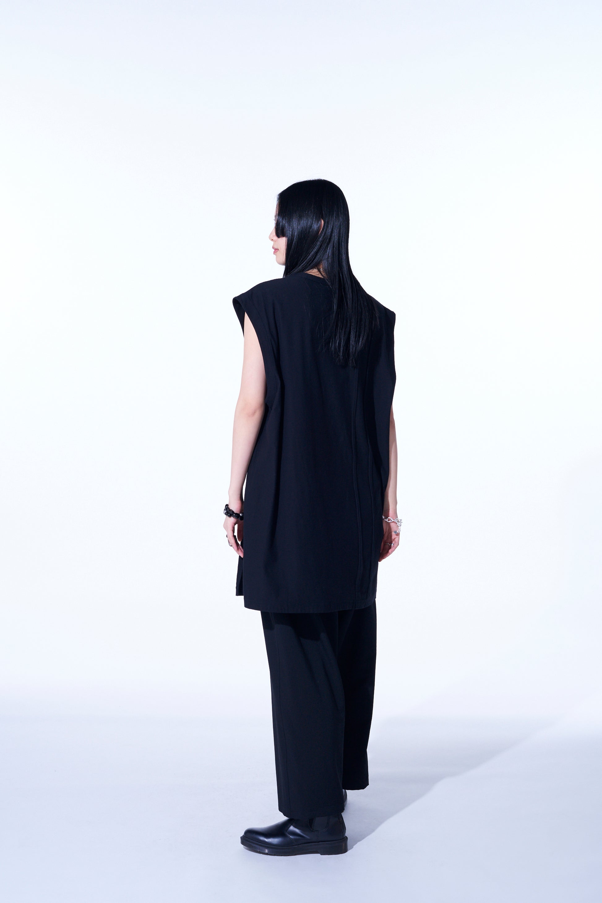 Este exclusivo top sin mangas presenta líneas de costura expuestas en el cuerpo, ofreciendo una combinación de diseño distintiva. Los bordes sin terminar crean un efecto de rayas redondeadas y aleatorias, perfecto tanto para atuendos independientes como para capas. El dobladillo con aberturas añade ligereza, con una longitud más larga que realza el apilamiento. Hecho de tela de punto liso 30/1 para suavidad y durabilidad.
