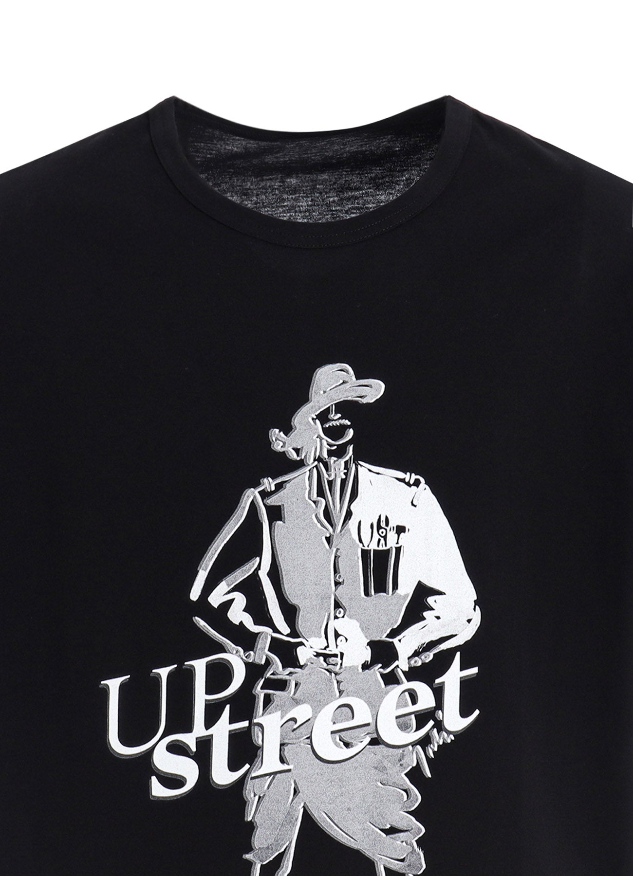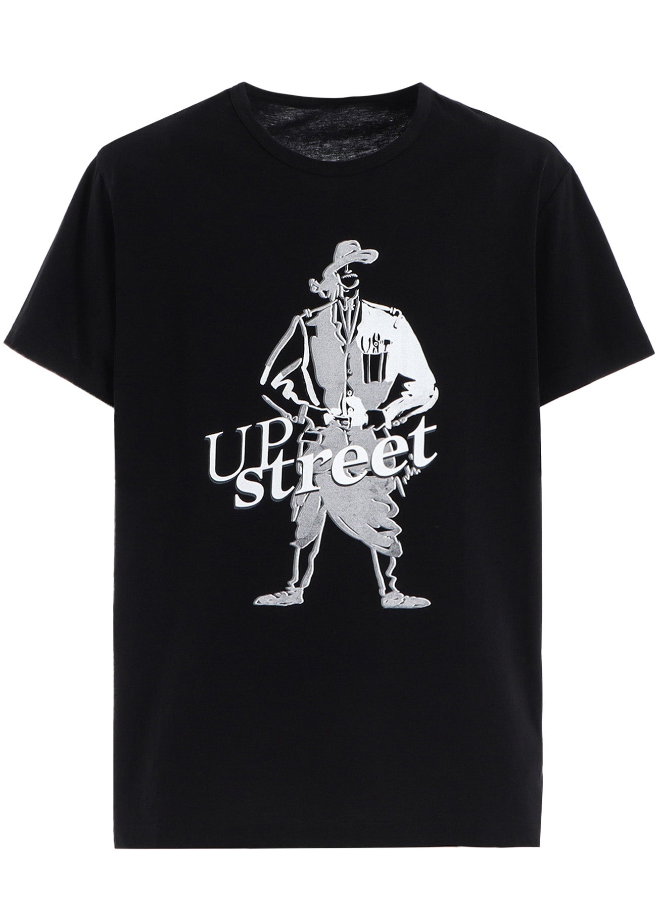 Esta camiseta de algodón de alta calidad presenta un estampado de dibujo de Yohji Yamamoto, combinado con el logo de UPstreet bajo el tema "trabajadores". Su ajuste relajado y de una sola talla la convierte en una prenda unisex y versátil, ideal para uso diario.