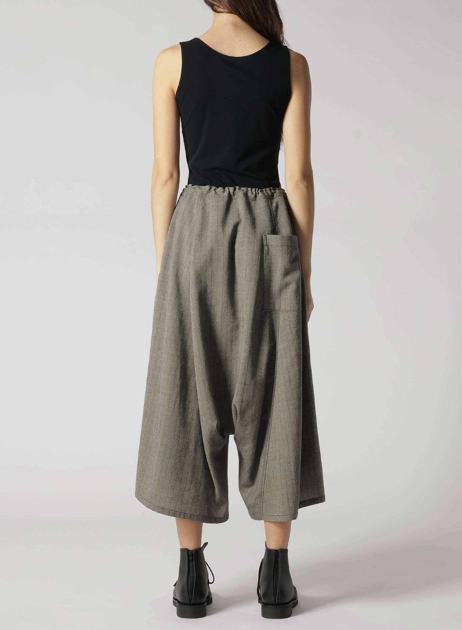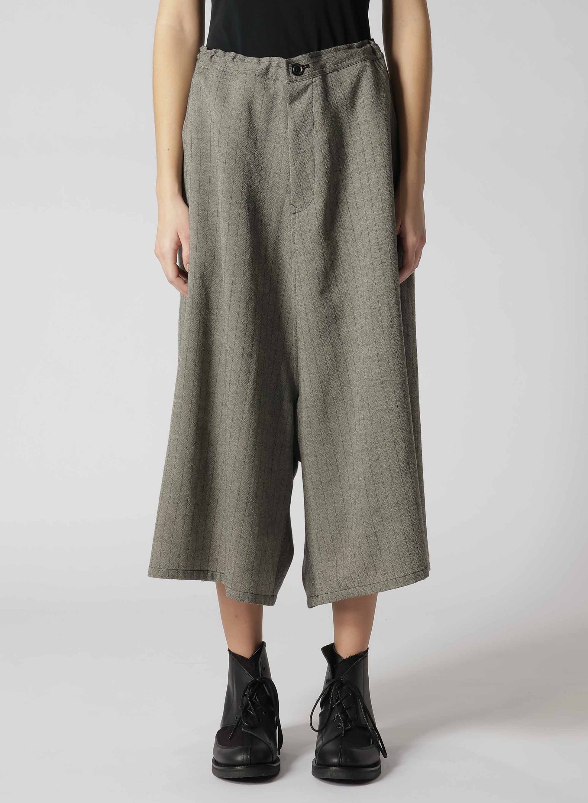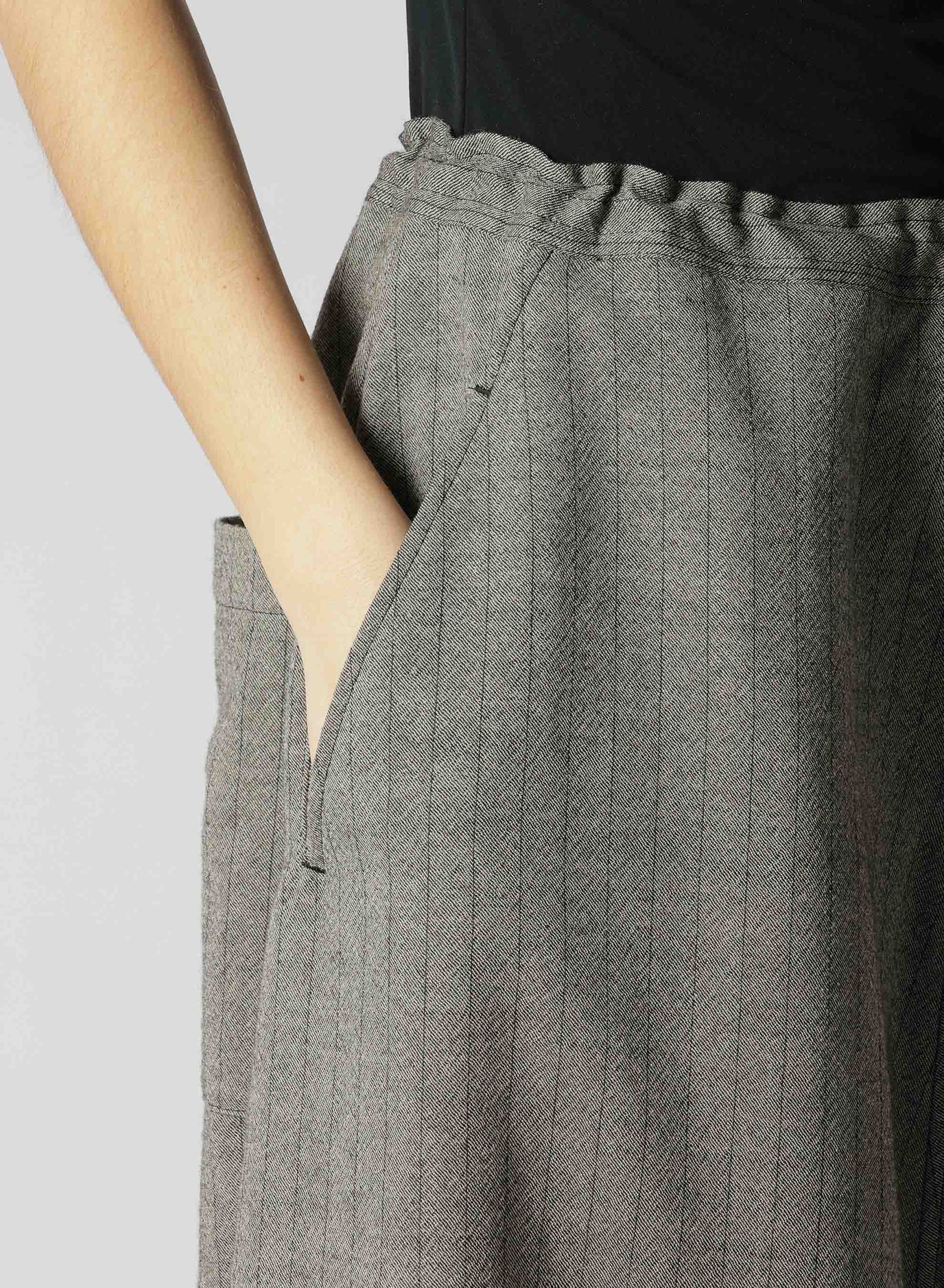 Estos pantalones sarouel de lana a rayas cuentan con una textura de fulled para una sensación arrugada única. Caracterizados por una cintura alta, ofrecen un ajuste cómodo similar a una falda. Ajustables con un cordón en la cintura, pero deben manejarse con cuidado para evitar deslizamientos por tirones excesivos.