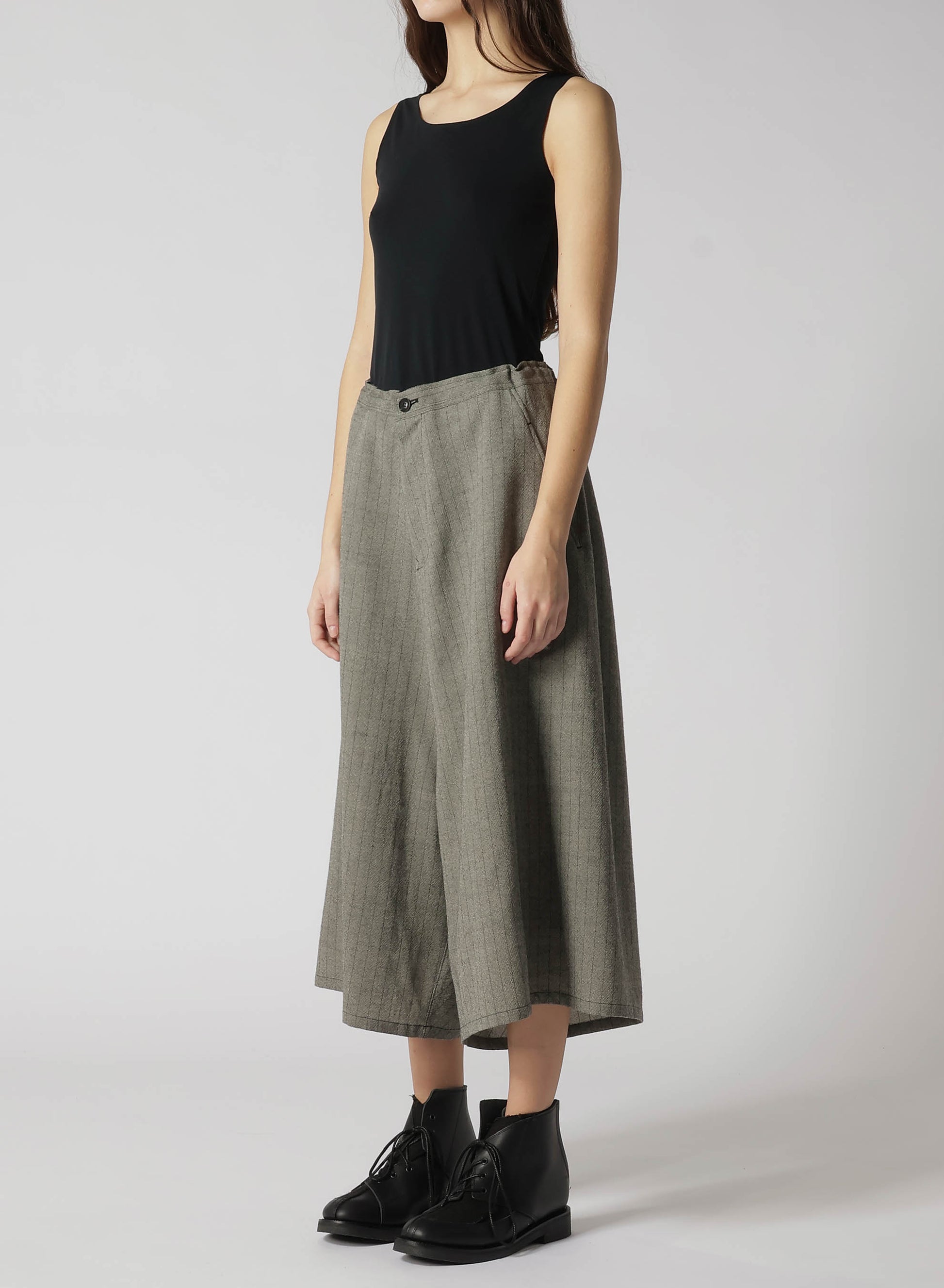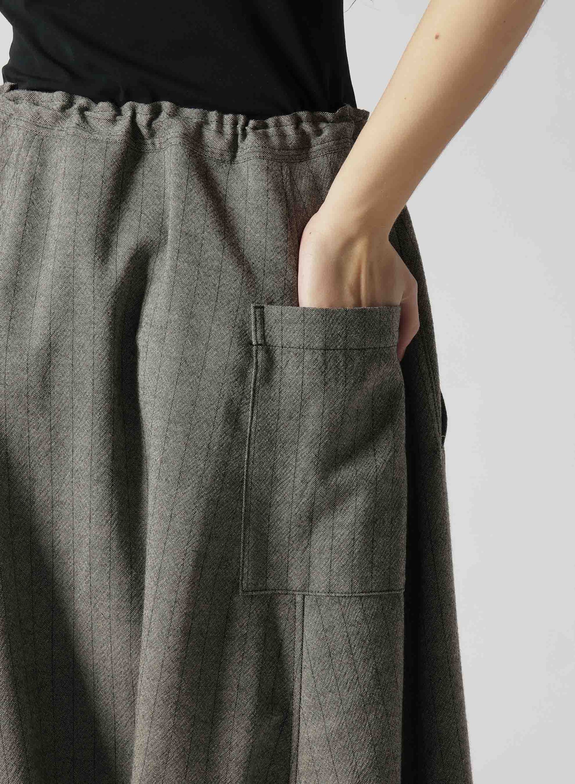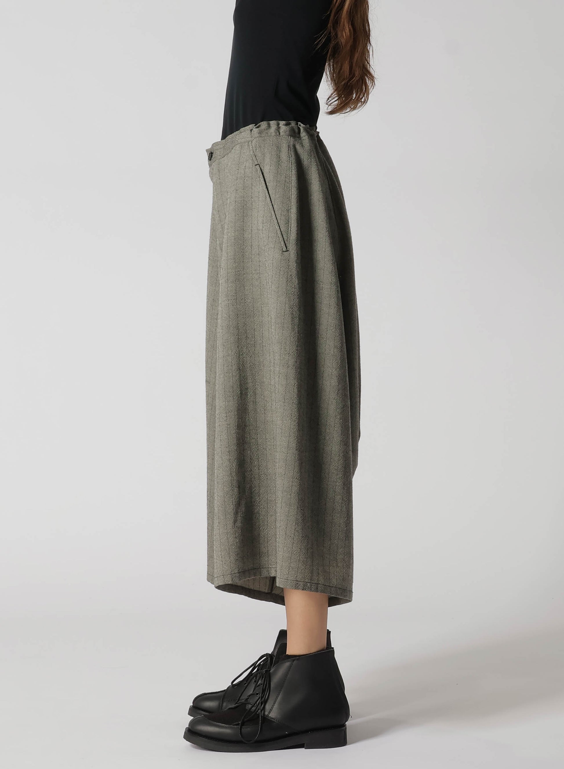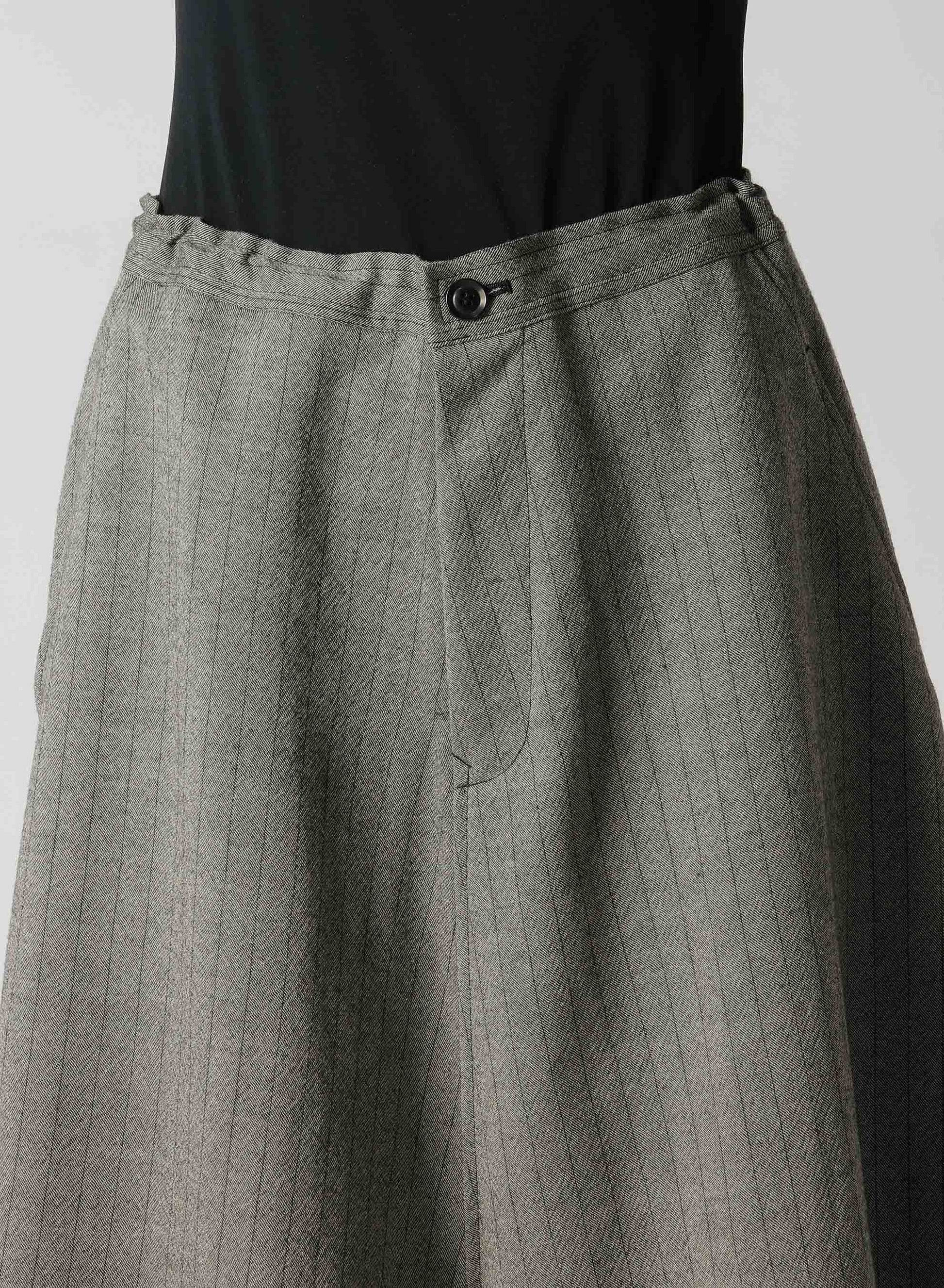 Estos pantalones sarouel de lana a rayas cuentan con una textura de fulled para una sensación arrugada única. Caracterizados por una cintura alta, ofrecen un ajuste cómodo similar a una falda. Ajustables con un cordón en la cintura, pero deben manejarse con cuidado para evitar deslizamientos por tirones excesivos.
