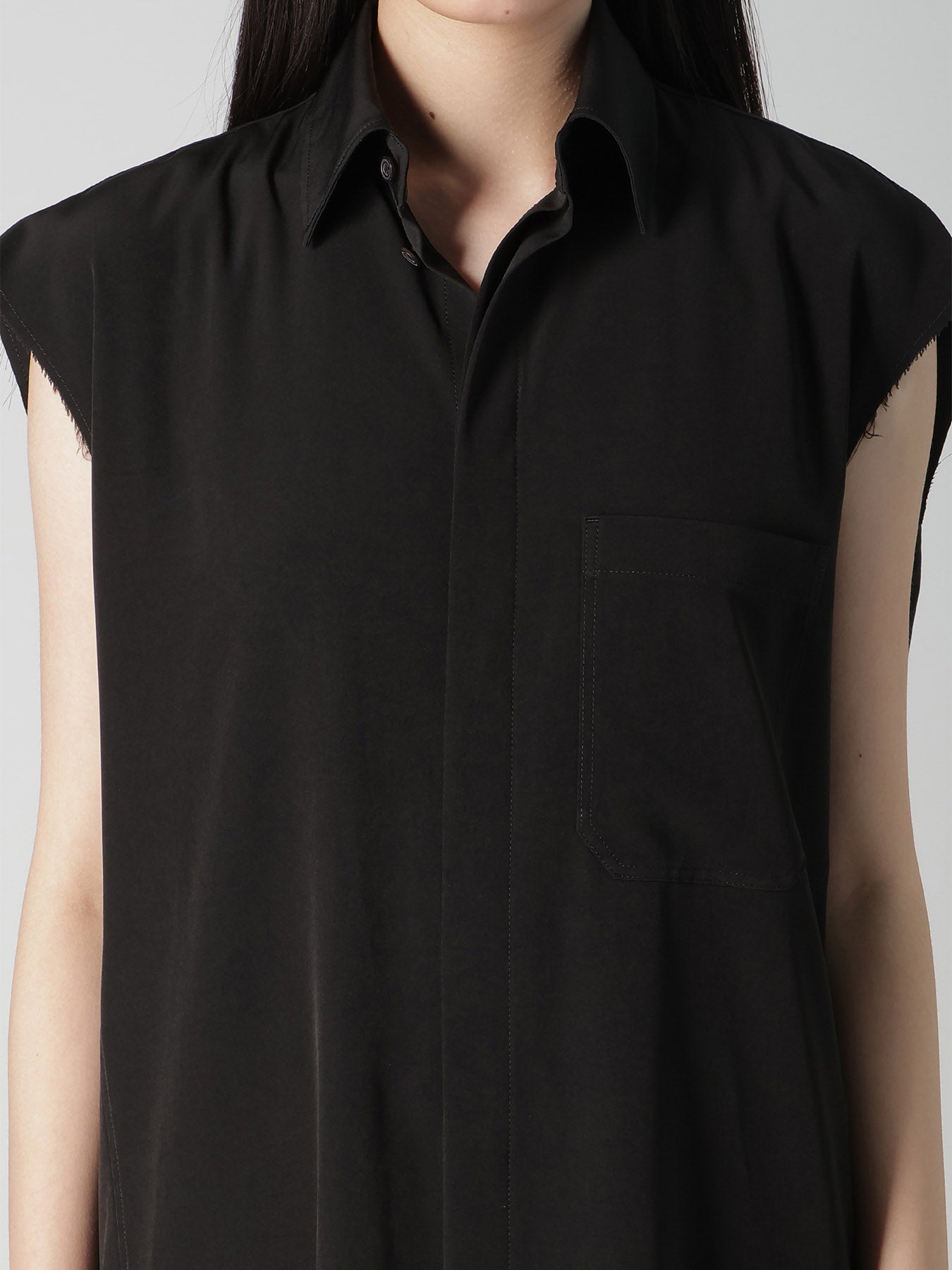 This sleeveless dress, made from signature triacetate/polyester fabric, offers a soft sheen and luxurious feel with a smooth touch and elegant drapery. Its design mimics long-sleeve shirts with sleeves removed, and features a cut unfinished edge.