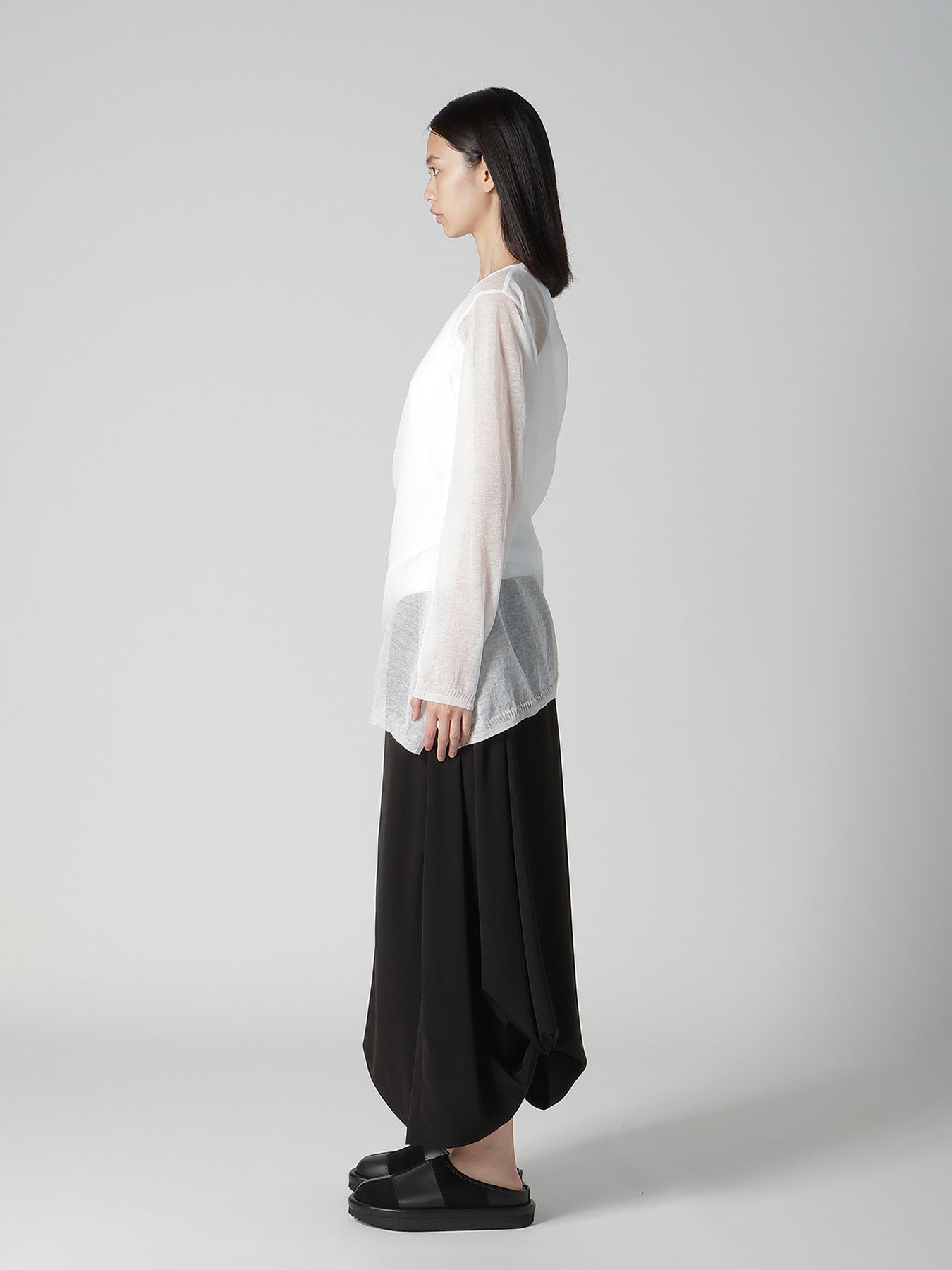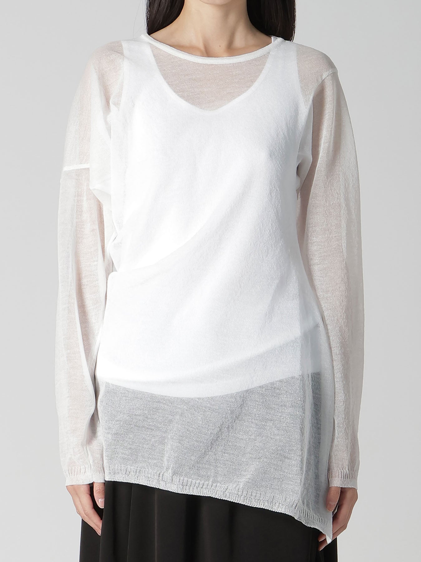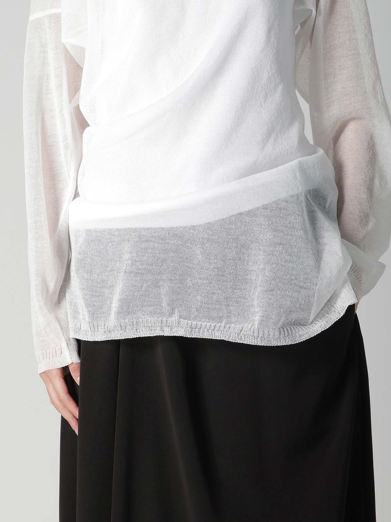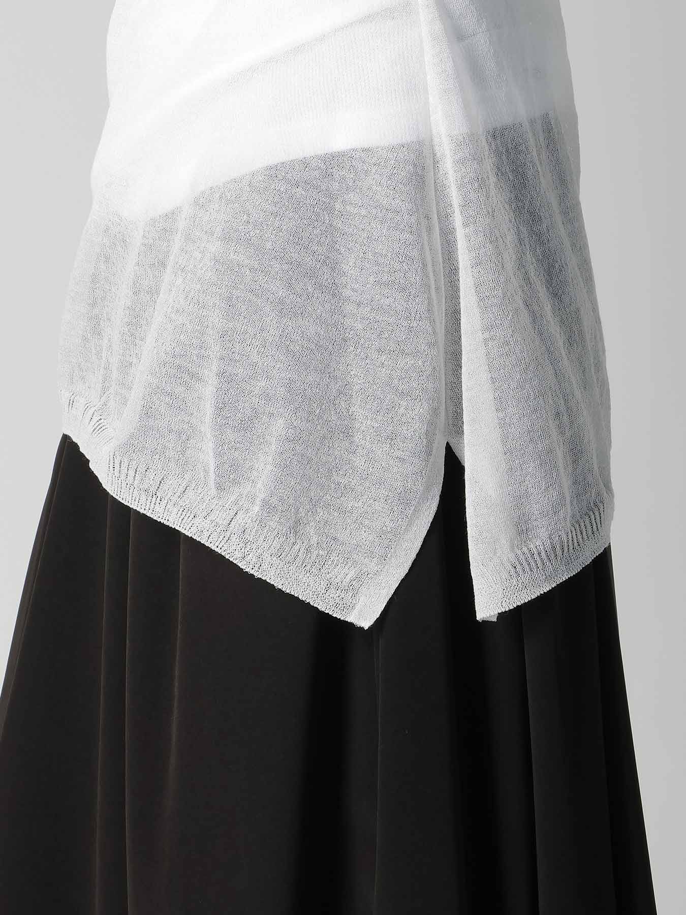 This knit stands out for its delicate transparency and fluid drapery. Featuring a twisted pattern, it creates a dimensional drape when worn. Lightweight and ideal for layering with inner wear, this piece offers a breezy wearing experience.