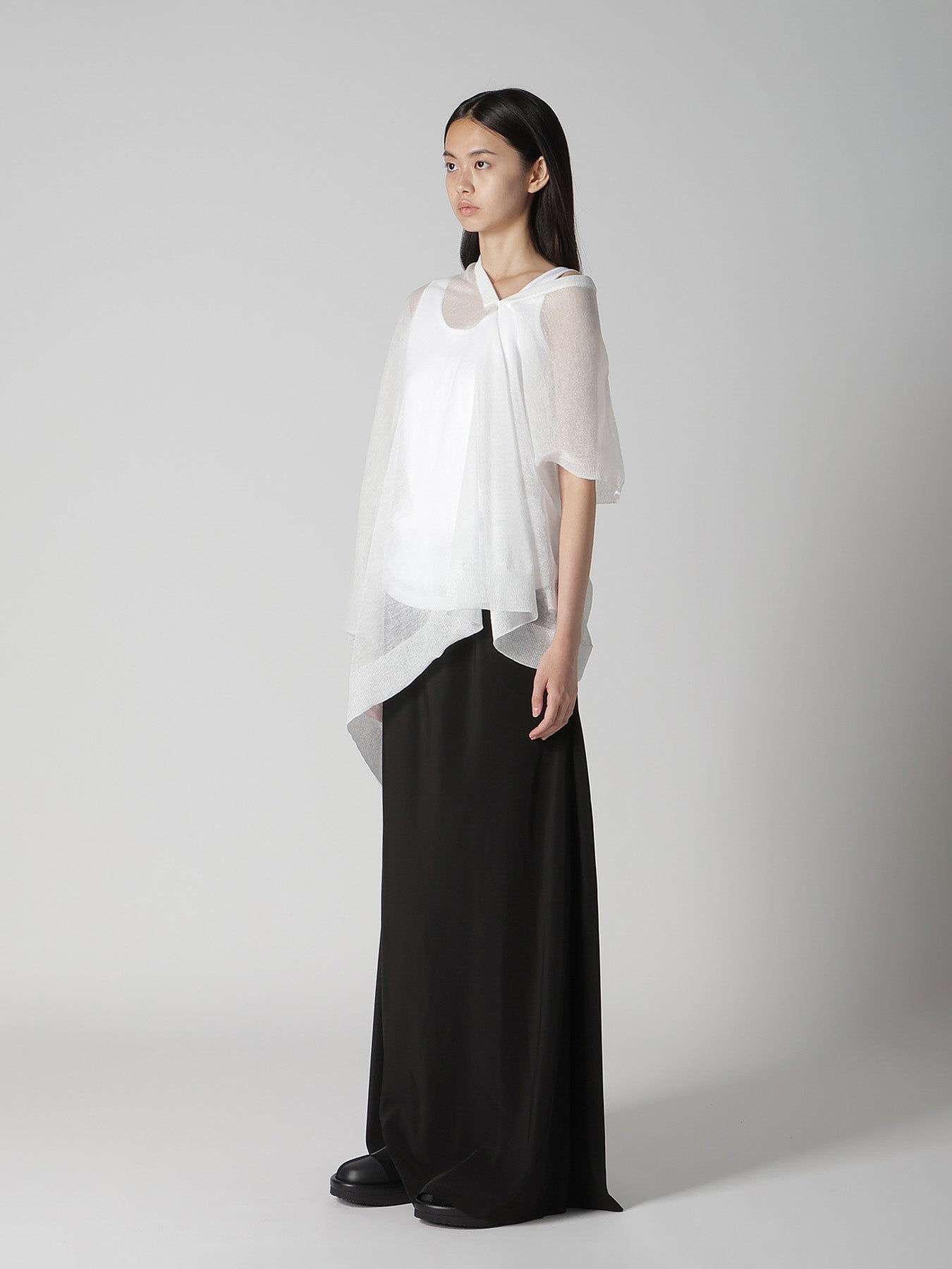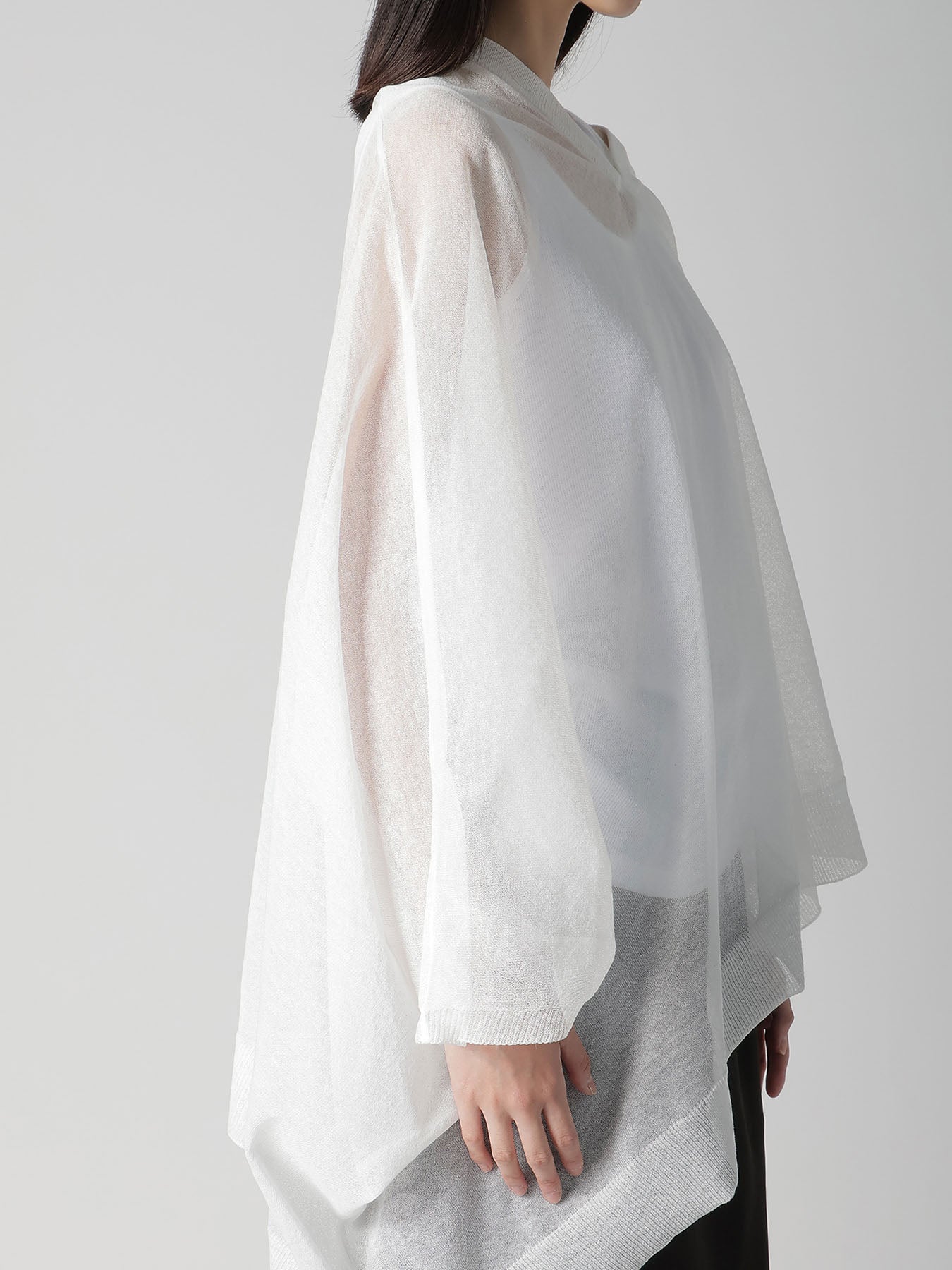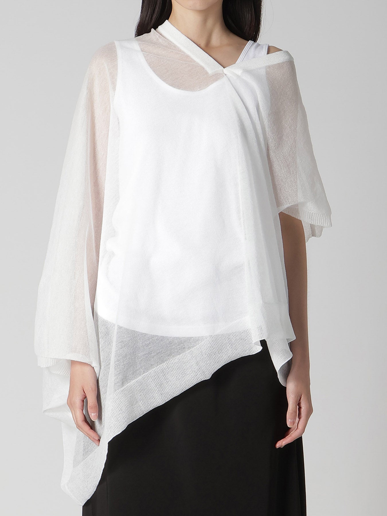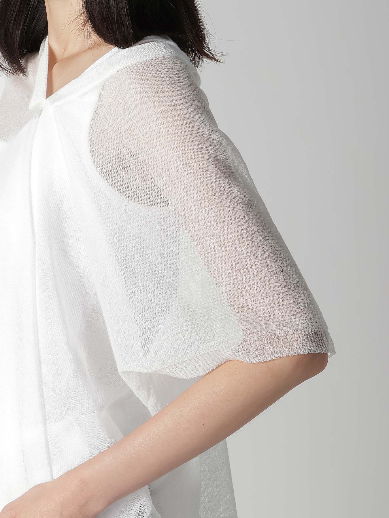 This knit vest features a delicate transparency and elegant drapery, offering a simple, straight pattern that transforms into a three-dimensional silhouette when worn. The style can be altered with layering, making it a recommended item for spring and summer.