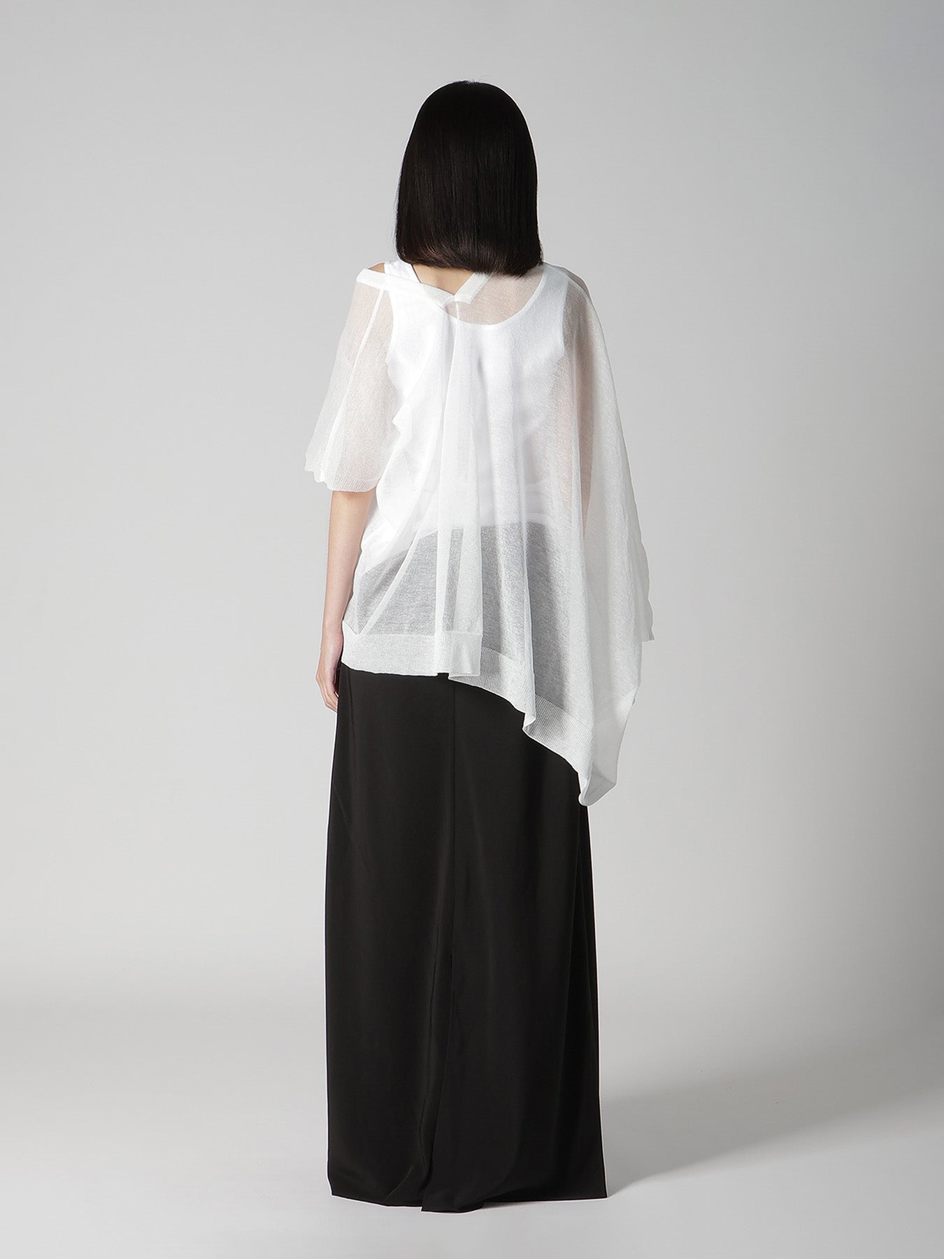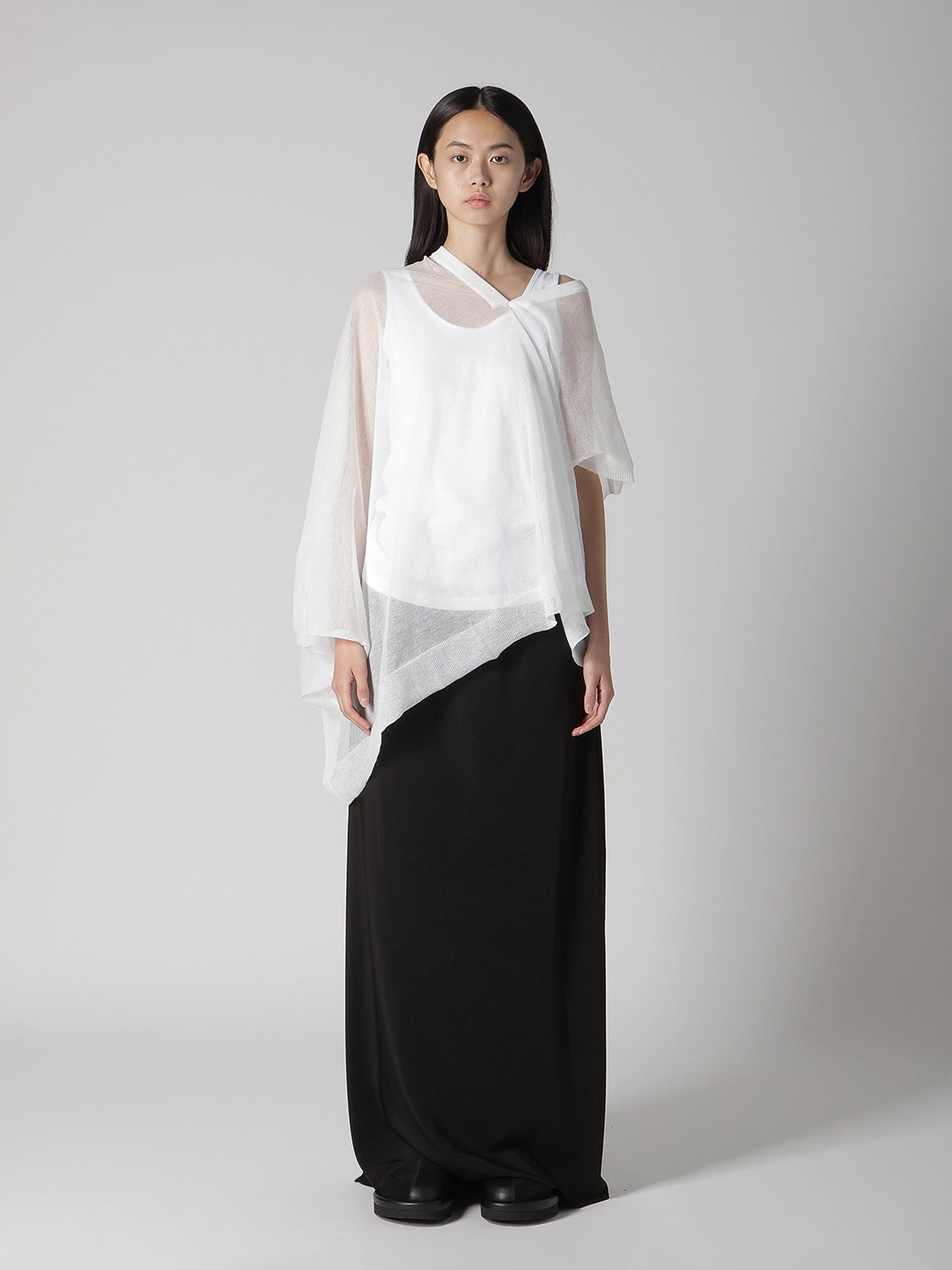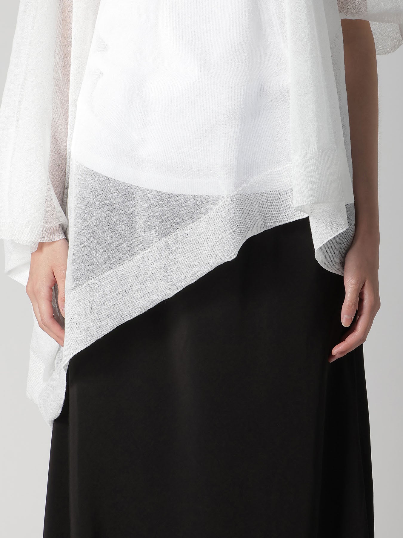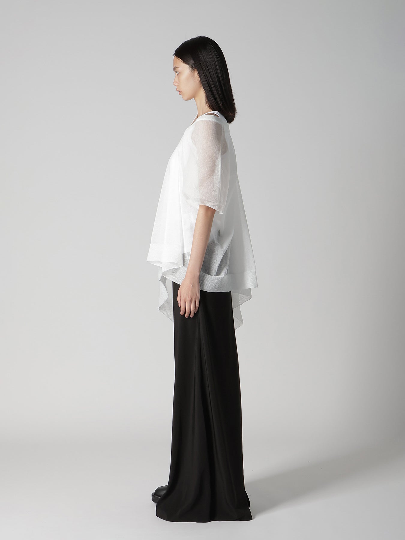This knit vest features a delicate transparency and elegant drapery, offering a simple, straight pattern that transforms into a three-dimensional silhouette when worn. The style can be altered with layering, making it a recommended item for spring and summer.