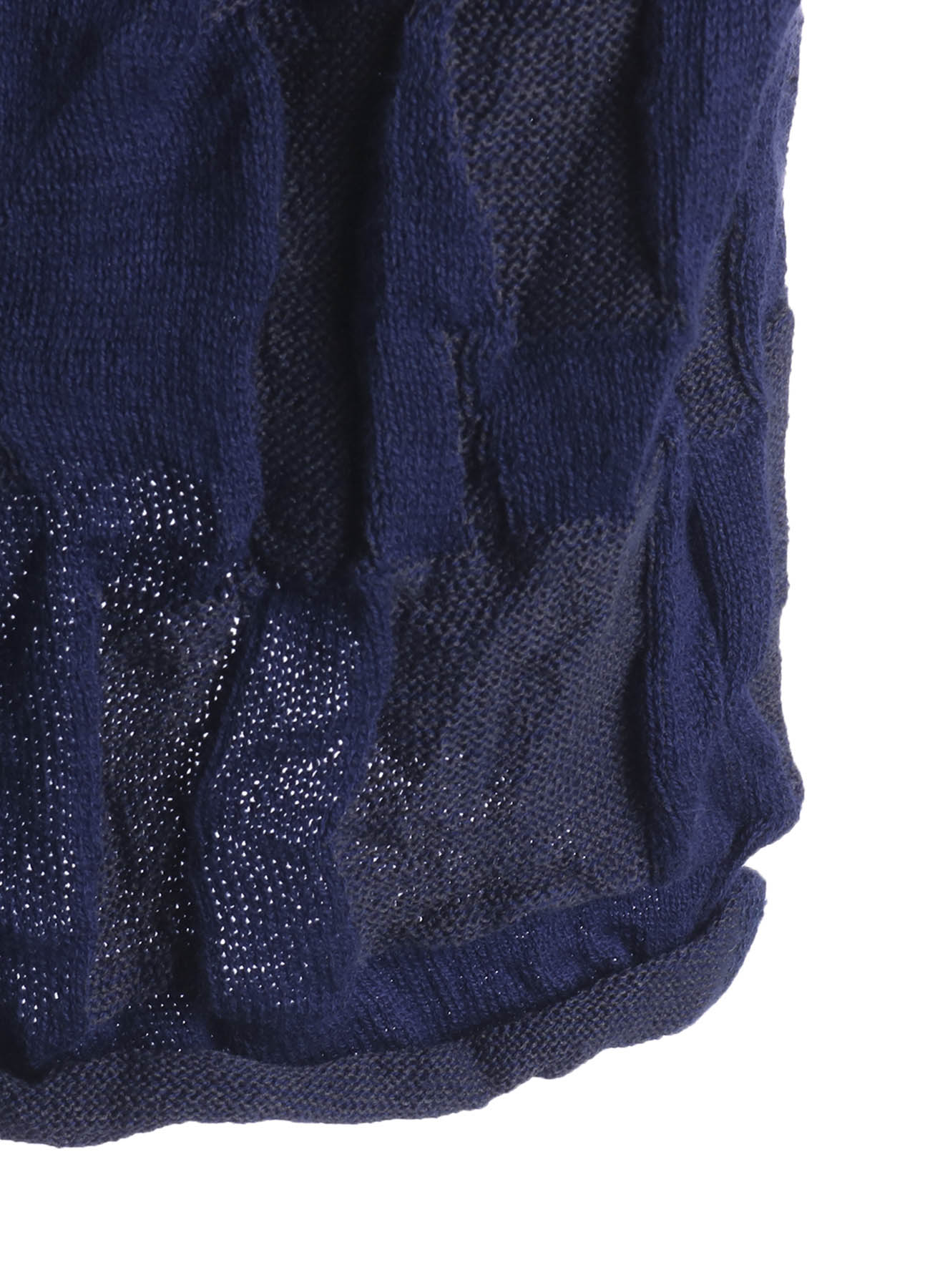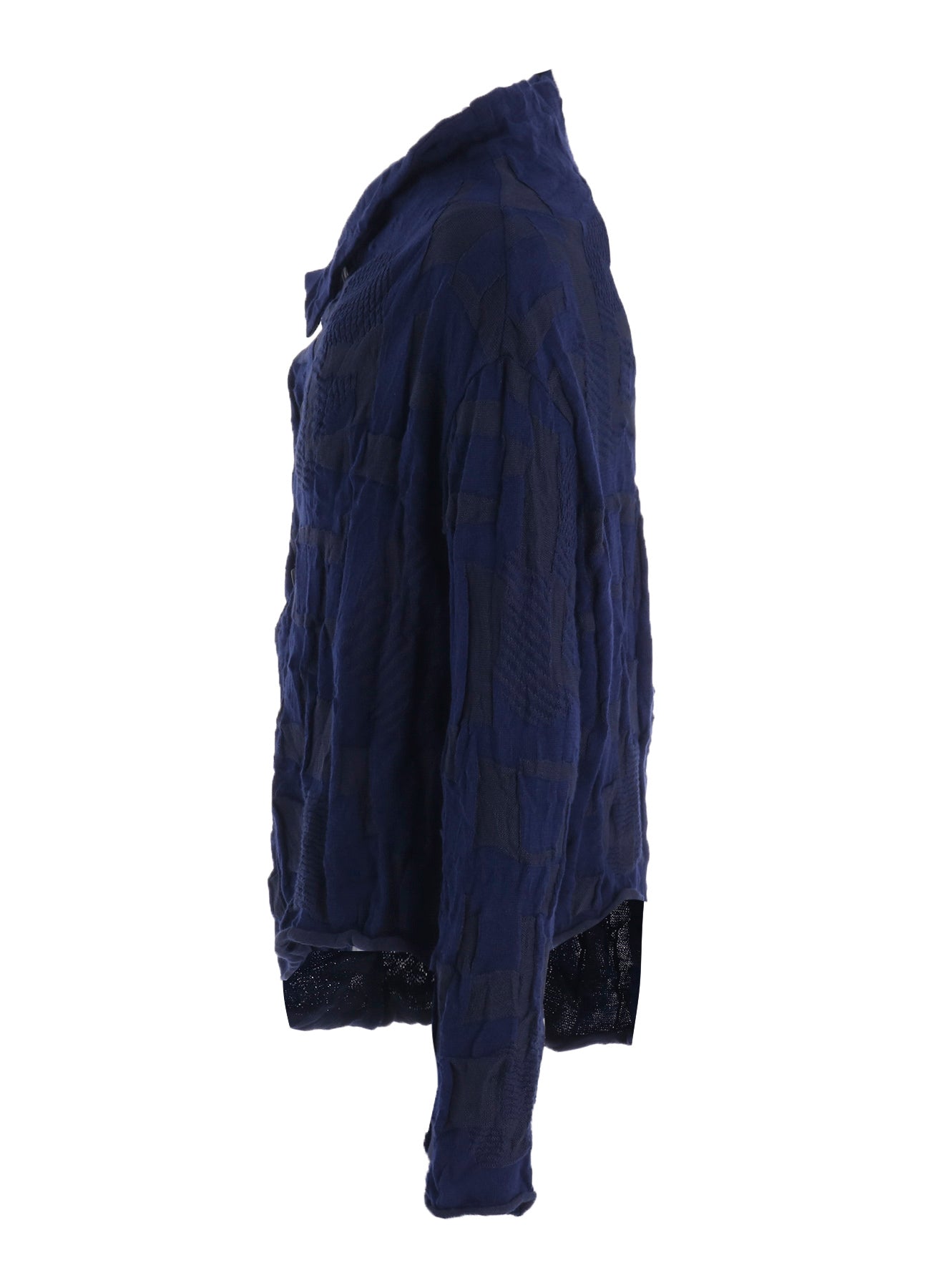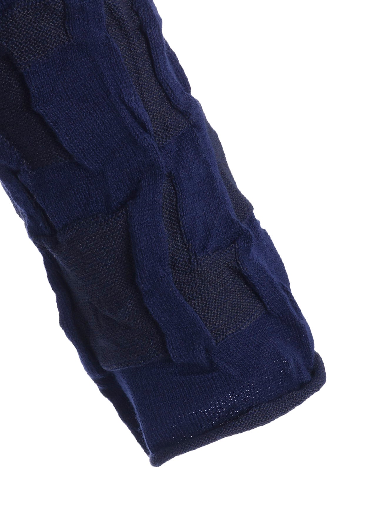 La popular chaqueta de punto arrugada de RISMAT by Y’s de esta temporada combina patrones circulares y cuadrados para crear un diseño de textura compleja. Esta chaqueta corta se caracteriza por una silueta asimétrica, ofreciendo un estilo moderno y único que destaca.