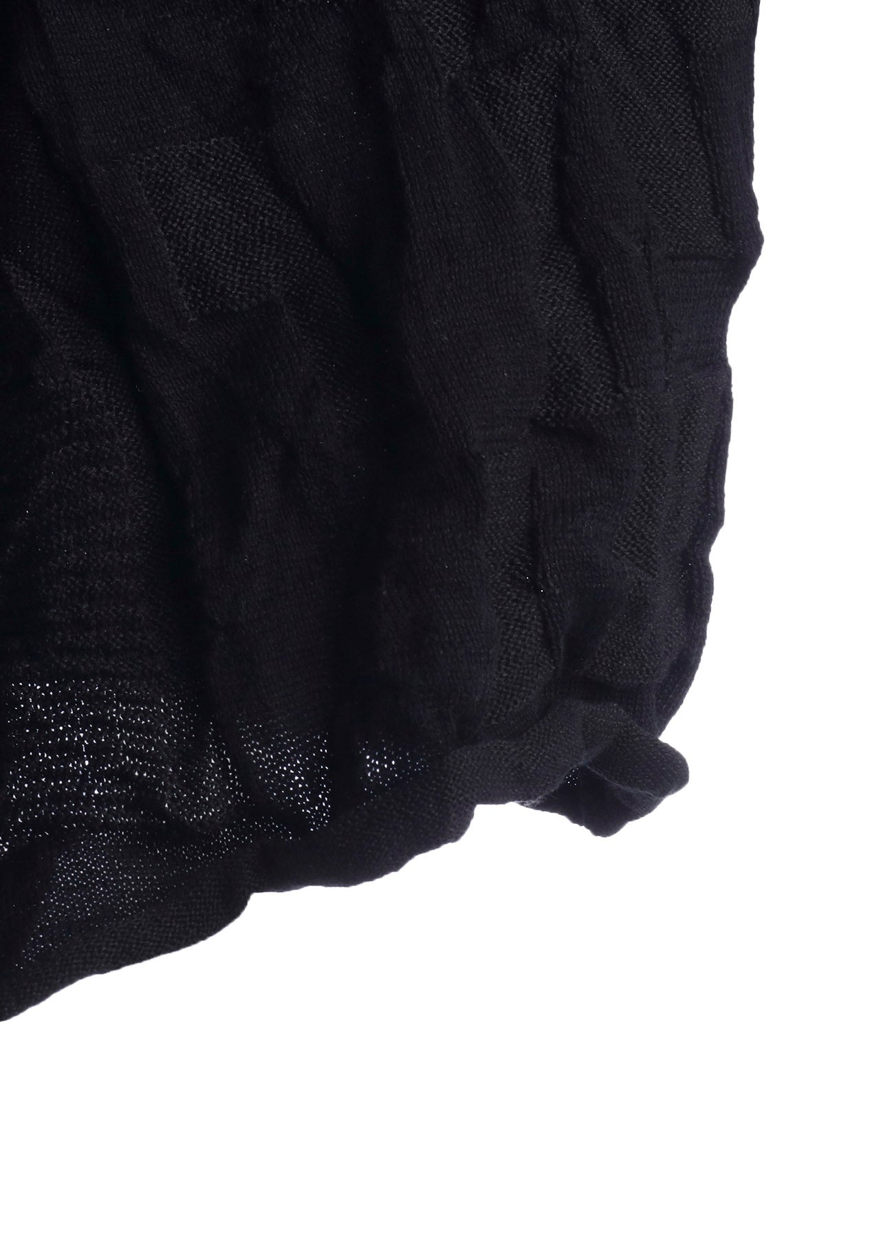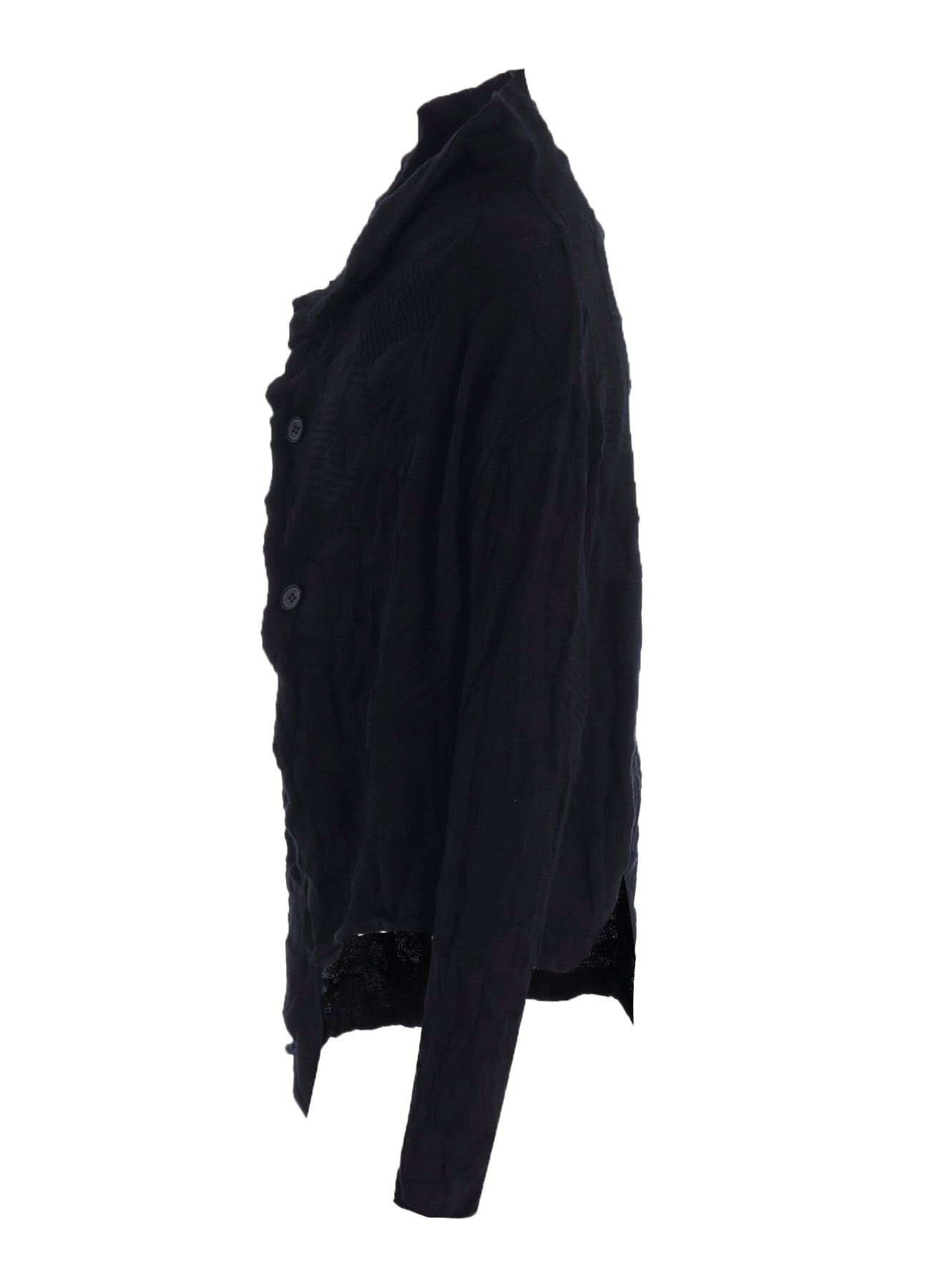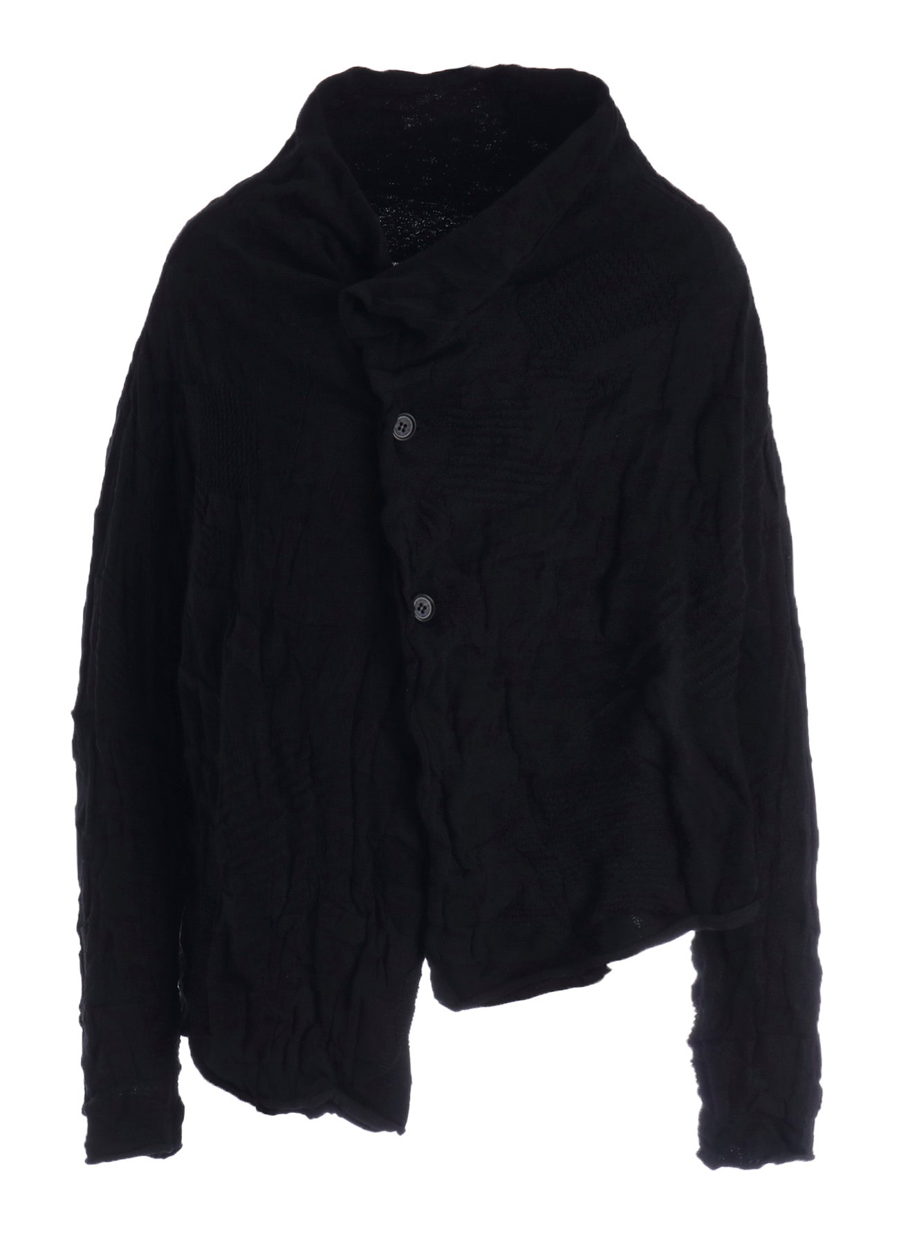 La popular chaqueta de punto arrugada RISMAT by Y's de esta temporada combina patrones circulares y cuadrados para crear un diseño texturizado complejo. Este cárdigan corto se caracteriza por una silueta asimétrica, ofreciendo un estilo único y moderno que destaca.