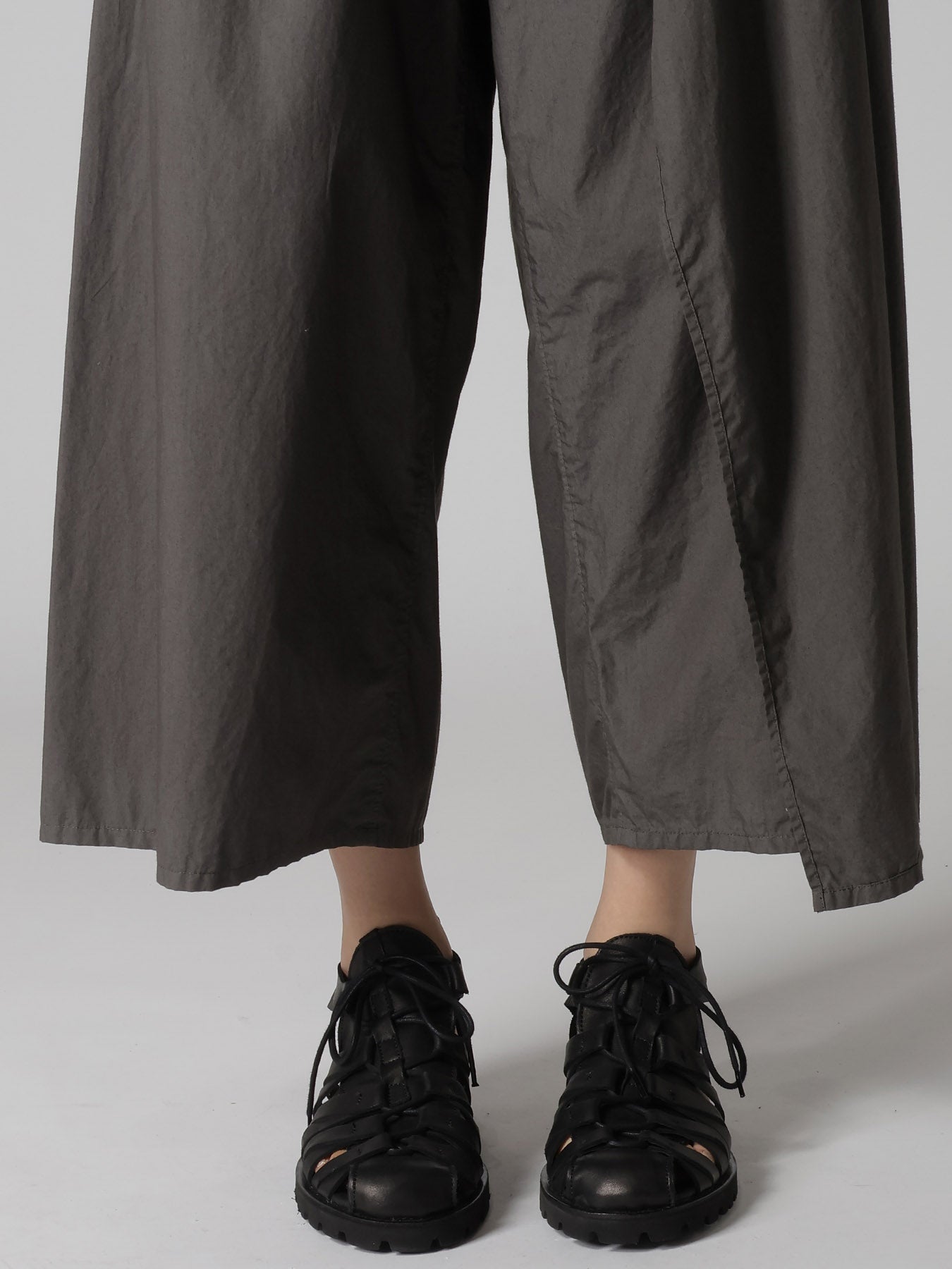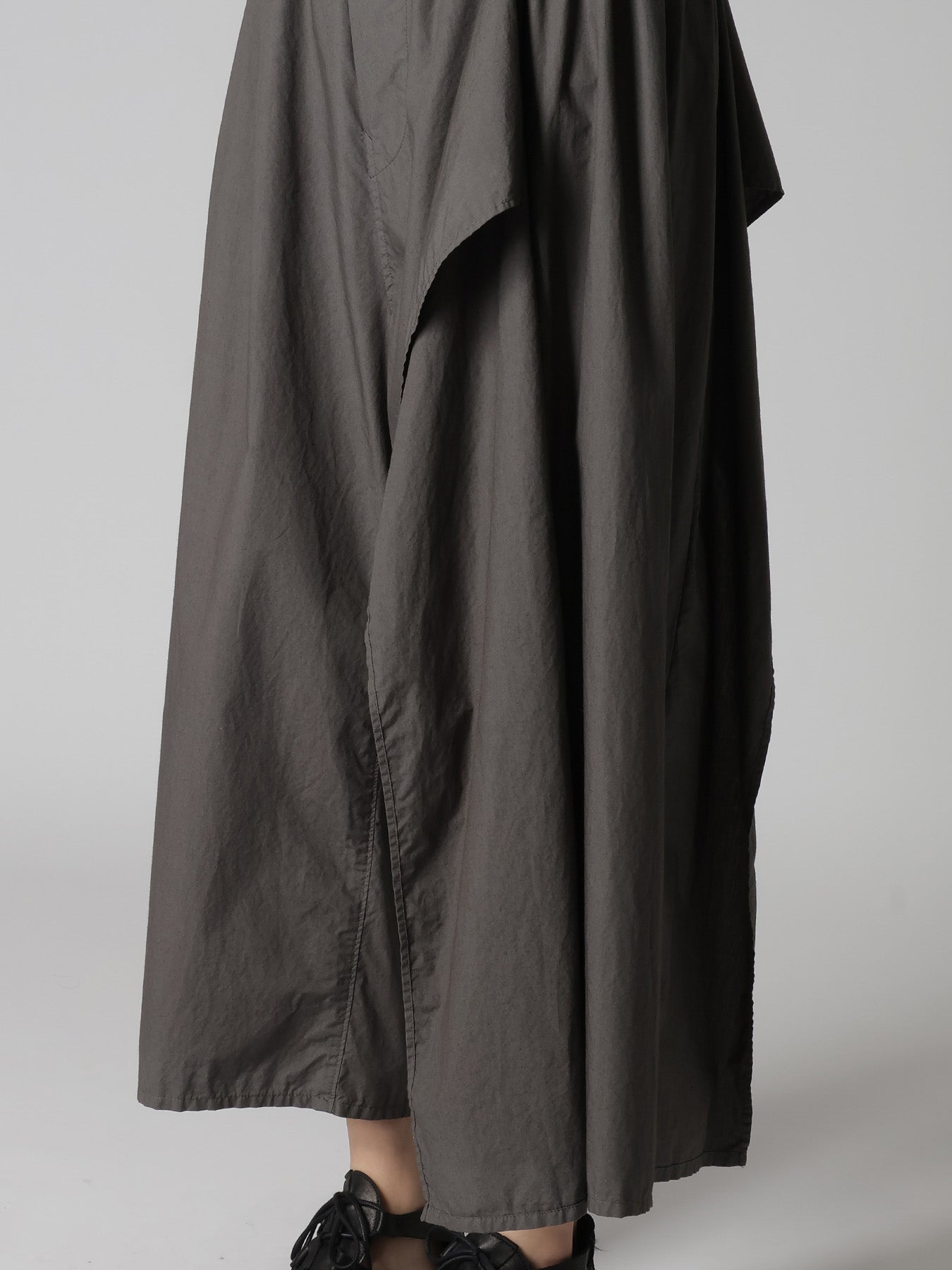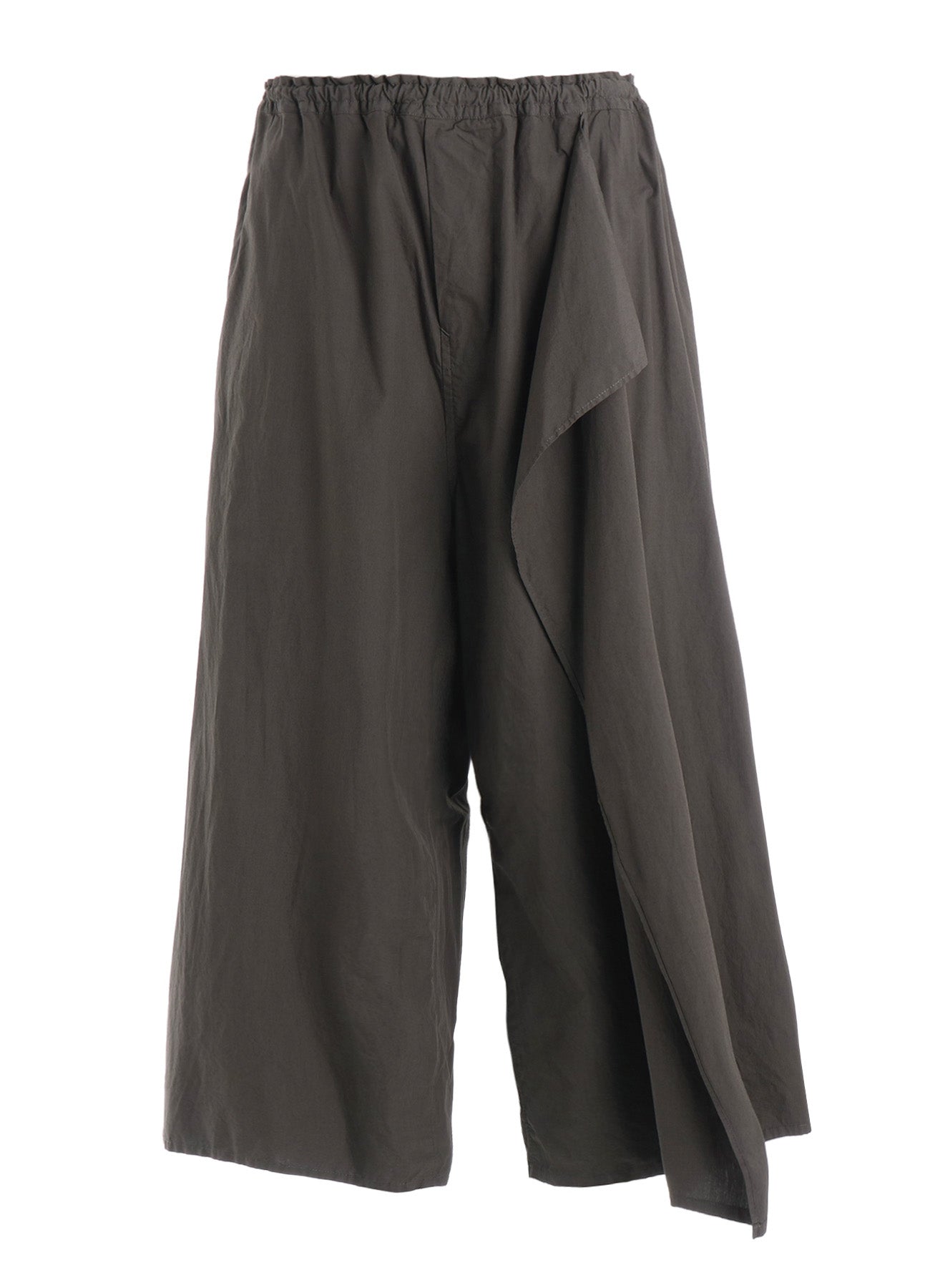 These typewriter fabric pants have a smooth and taut texture. They are lightweight yet not sheer, offering a pleasant feel. The pants are garment dyed, creating a dynamic silhouette with side drapes.