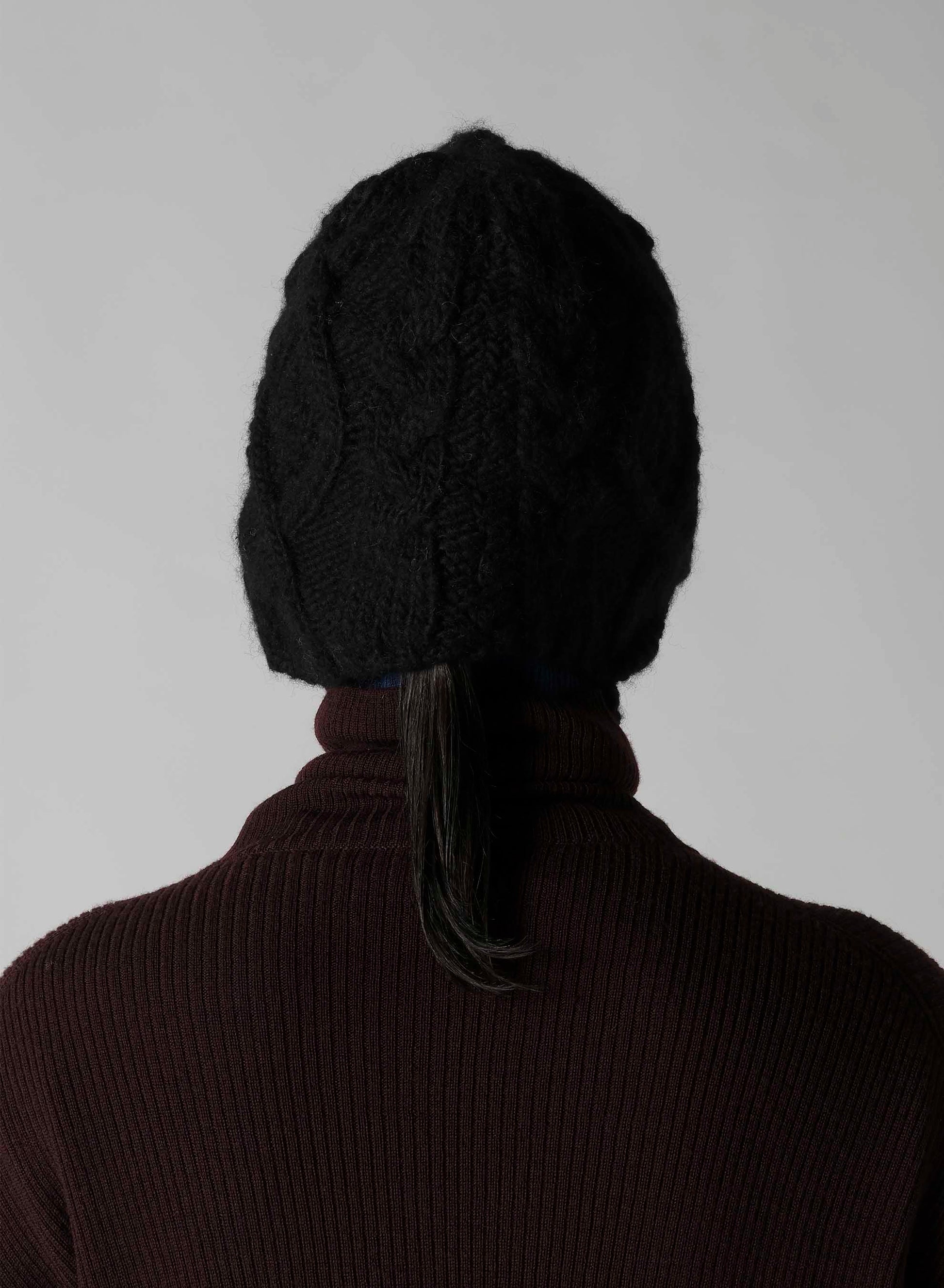 This knit cap features hand-stitched accents by Y's, inspired by vintage Aran sweaters. The large-knit pattern uses slub yarn for a warm appearance, and it's crafted from 100% wool for maximum softness and warmth. Handle with care, as the knit nature may result in snags or fraying.
