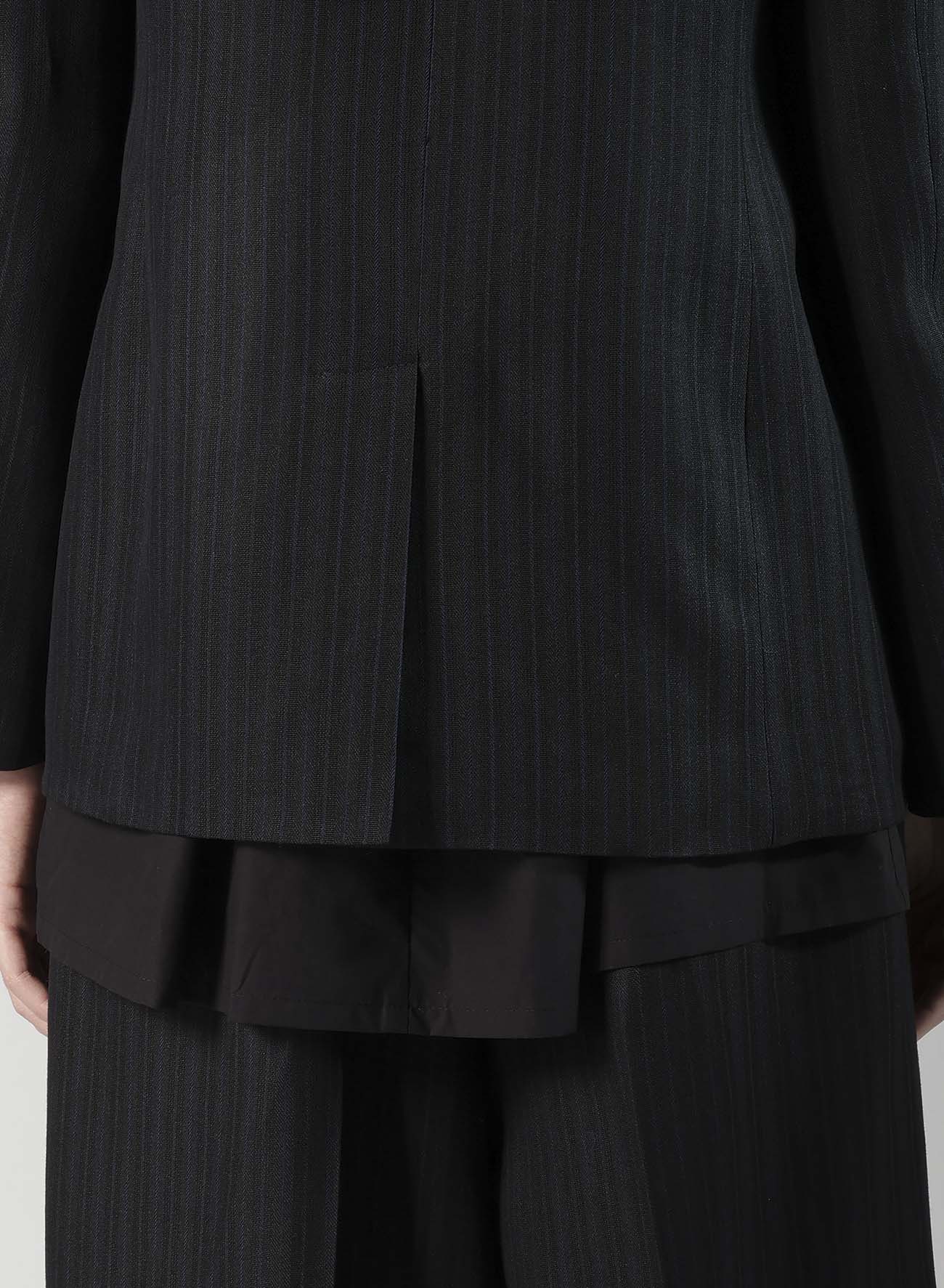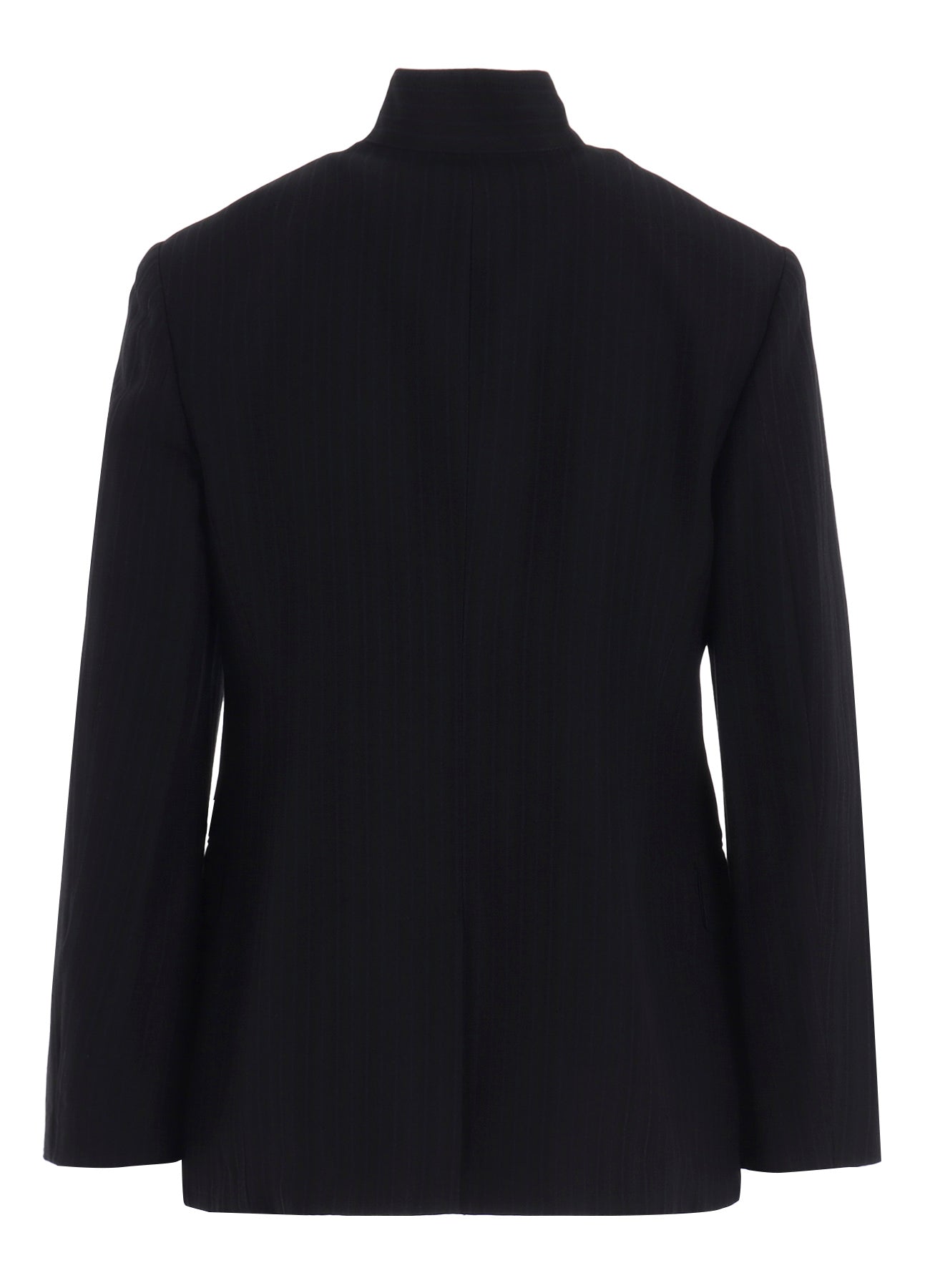 Chaqueta elegante con cuello levantado hecha de tela con rayas sutiles para un look clásico. El tejido tiene una textura refinada con un equilibrio perfecto de estructura. Presenta un dobladillo redondeado y un diseño ajustado. Combínalo con pantalones o blusa del mismo material para un conjunto atemporal.