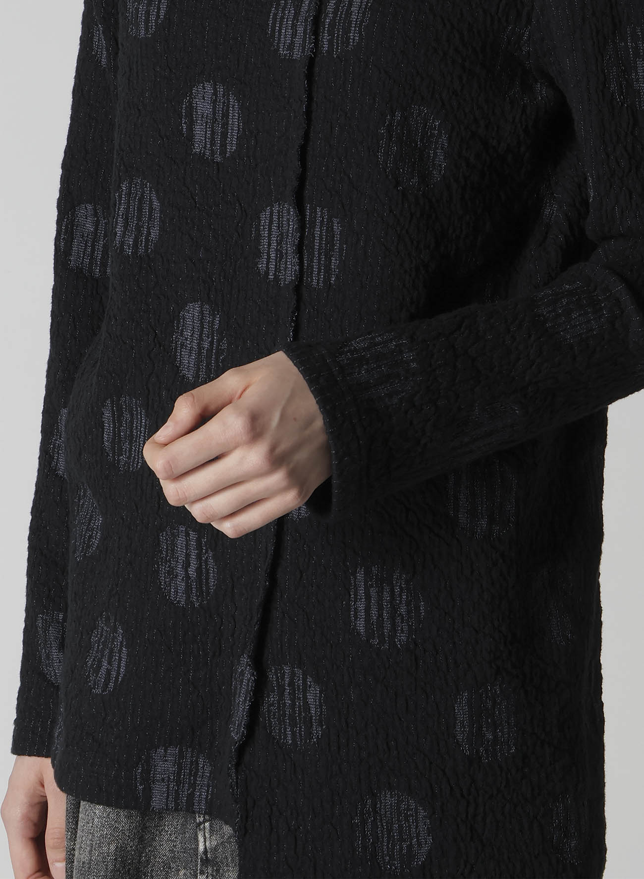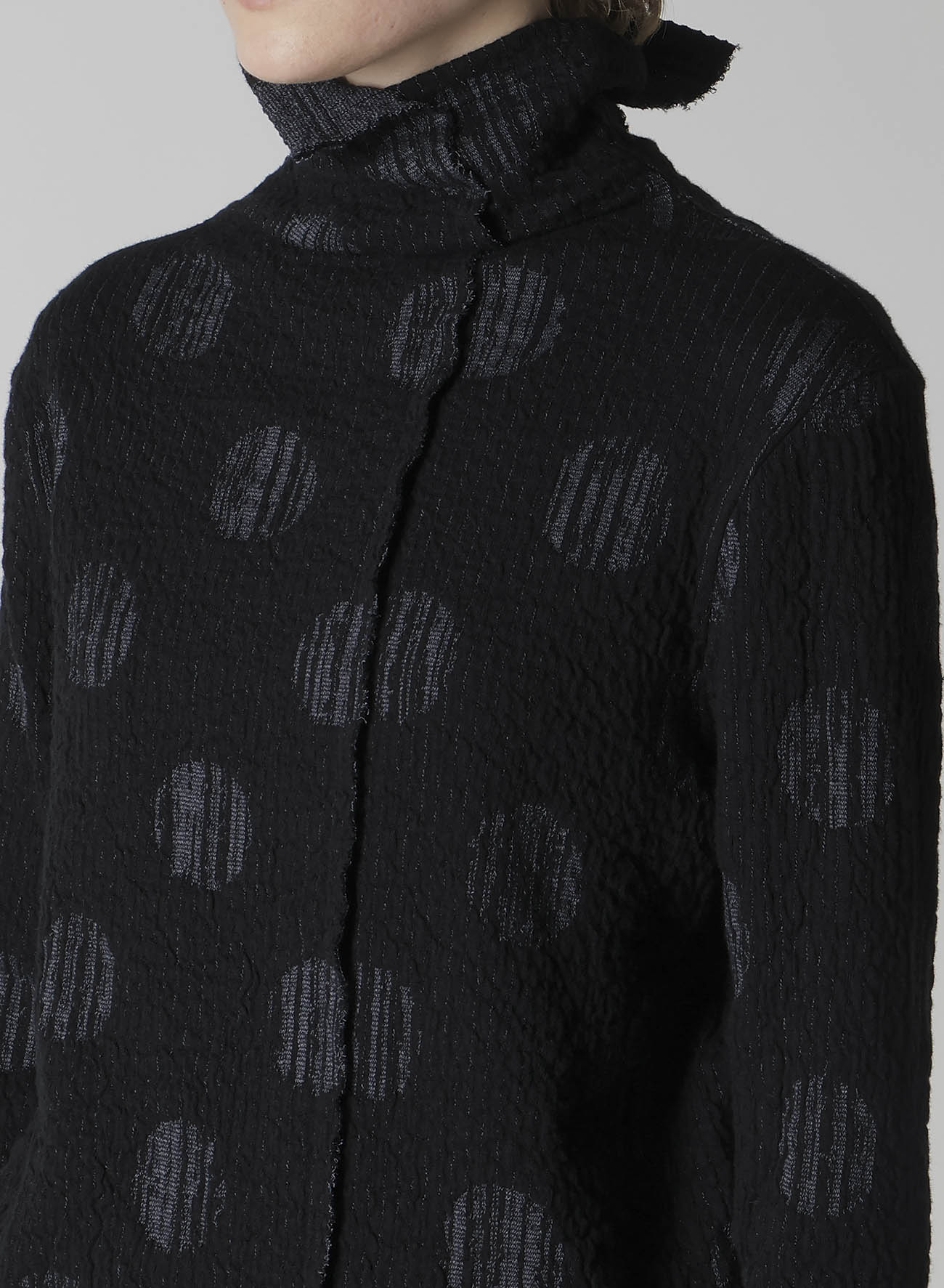 Esta prenda cuenta con un cuello alto de tejido ligero y elástico con un diseño asimétrico. Los lunares revelan franjas aleatorias, mientras que las variaciones en el cuello y el dobladillo crean una silueta atractiva.