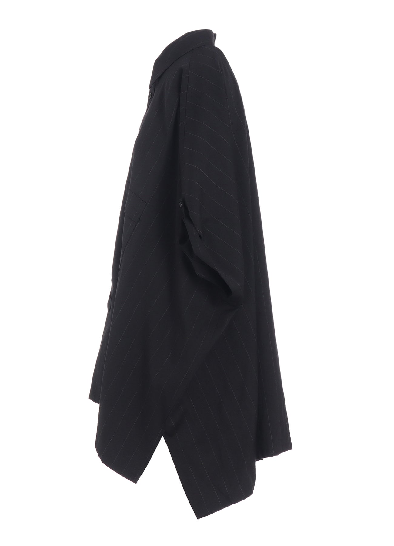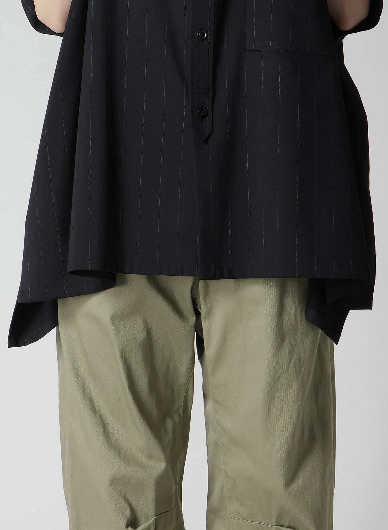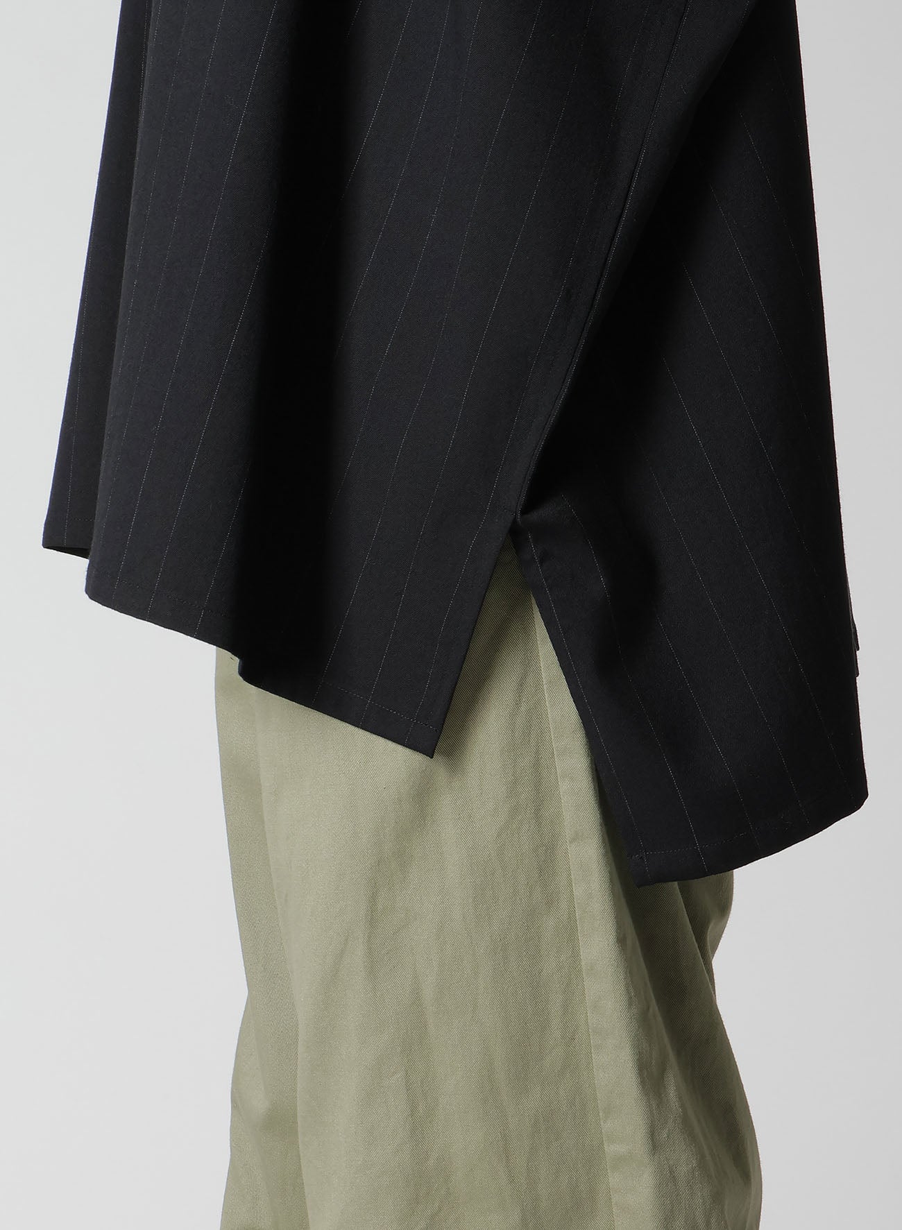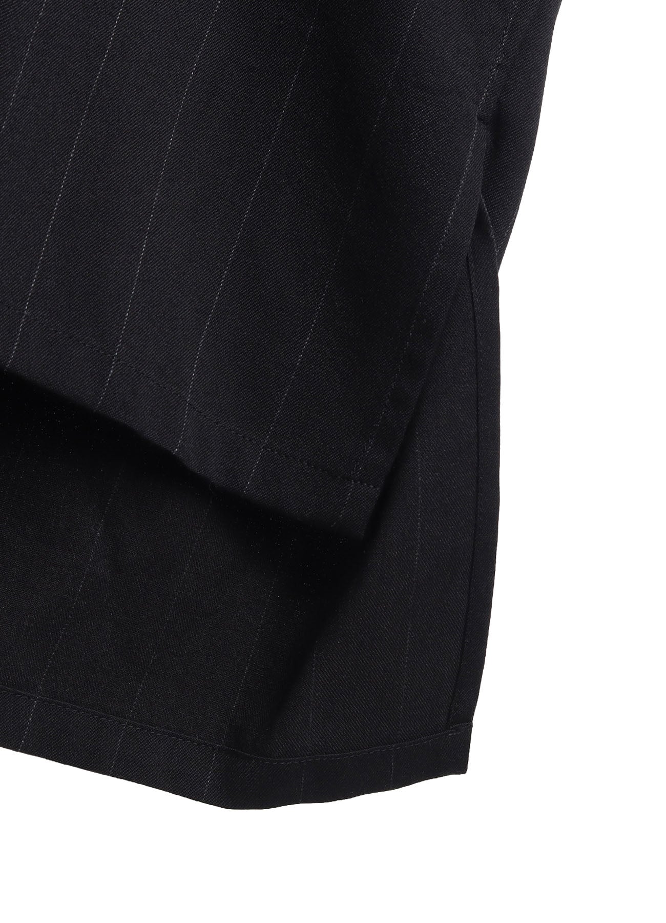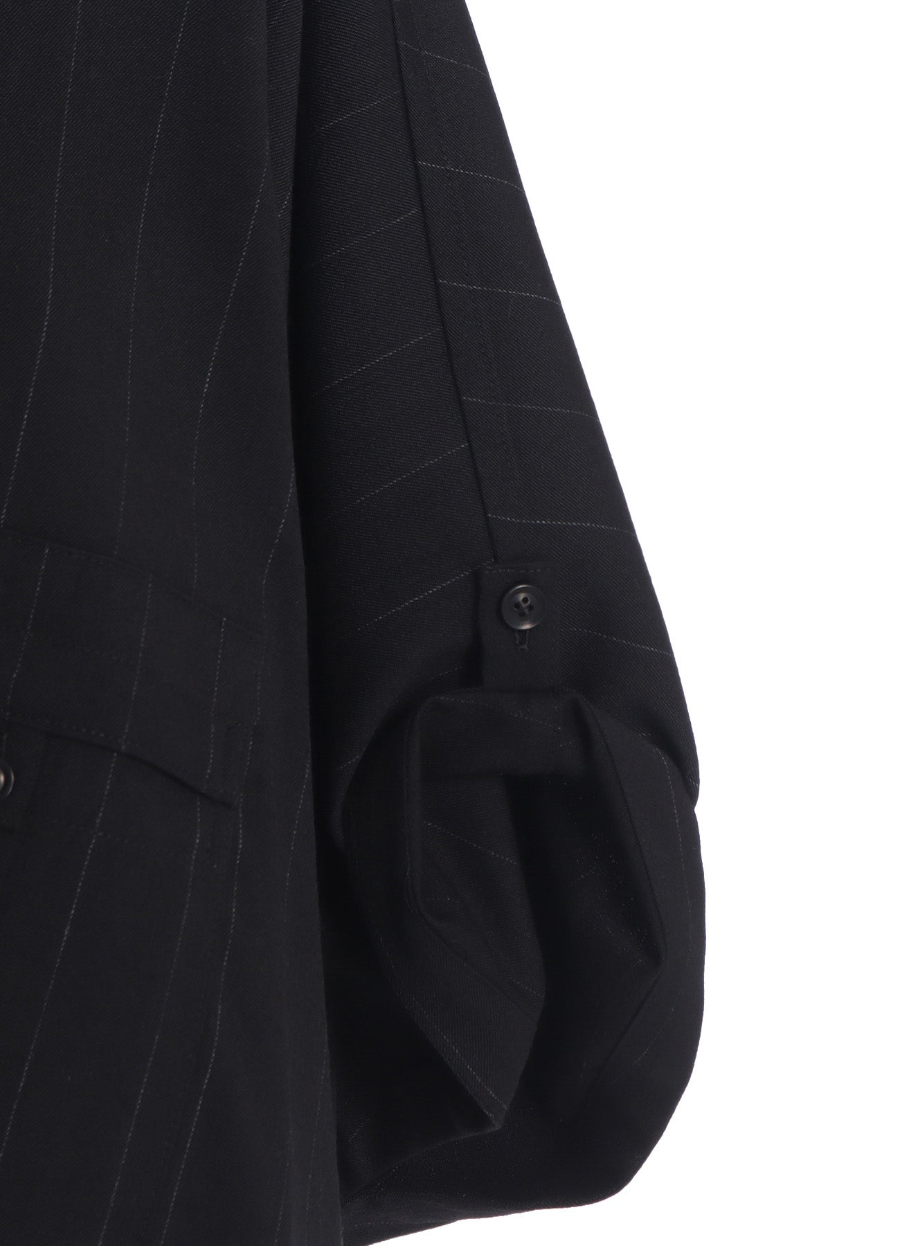 This blouse features a rolled-up sleeve design with a relaxed fit, creating a generously voluminous silhouette with slightly lower hems on each side. The classic chalk stripe fabric incorporates stretch for moderate elasticity and firmness. It pairs well with inner wear like a top or knit for versatile styling.