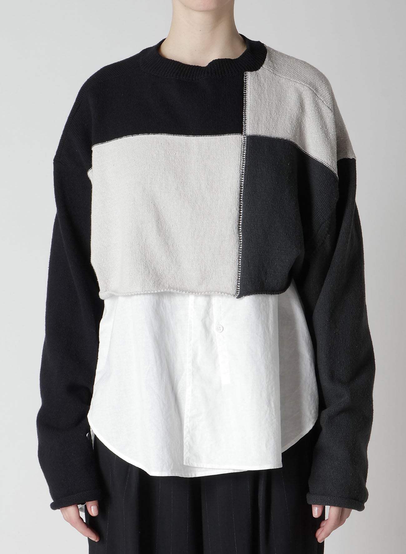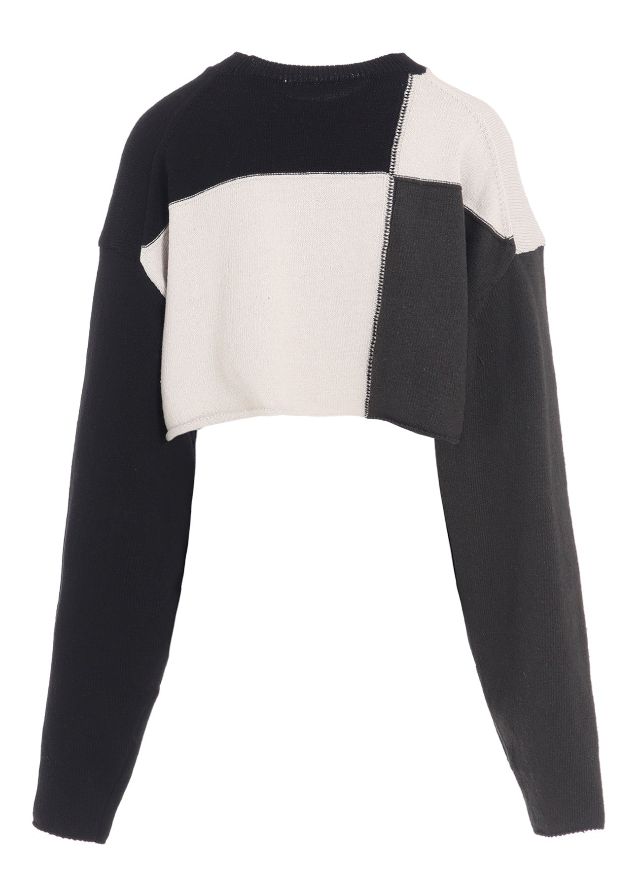 HARD-TWISTED BLOCK INTARSIA ROUND NECK SHORT PULLOVER