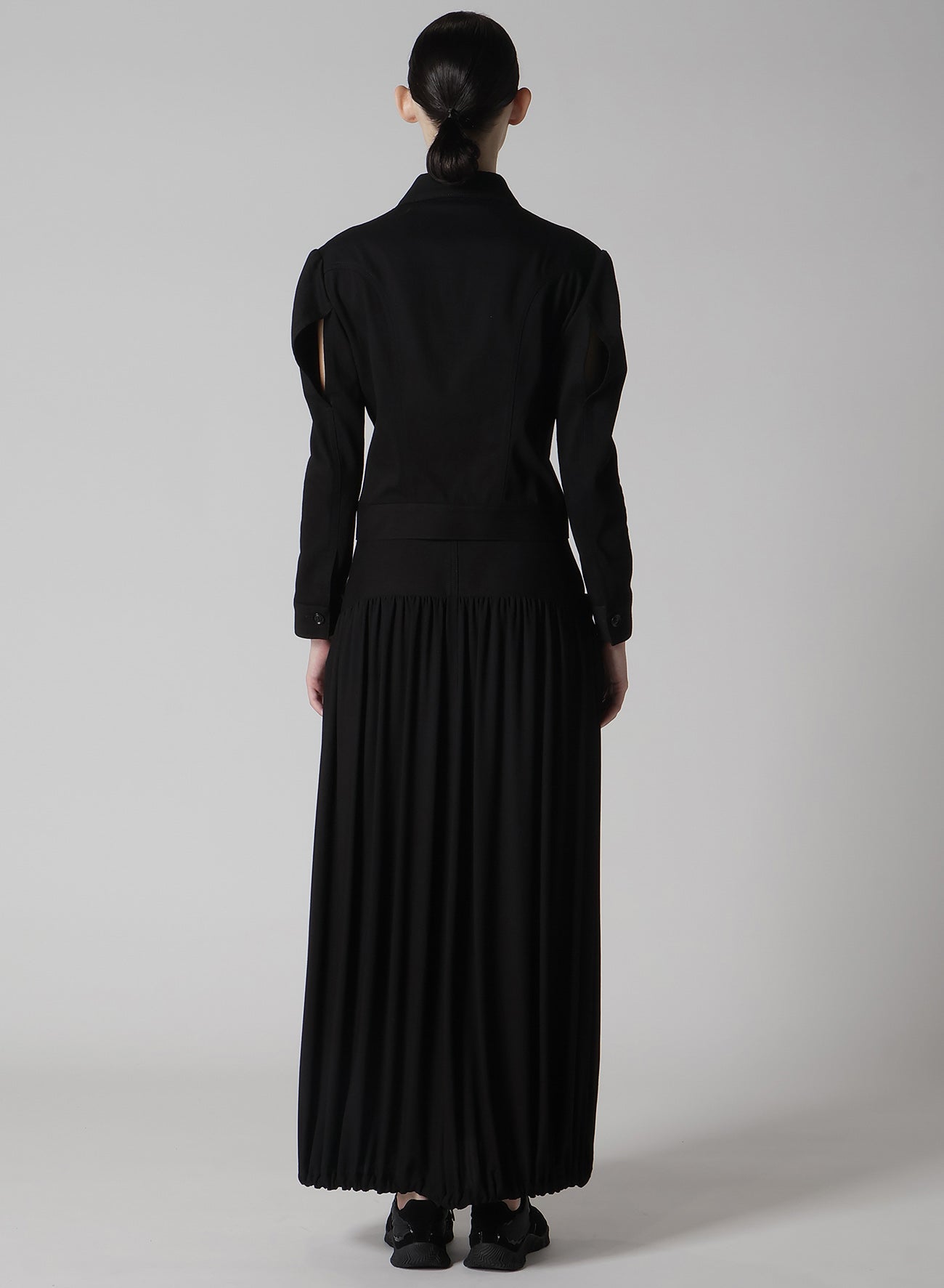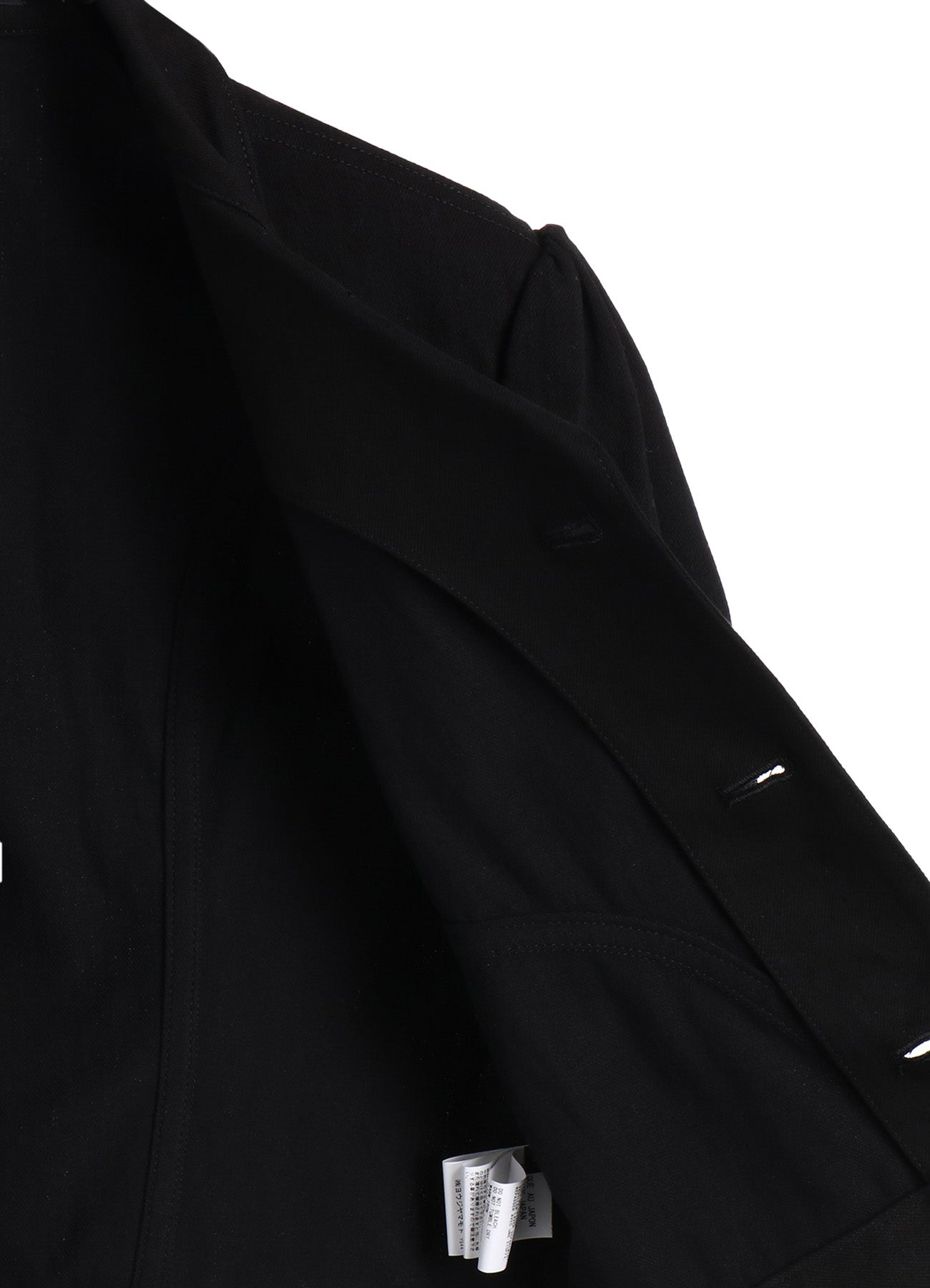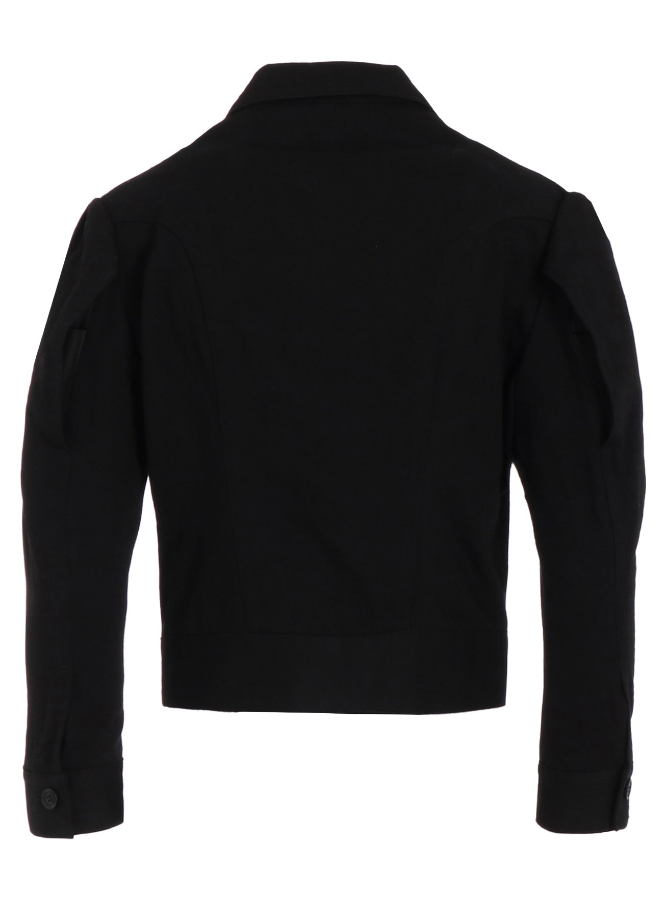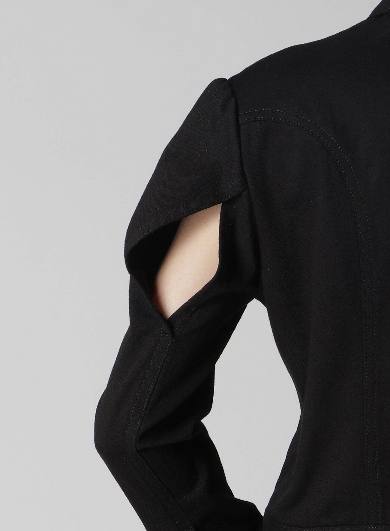 Una chaqueta de mezclilla con abertura y un diseño compacto y moldeado, destacando detalles en las mangas que revelan la piel. Utiliza mezclilla teñida con azufre, sobreteñida para un tono negro profundo. Las imágenes del modelo muestran un artículo de muestra que puede diferir en tamaño y textura; consulte INFO DE TAMAÑO para más detalles.