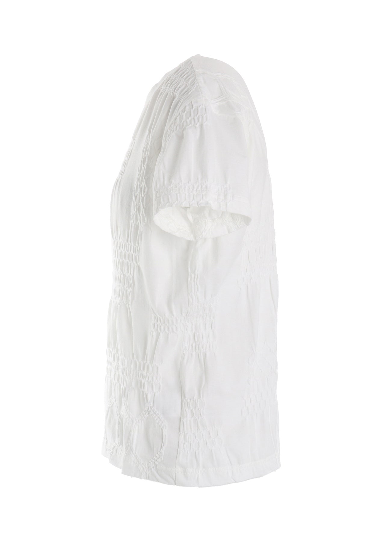 This short-sleeve top features a three-dimensional smocking-like pattern crafted by knitting with different materials. It offers a clean, minimal size that complements various outfits.