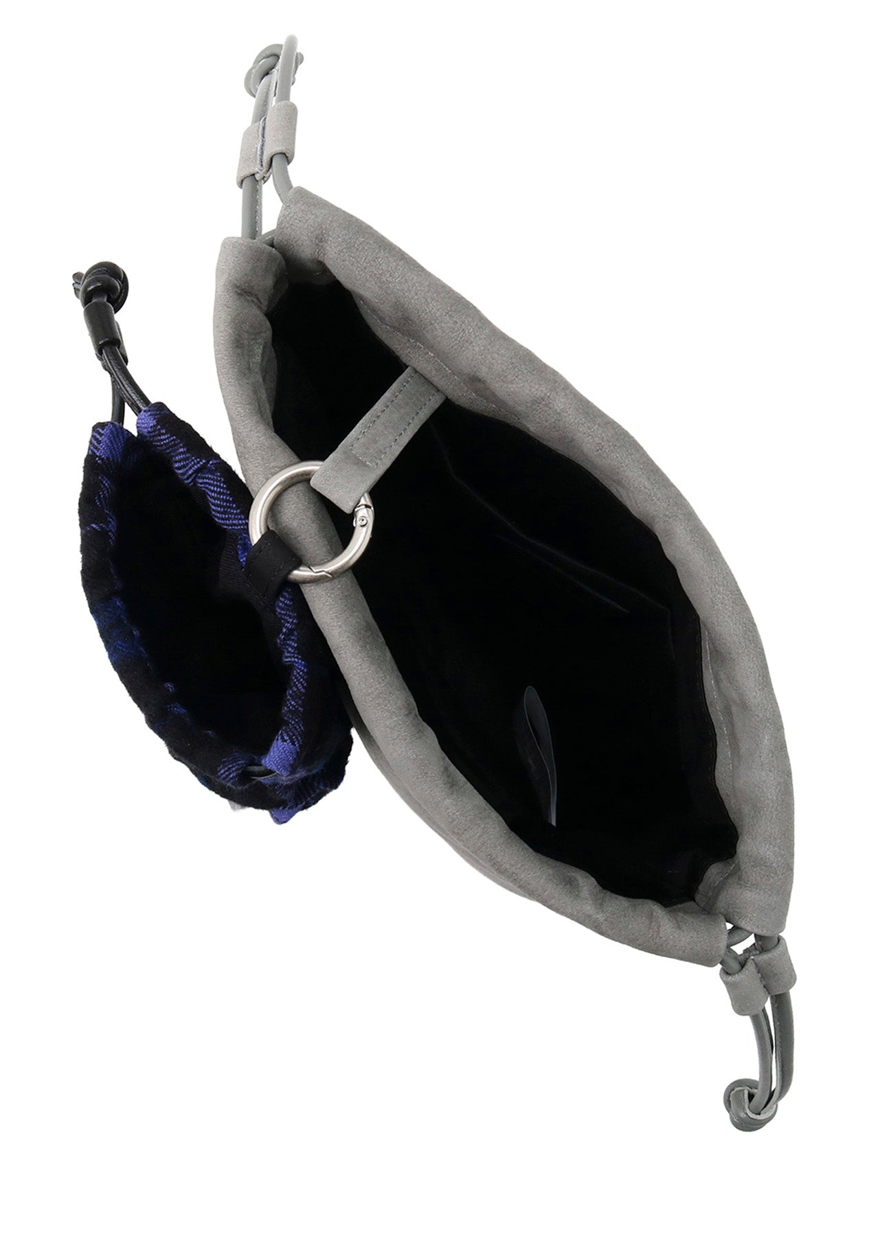 This is a unique drawstring set combining two drawstring bags. It features a carabiner, allowing you to attach keys or charms with ease.