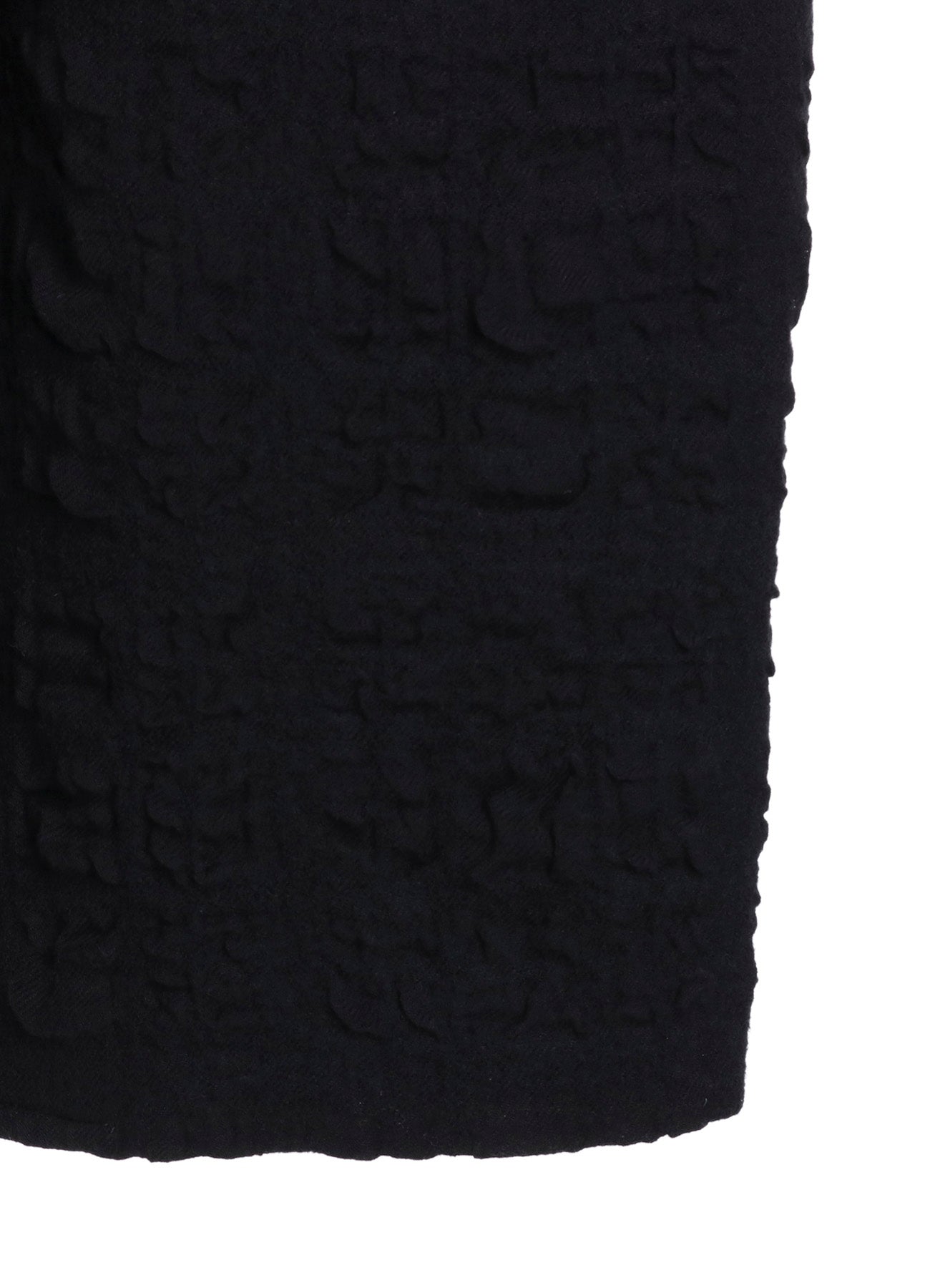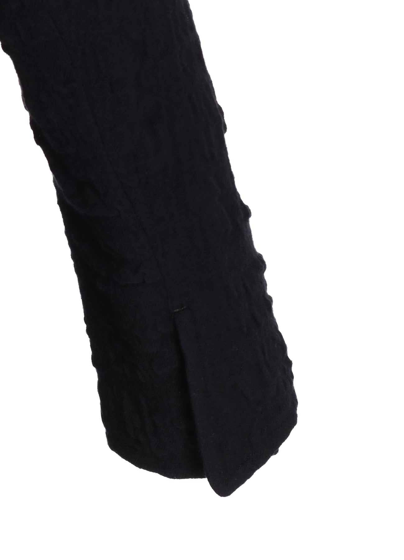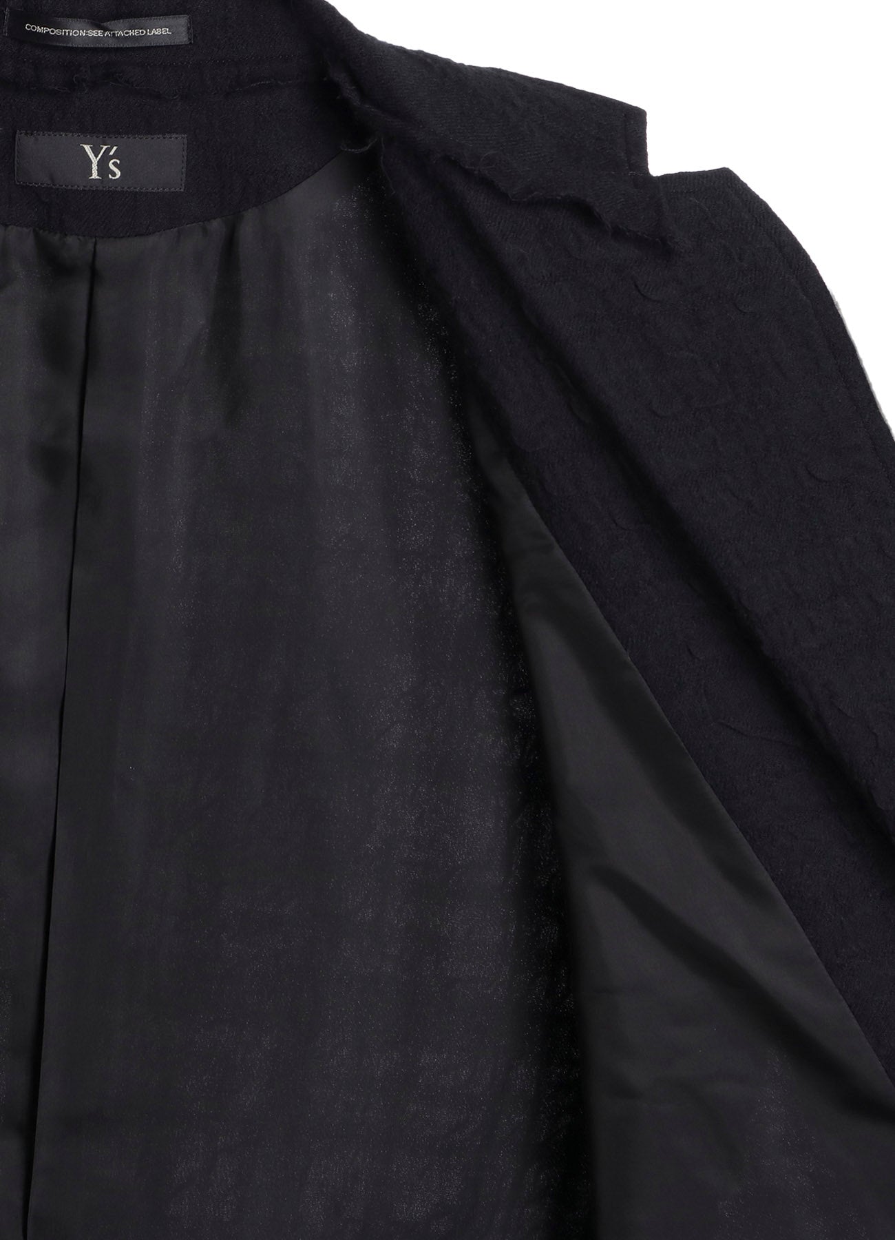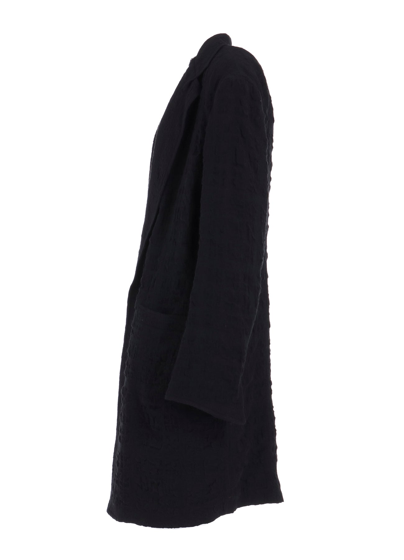 A wool and cotton plaid jacket features a unique tactile fabric enhanced through a fulling process, creating a dimensional effect. The interplay between the materials achieves a distinctive texture, perfect for adding a stylish layer to any ensemble. This expertly crafted piece showcases a harmonious blend of functionality and fashion.