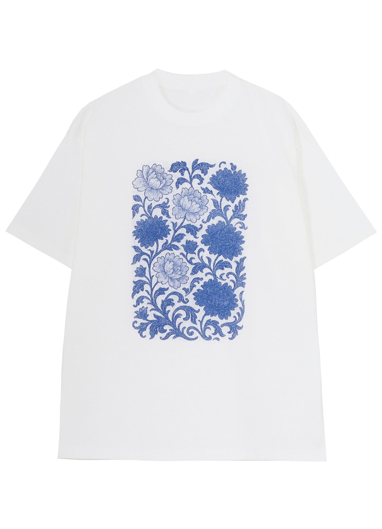 Top azul estampado con flores de peonía en un estilo de chintz del siglo XVII reestructurado con puntos. Presenta un rico degradado que crea profundidad y textura. Fabricado con un tejido duradero y grueso, ofrece un ajuste relajado, adecuado para todos los géneros.