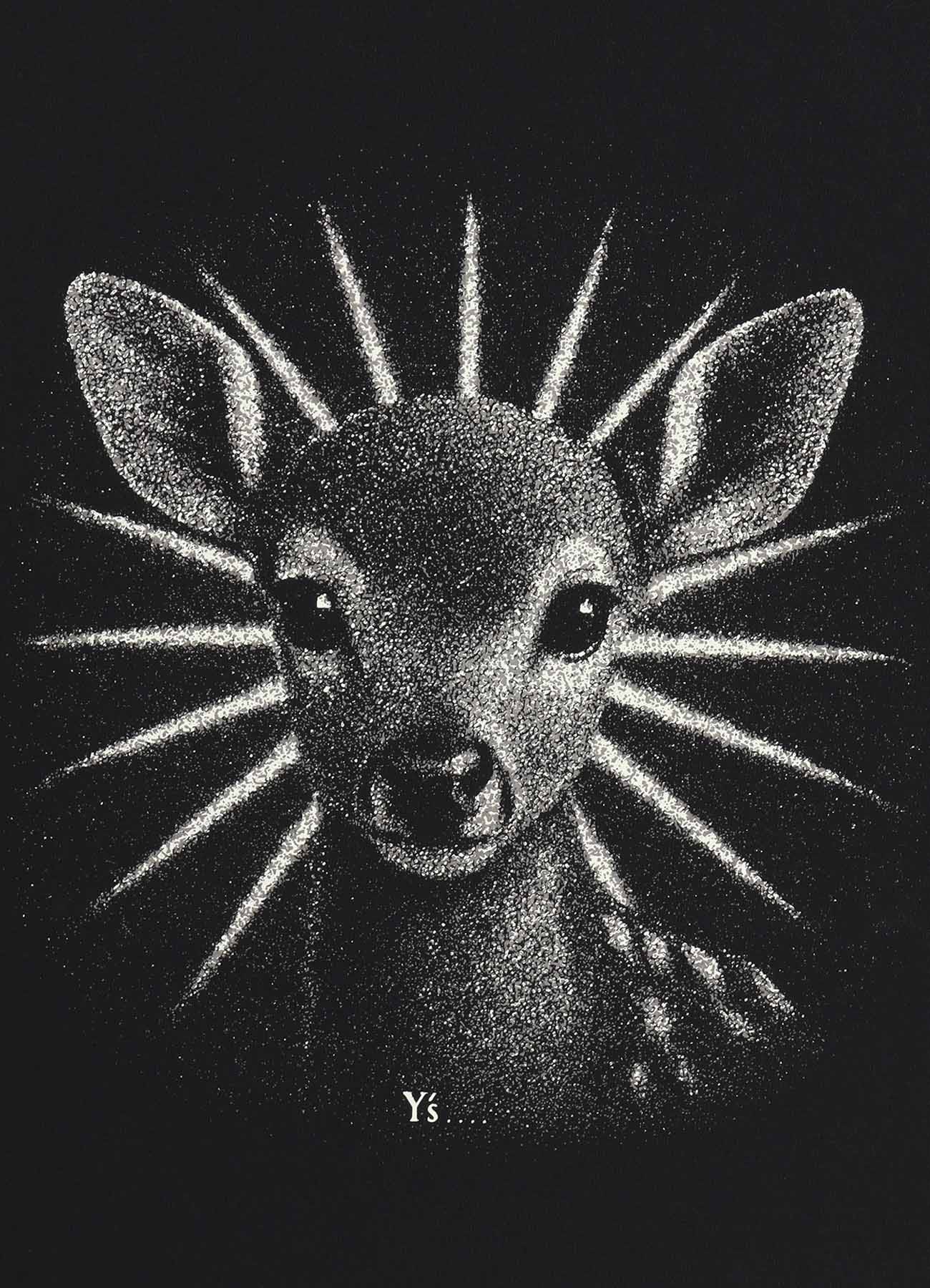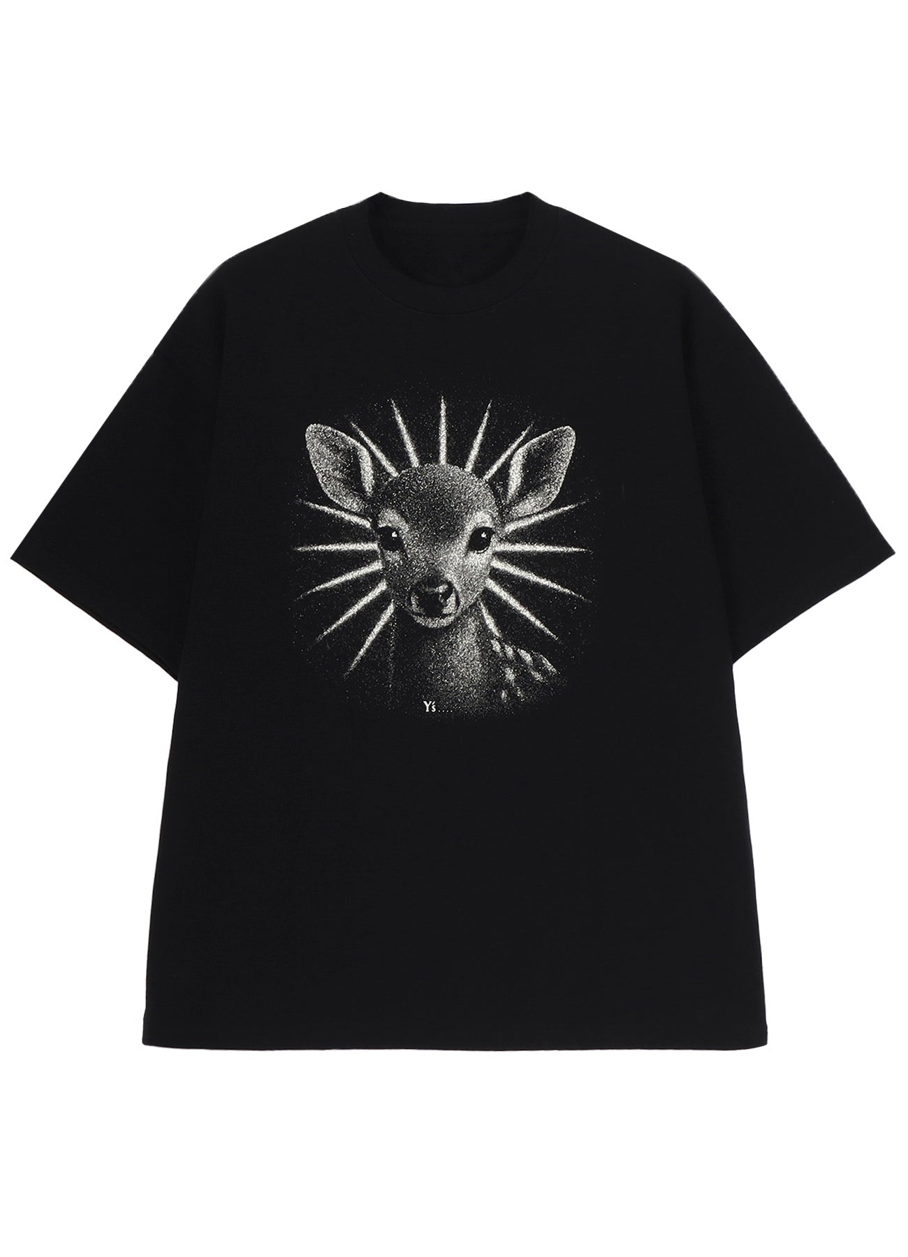 Esta notable camiseta de manga corta presenta un impresionante estampado de ciervo, inspirado en periódicos vintage y renderizado en tonos halftone gruesos. Elaborada con un tejido resistente y grueso, ofrece una silueta relajada adecuada para todos los géneros.