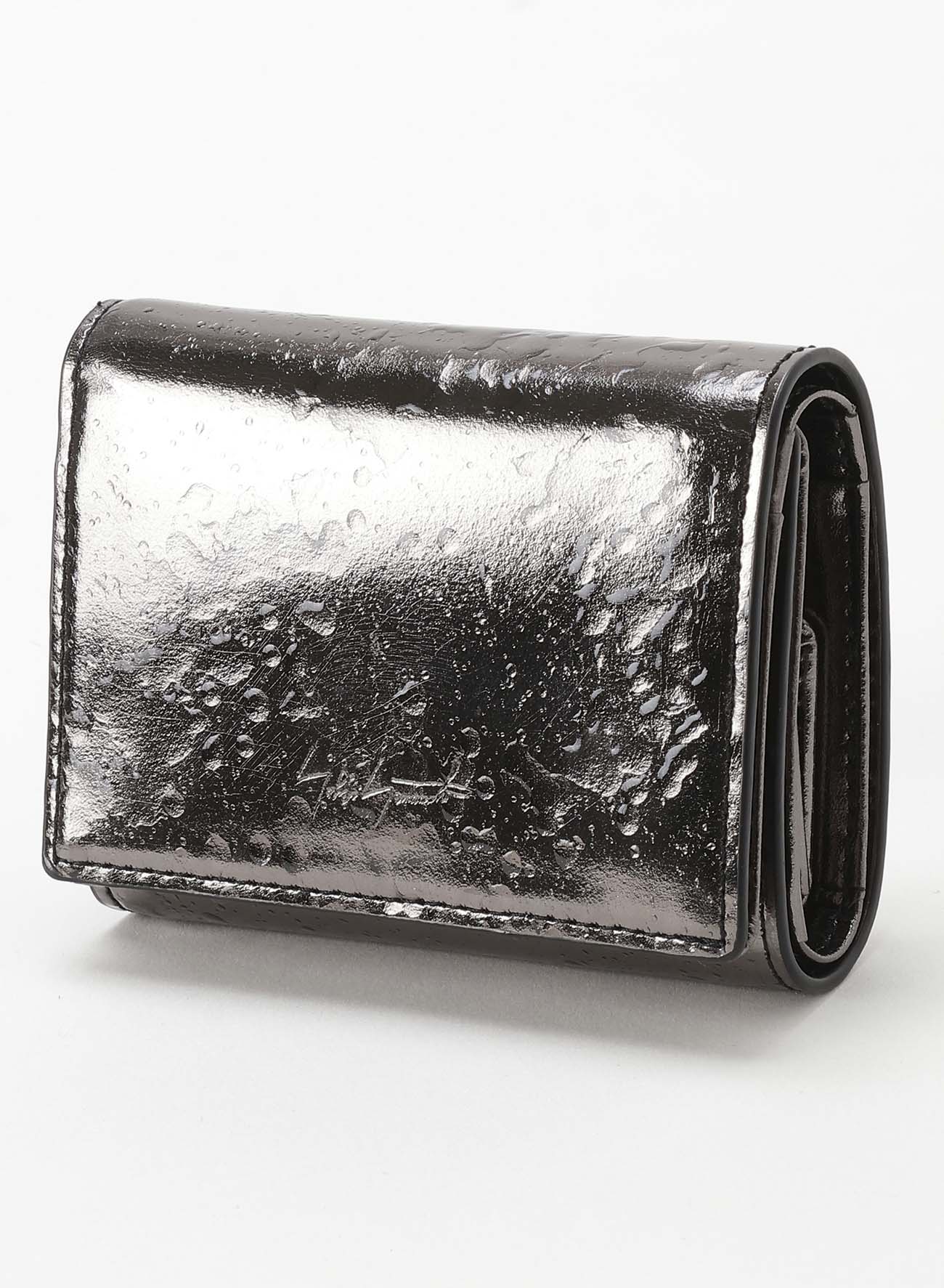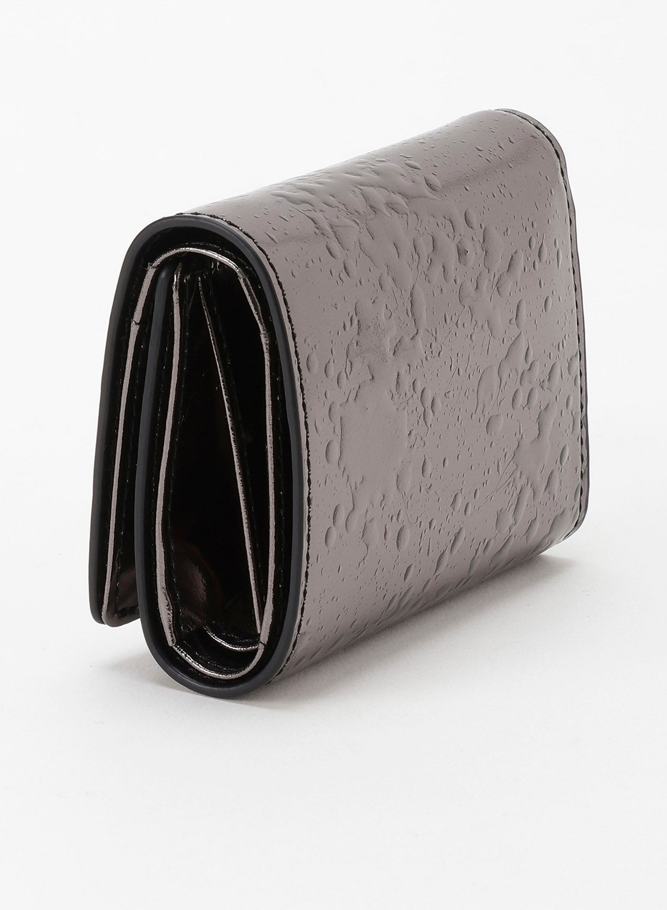 This compact trifold wallet is designed for easy portability and efficient storage of bills, coins, and cards. Crafted from leather with a foil layer and randomly splattered enamel droplets, each piece is distinct due to the artisanal handwork involved in its creation, making the droplet patterns unique for every wallet.