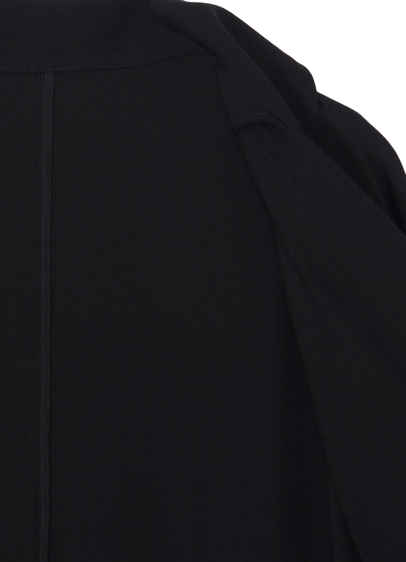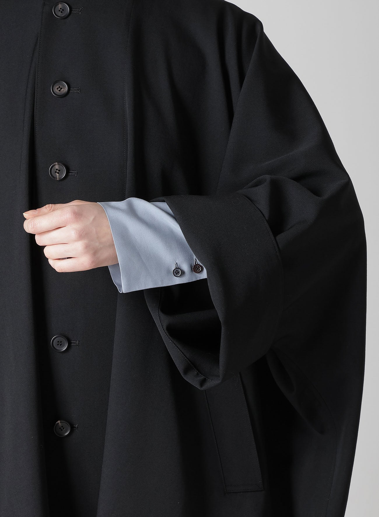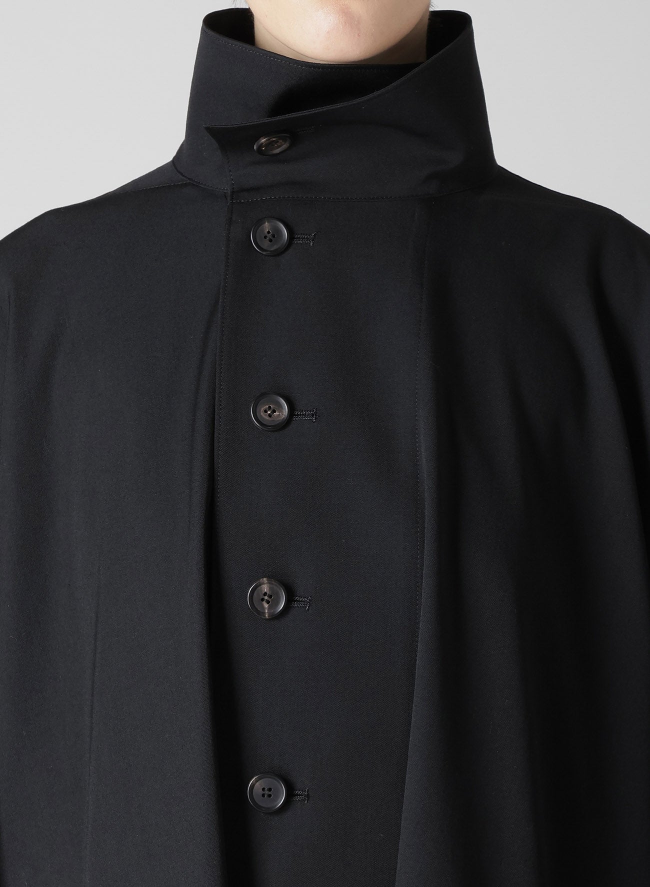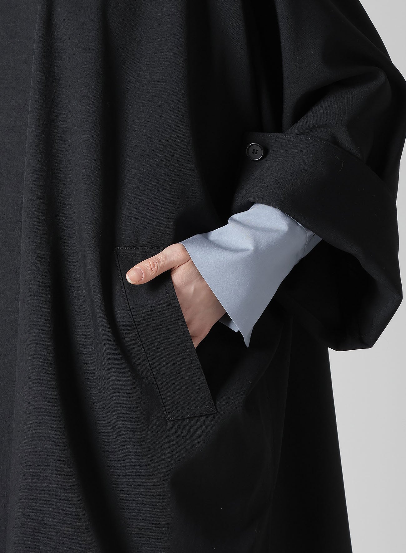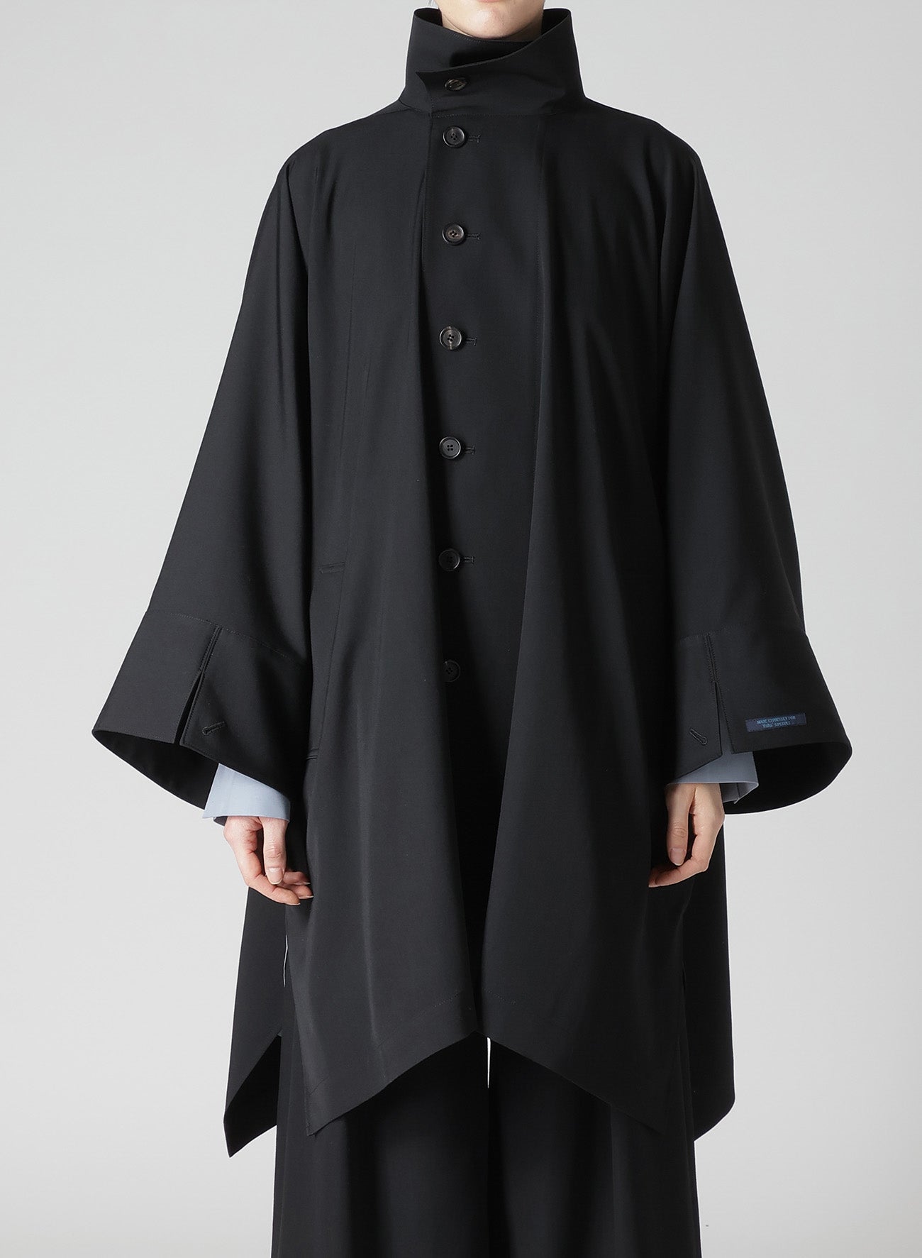 Ce manteau présente un col droit épuré et utilise le matériau signature, le gabardine froissée, de Yohji Yamamoto. Le tissu passe sans effort du col au corps, créant une silhouette frappante. Il est polyvalent et peut être porté avec divers vêtements intérieurs et pantalons pour des saisons prolongées.