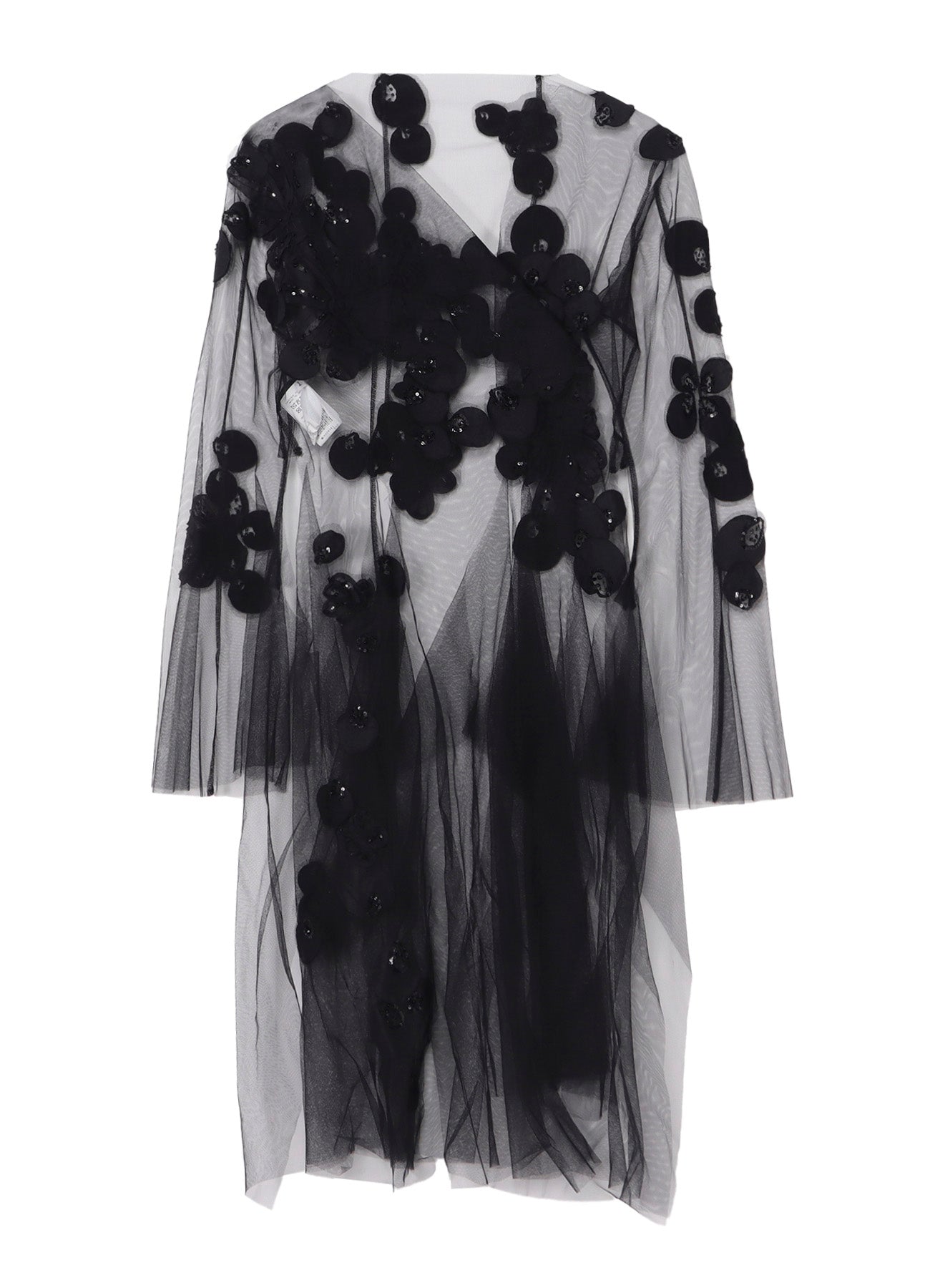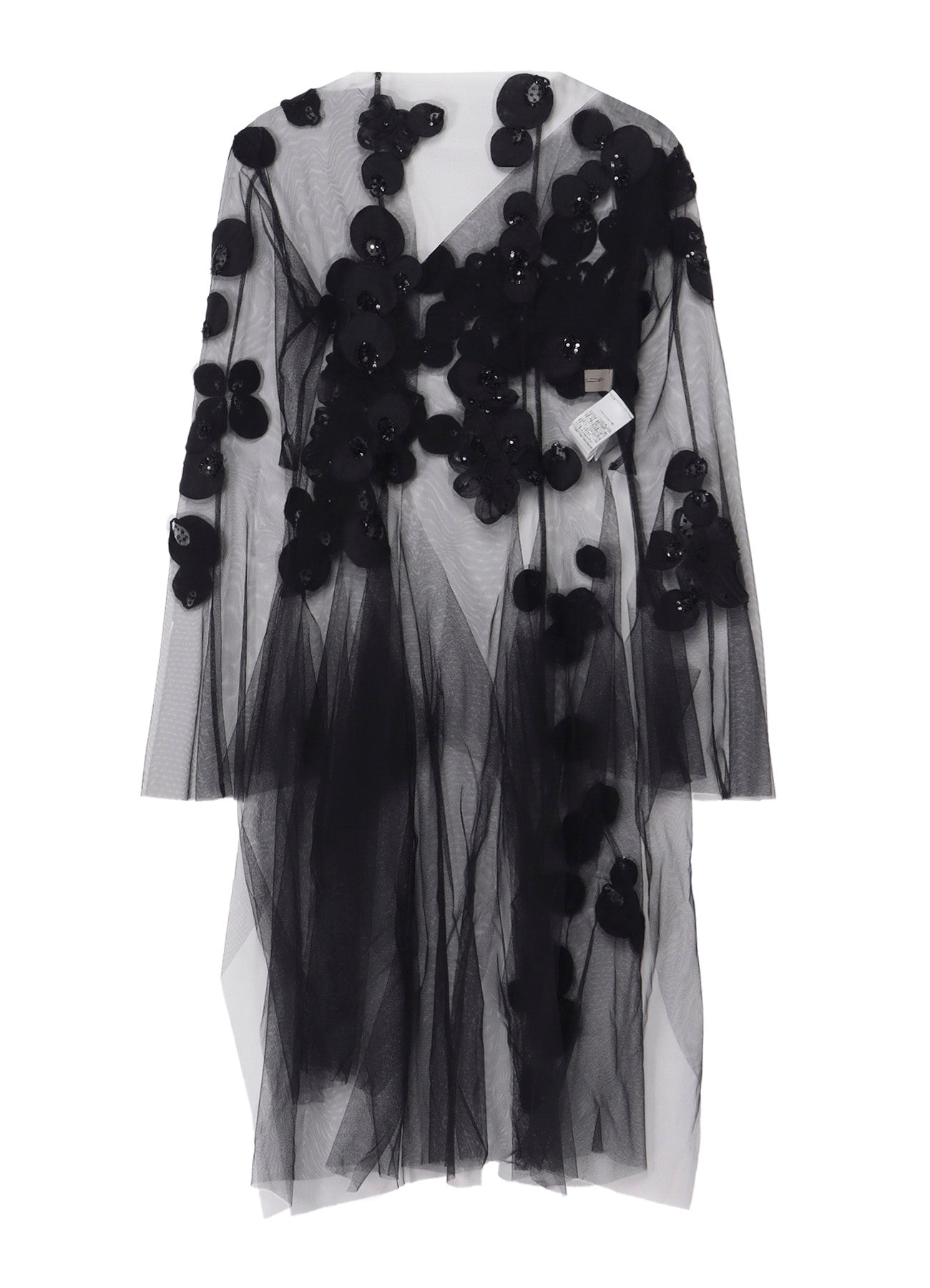 This elegant long blouse features a beautiful translucent appearance. It is crafted from soft and airy nylon tulle, with organza motifs secured by sequins and beads. The gently swaying silhouette enhances the graceful effect, complementing the material. Samples in model images may differ; check SIZE INFO for details.