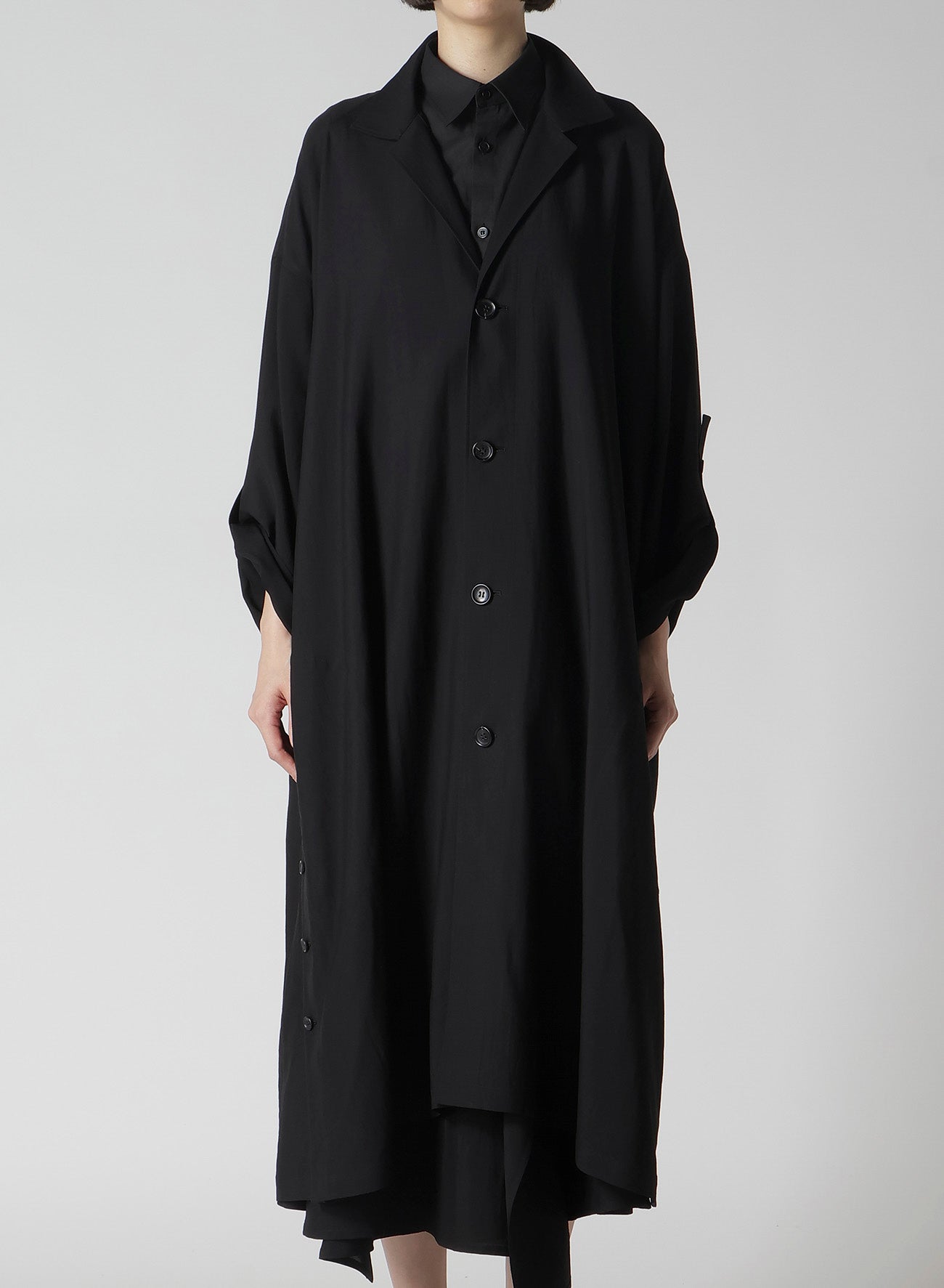 Un manteau polyvalent en gabardine avec un design froncé sur le côté et une silhouette rappelant une longue robe. Son design unique permet de transformer les boutons de l'ourlet en manches longues, offrant un style à deux usages. Cette pièce légère est parfaite pour superposer diverses tenues avec style.