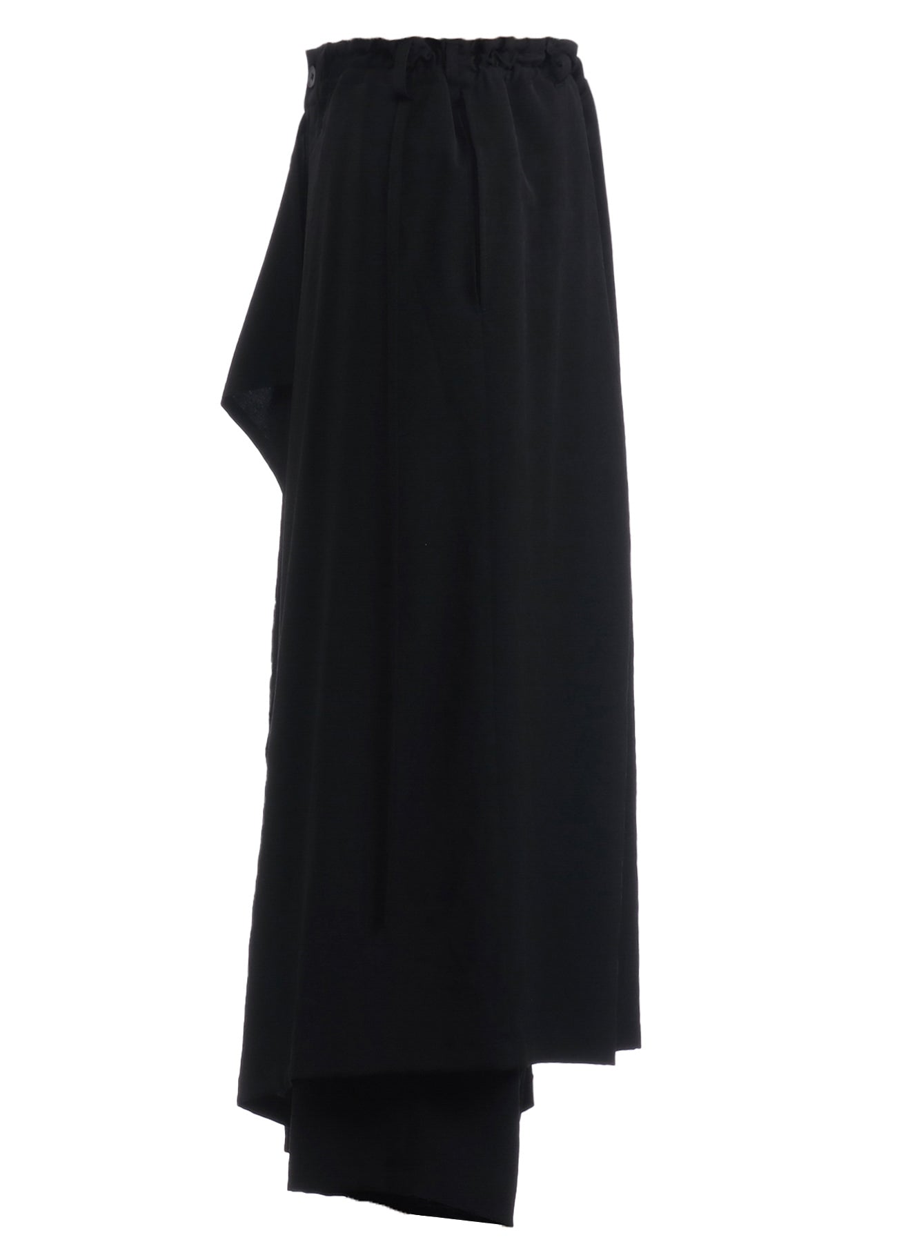 Tissu en déshabillé de style vintage. Caractérisé par une forte drapabilité et un éclat, il est également résistant aux plis. Un design de pantalon avec une jupe enroulée autour. Vous pouvez le nouer avec un cordon ou le laisser pendre pour profiter du drapé. Il peut être porté de 3 manières différentes. La taille est finie avec un cordon élastique, ce qui en fait un design unisexe.