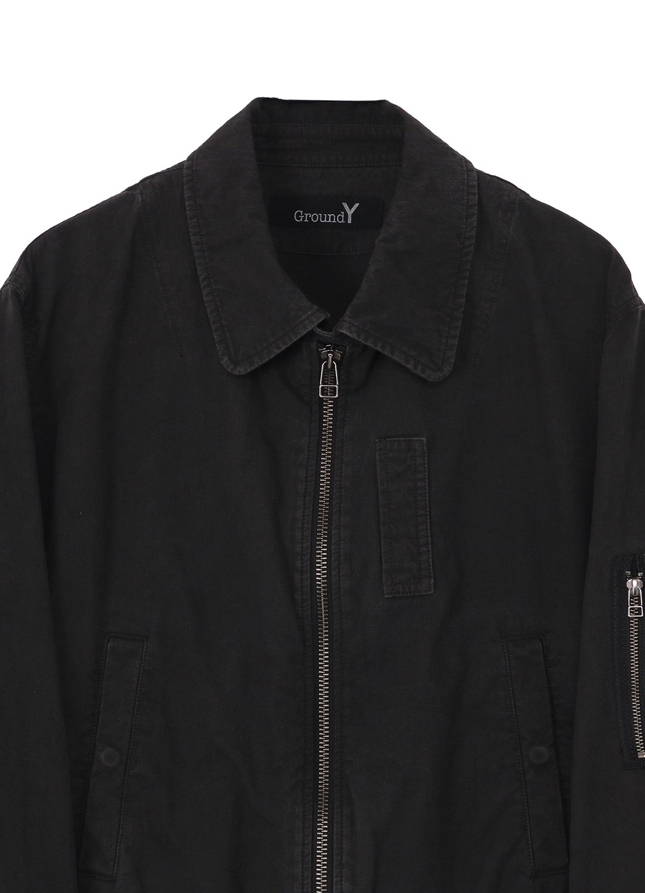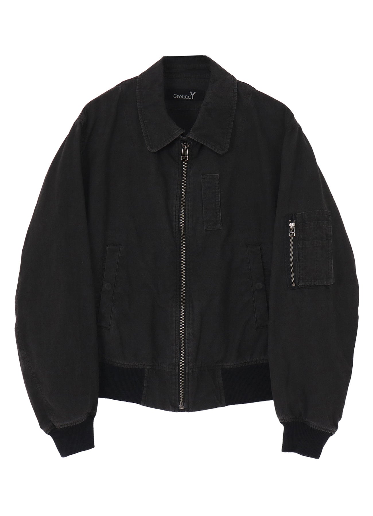 The Ground Y 2026 Spring/Summer Collection features a compact flight jacket with military-style details. Made from organic cotton in a ripstop weave, the fabric undergoes a dual dyeing process for a complex hue and is washed post-dye to enhance its faded look, showcasing a richly textured fabric.