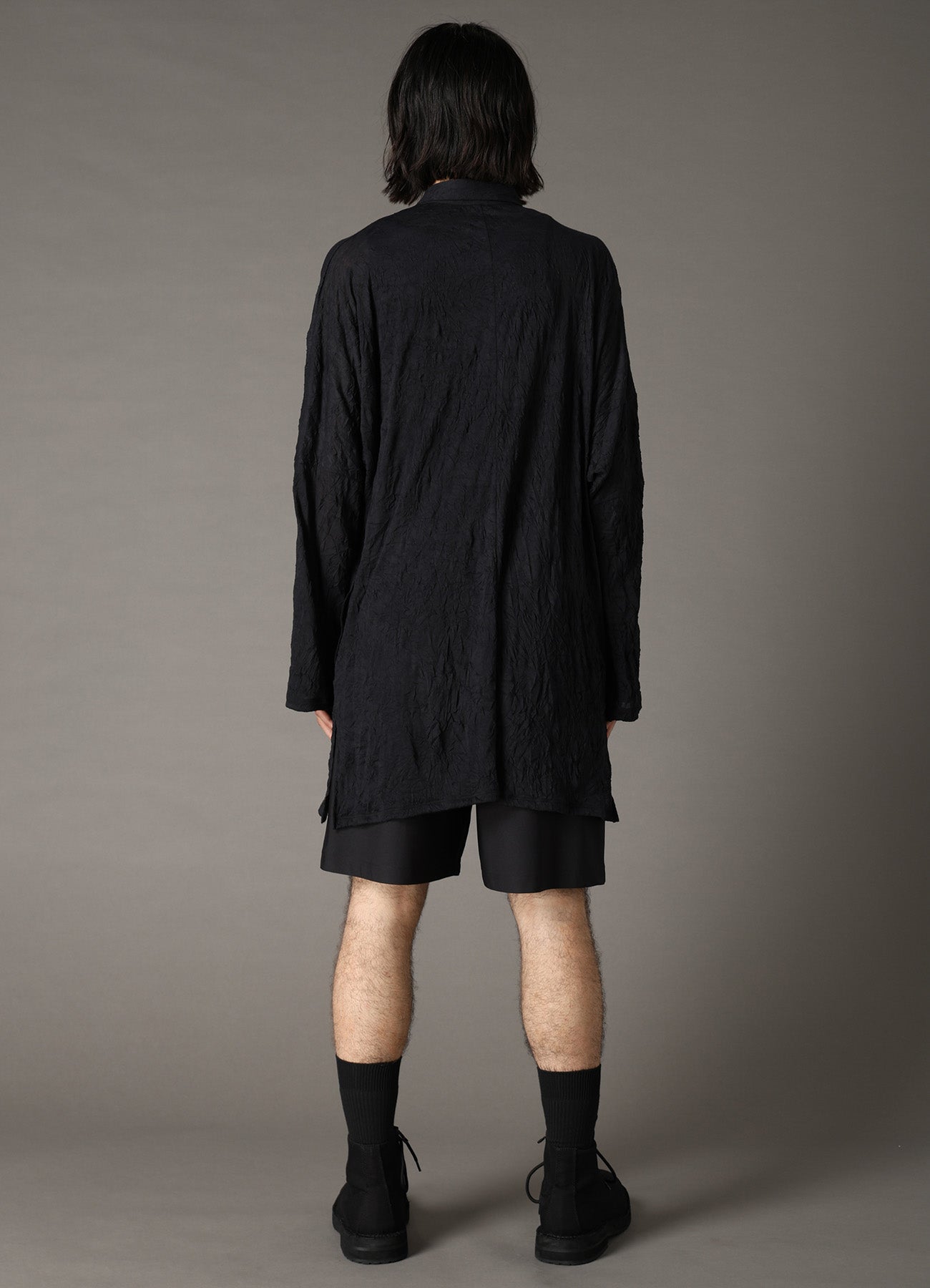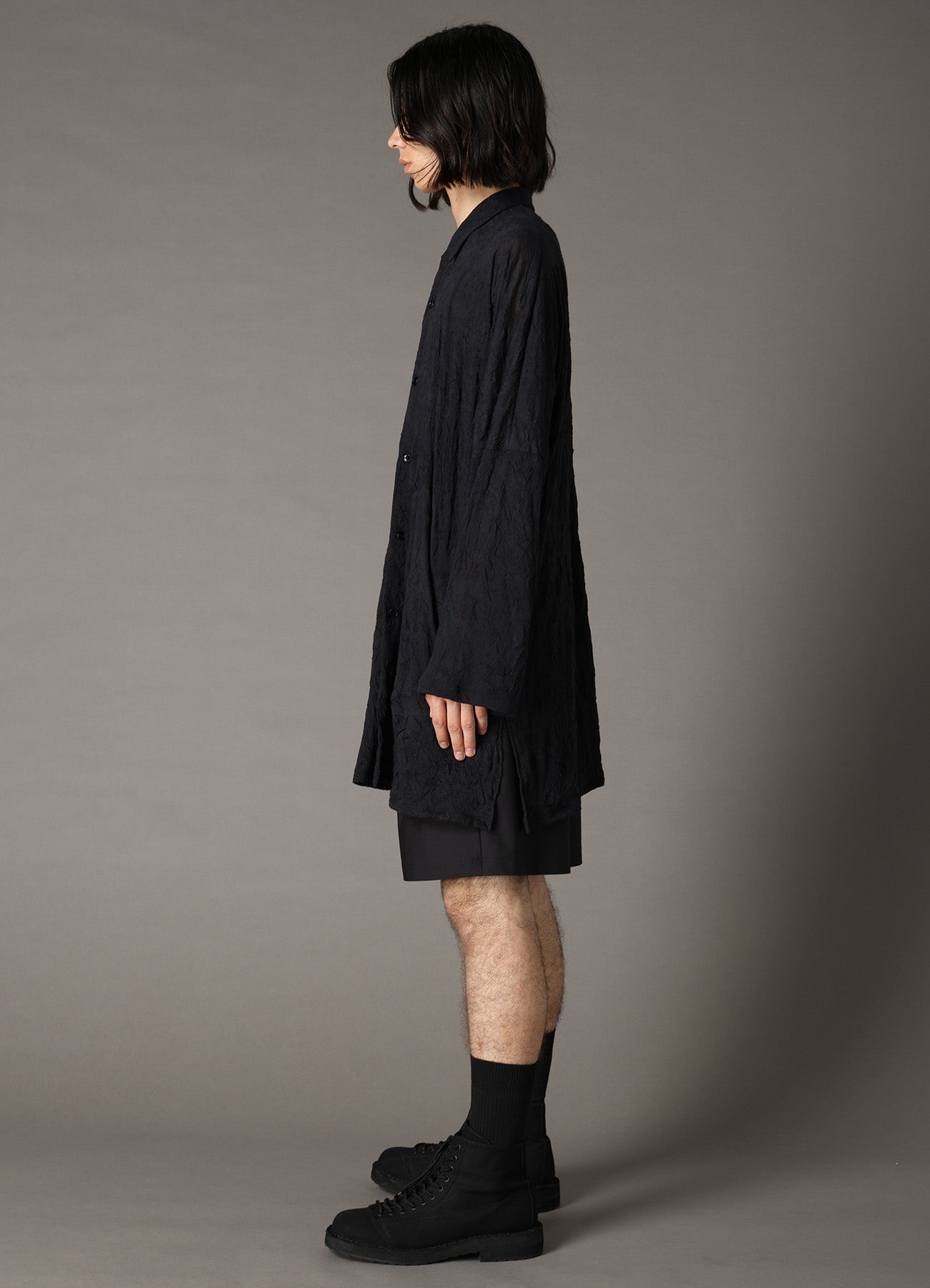 A versatile dolman sleeve shirt from Ground Y's 2026 Spring/Summer Collection, featuring a front button design, made with finely spun TC plain stitch fabric and washer treatment. Its airy sheer texture and curved seam pockets running under the sleeves combine for both style and functionality.