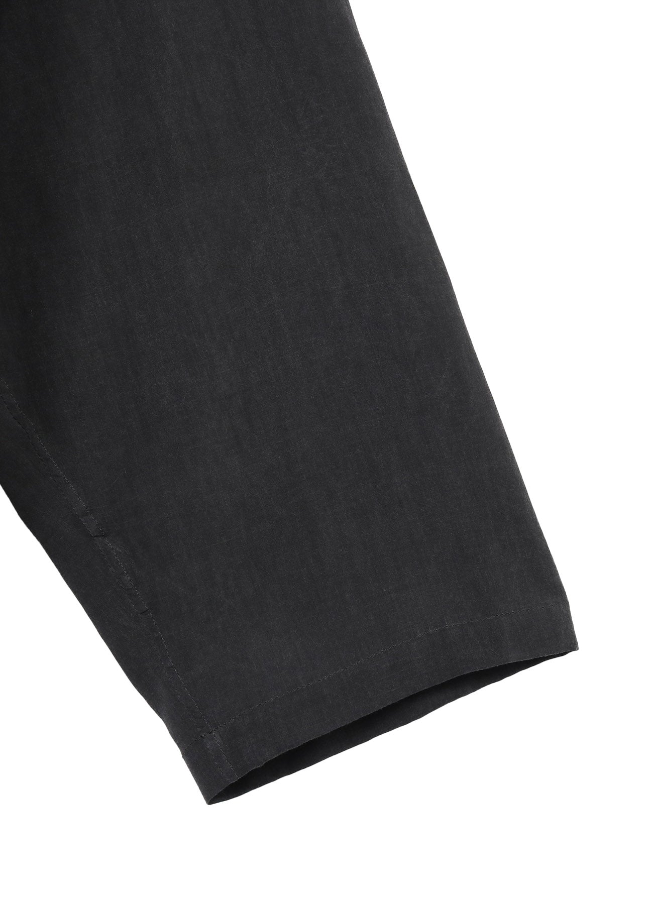 An asymmetric collar long blouse from Yohji Yamamoto POUR HOMME S/S 2026 Collection Look 28 was unveiled with a supple drapery and sheen, crafted from cellulose fabric. It features a vintage feel achieved through a one-sided washout pigment coating and a washer process, creating a worn aging look.