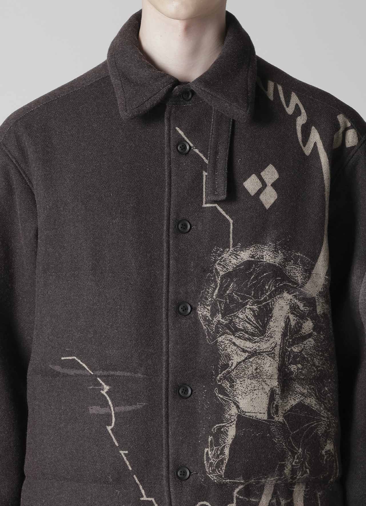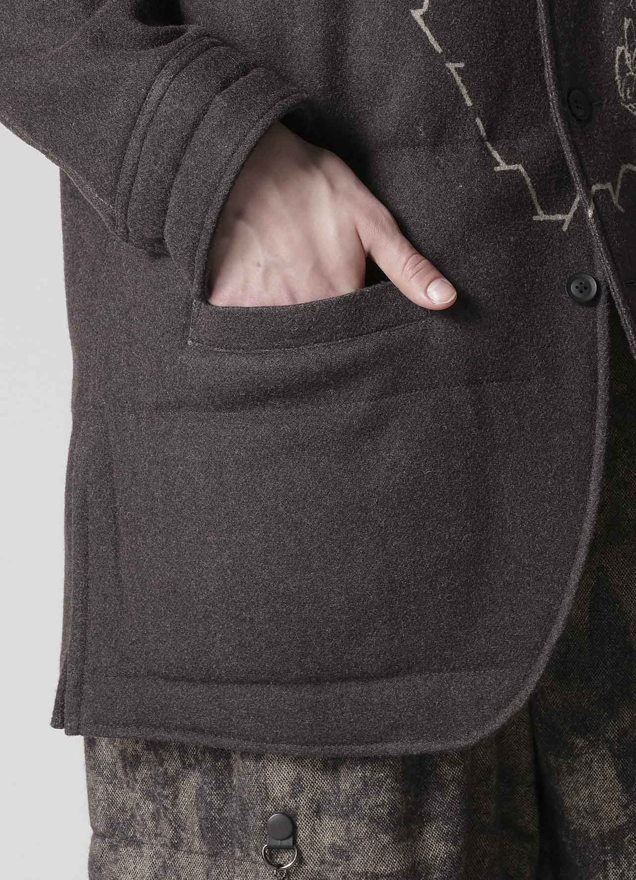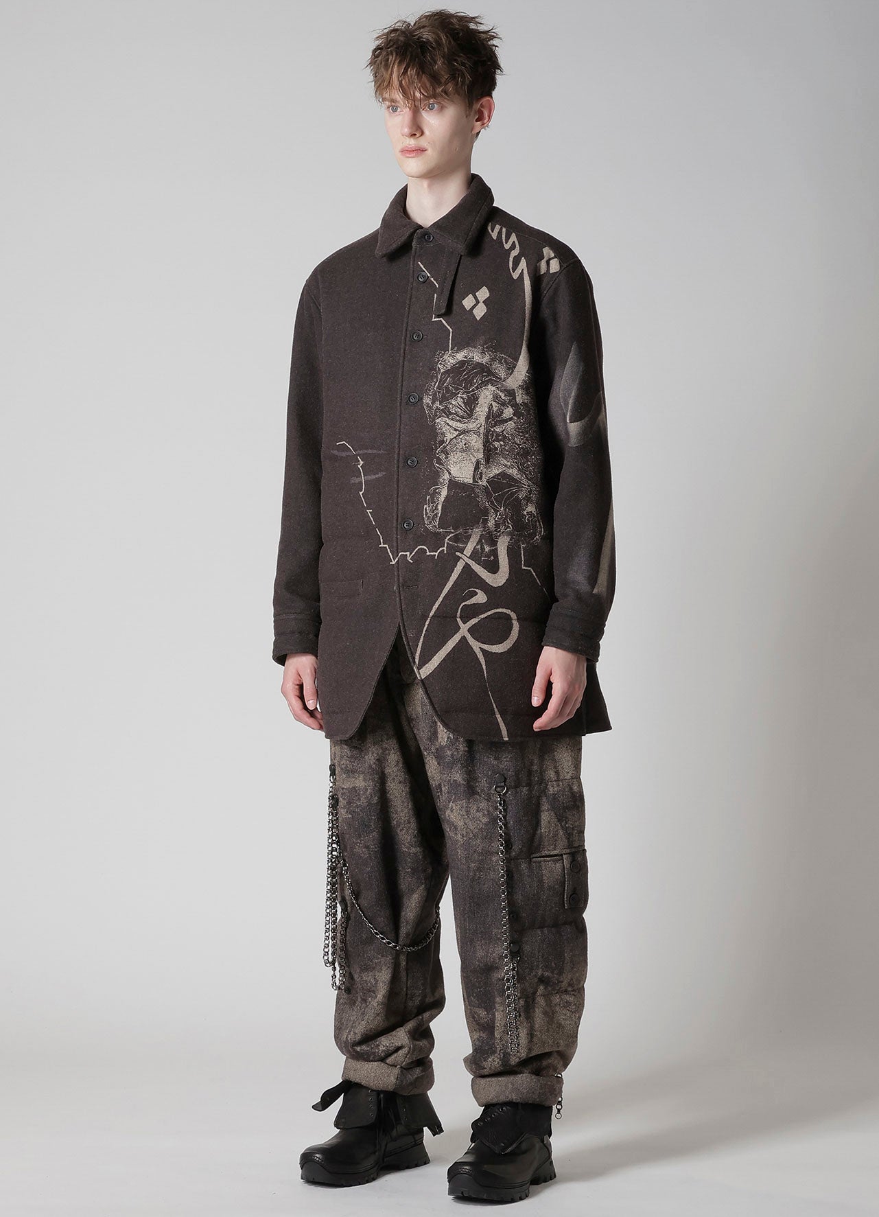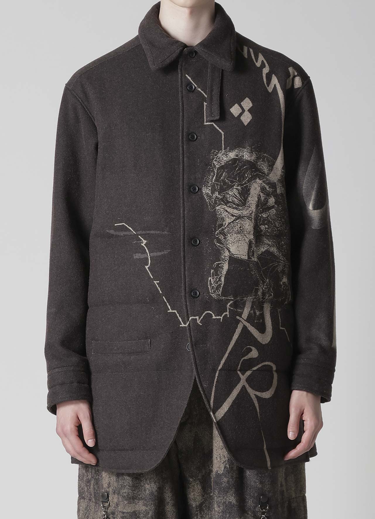 Ce chemisier matelassé saisissant de la collection Yohji Yamamoto POUR HOMME A/W 2025-26 marie la laine de Suffolk et de Mérinos pour une chaleur et une sensation luxuriante. Le design artistique du tissu est vibrant grâce à l'impression jet d'encre d'une usine de Kyoto, établissant un nouveau standard d'élégance pour la mode masculine.